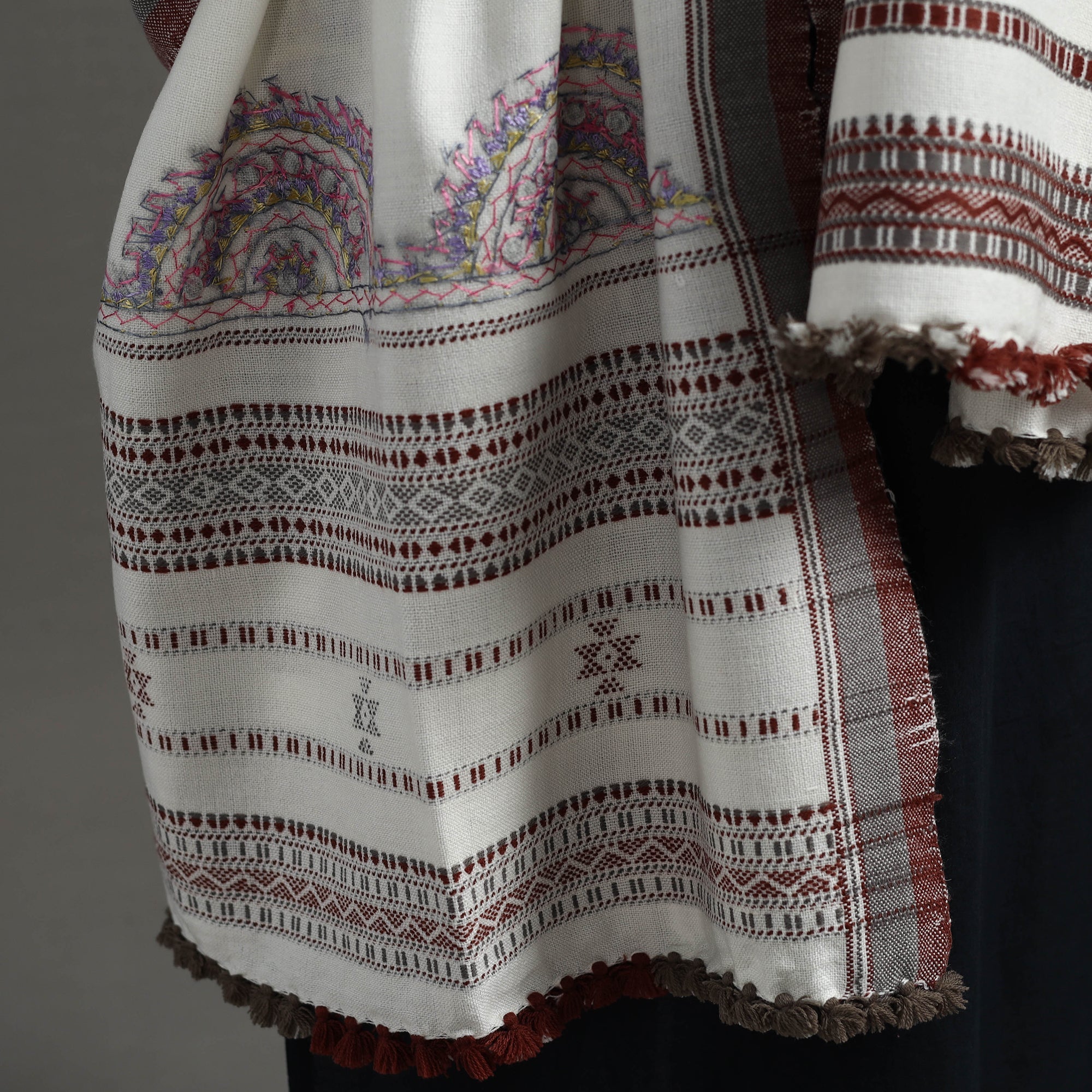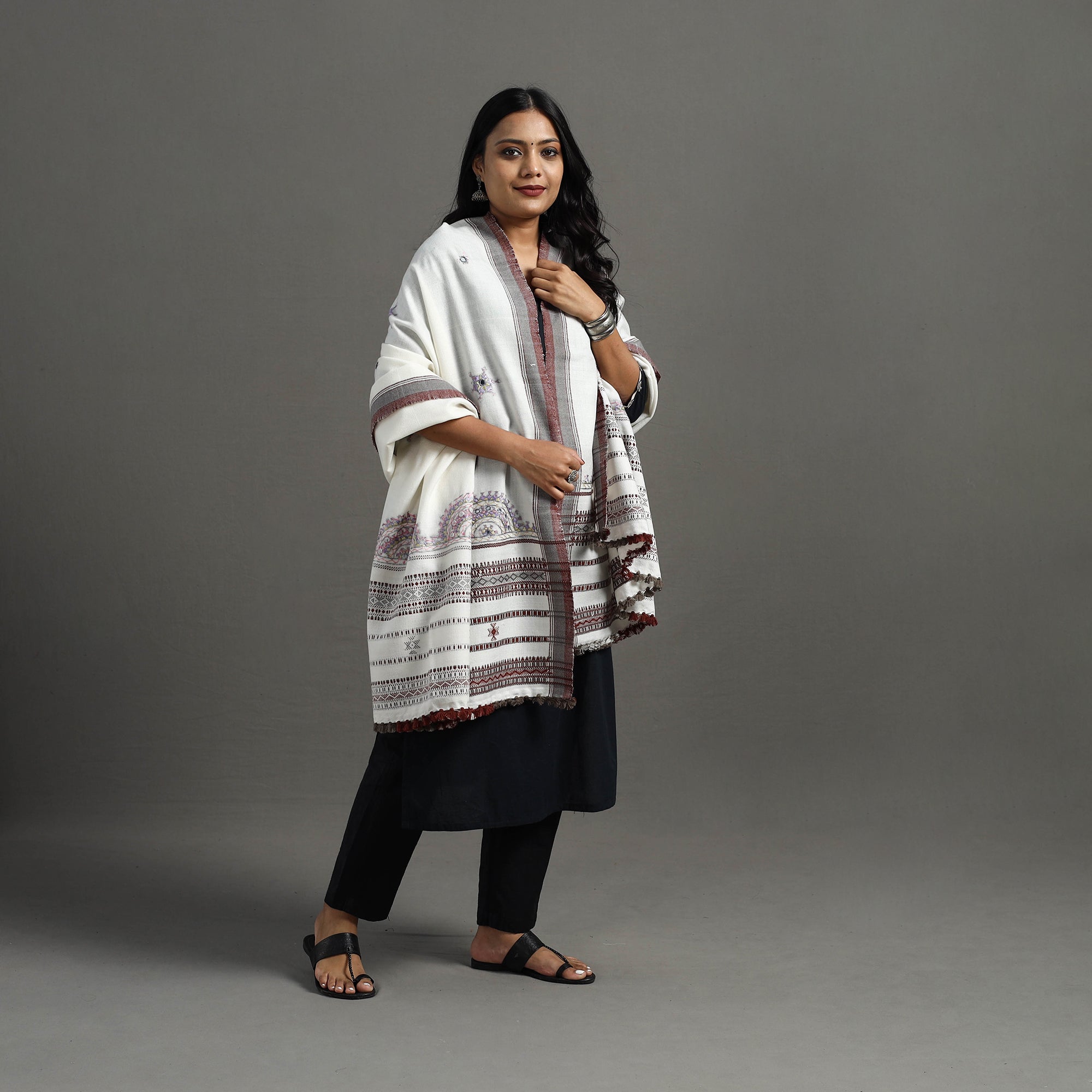 Kutch neran hand embroidery mirror work white woollen shawl. Crafted by artisans in Gujarat, this shawl features zari, mirror work and Kutchi weaving motifs. The acrylic wool ensures warmth and comfort