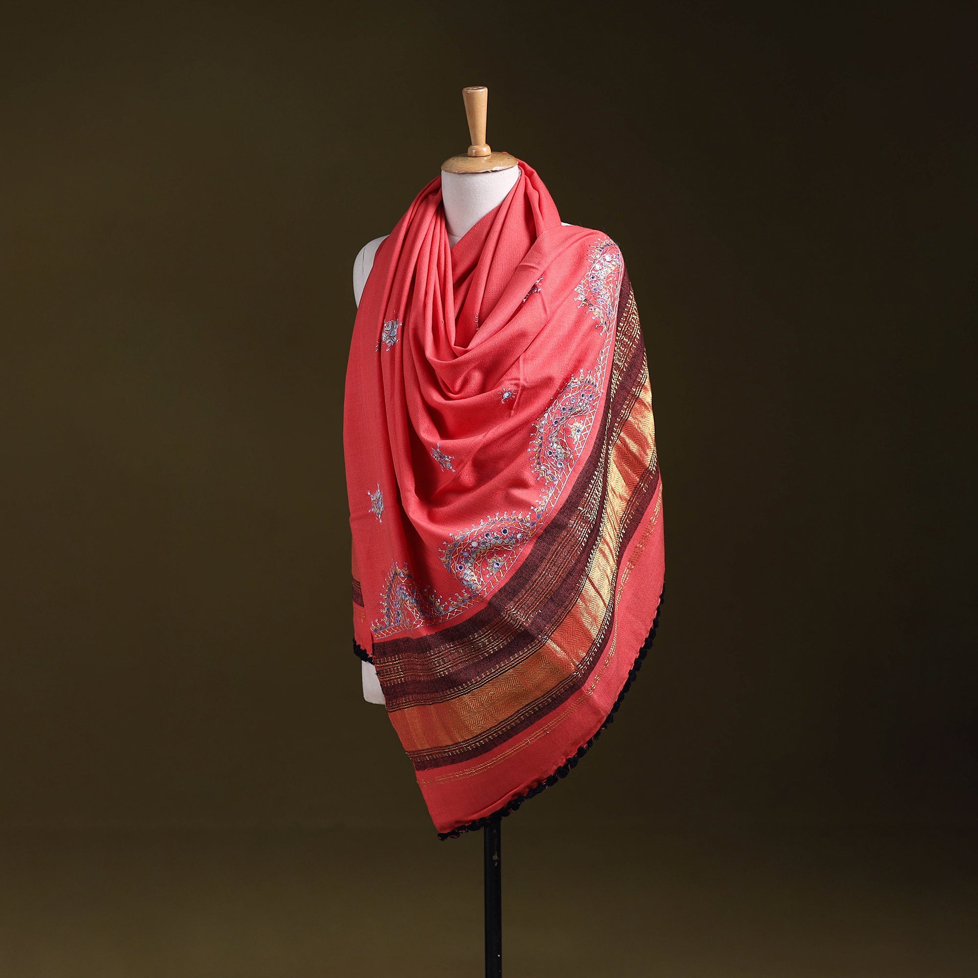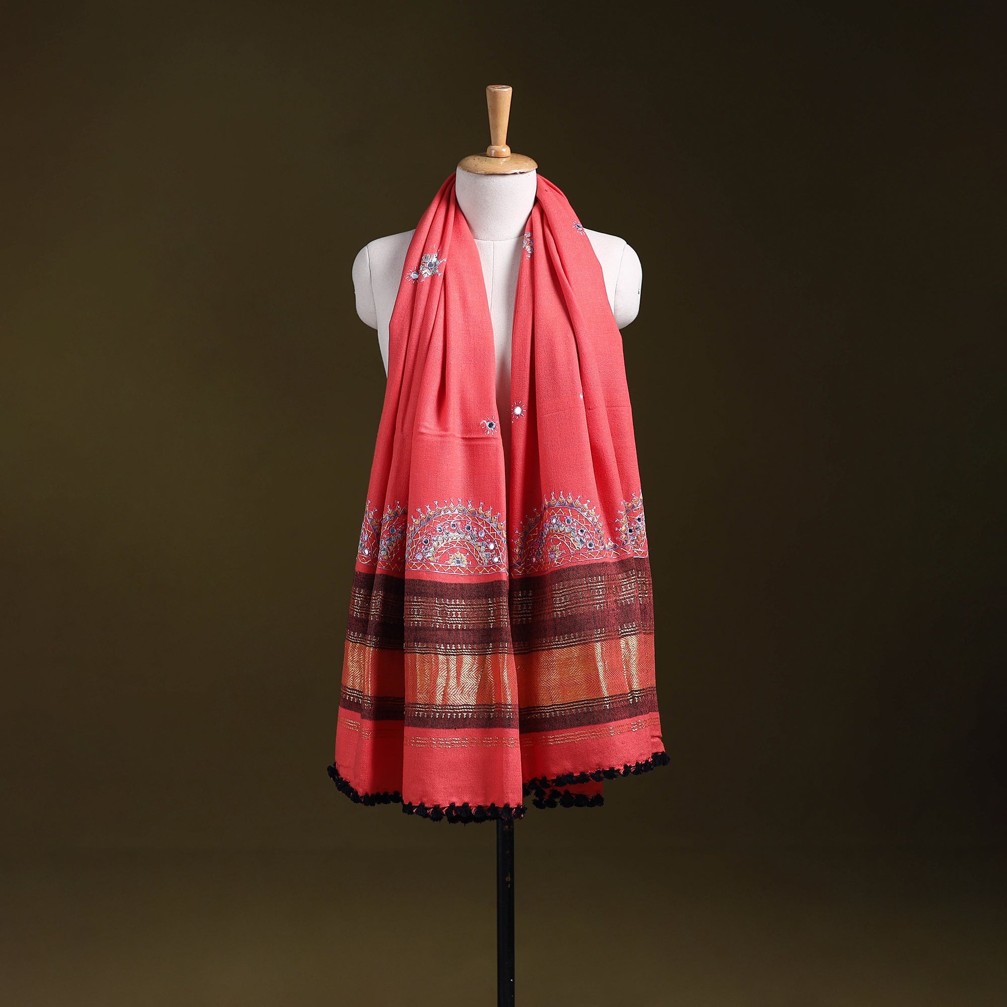 Pink - Kutch Neran Hand Embroidery Mirror Work Woollen Shawl 41