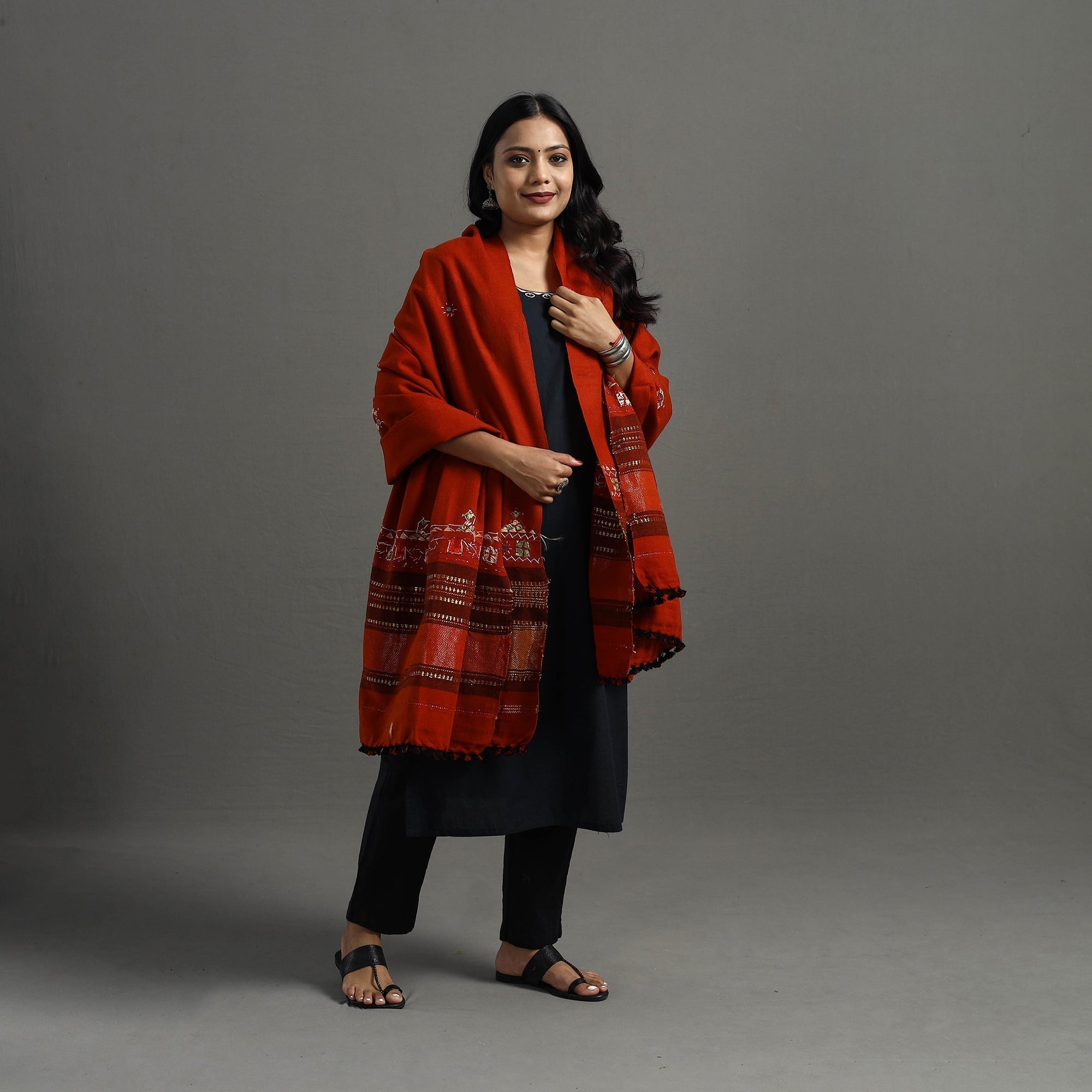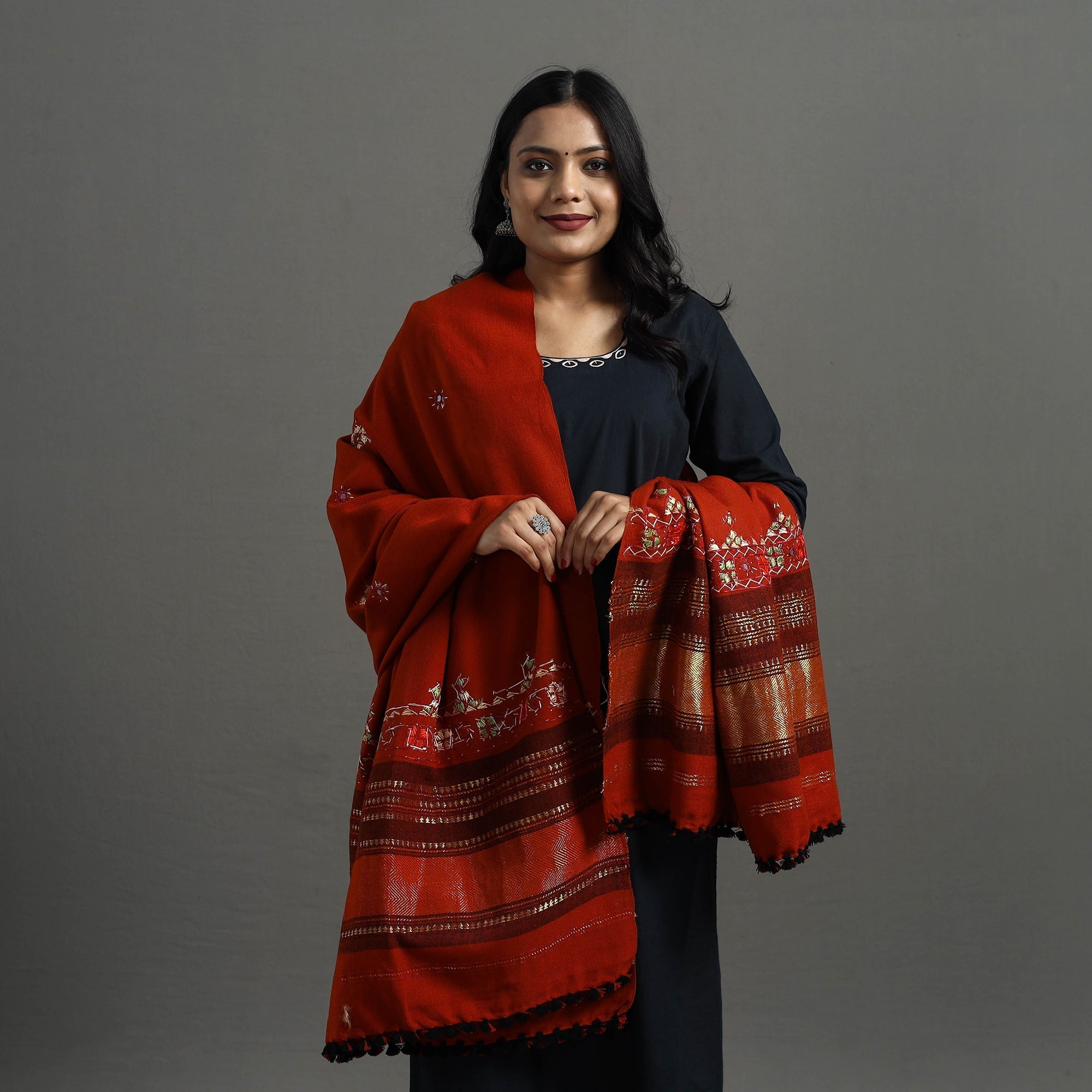 Kutch neran hand embroidery mirror work red woollen shawl. Crafted by artisans in Gujarat, this shawl features zari, mirror work and Kutchi weaving motifs. The acrylic wool ensures warmth and comfort