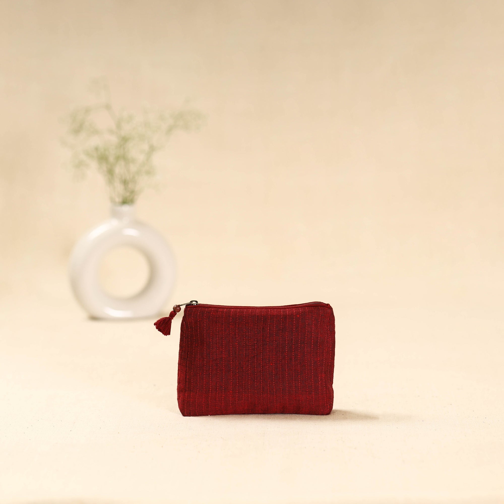 This red cotton cosmetic pouch features pakko neran hand embroidery from Kutch, known for its intricate eye-shaped motifs outlined in deep hues, filled with vibrant colours, and adorned with tiny mirrors. Crafted by the Sodha and Jadeja communities, it beautifully blends traditional artistry with modern design. Perfect for storing makeup and other daily essentials.