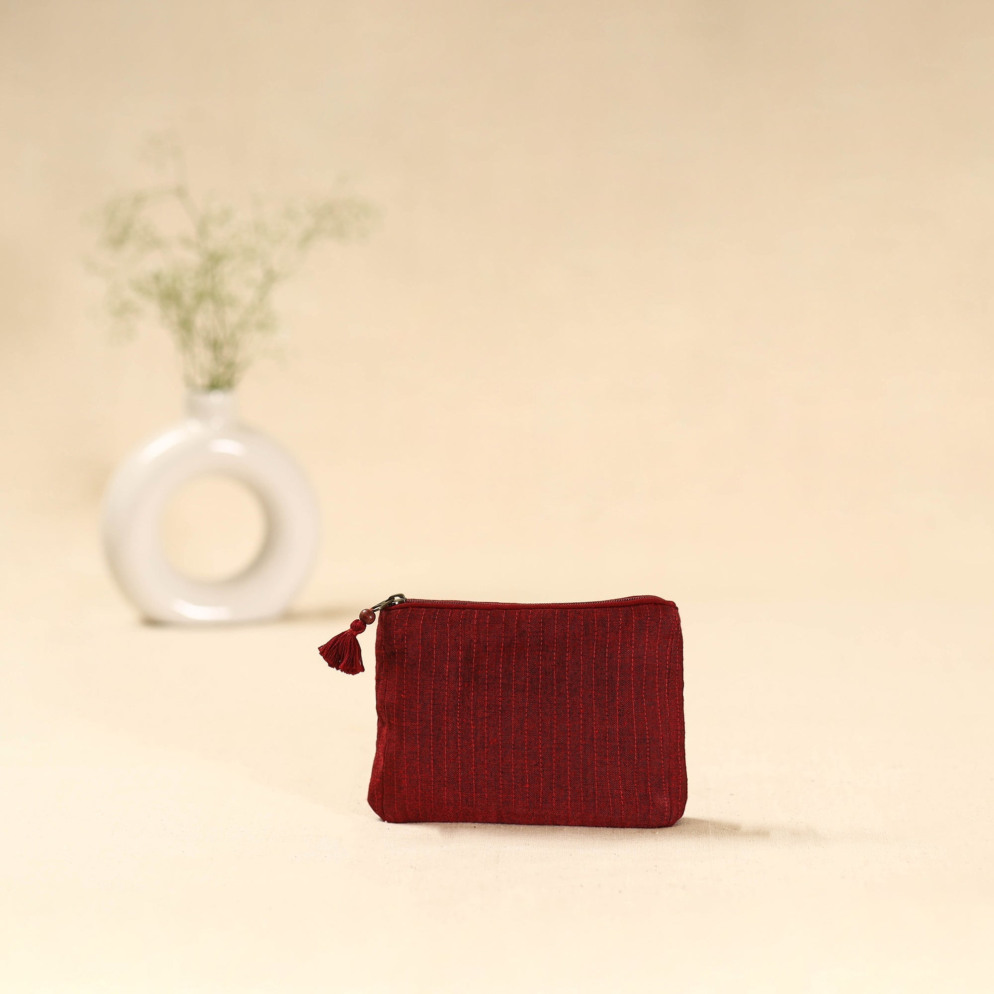 This red cotton cosmetic pouch features pakko neran hand embroidery from Kutch, known for its intricate eye-shaped motifs outlined in deep hues, filled with vibrant colours, and adorned with tiny mirrors. Crafted by the Sodha and Jadeja communities, it beautifully blends traditional artistry with modern design. Perfect for storing makeup and other daily essentials.