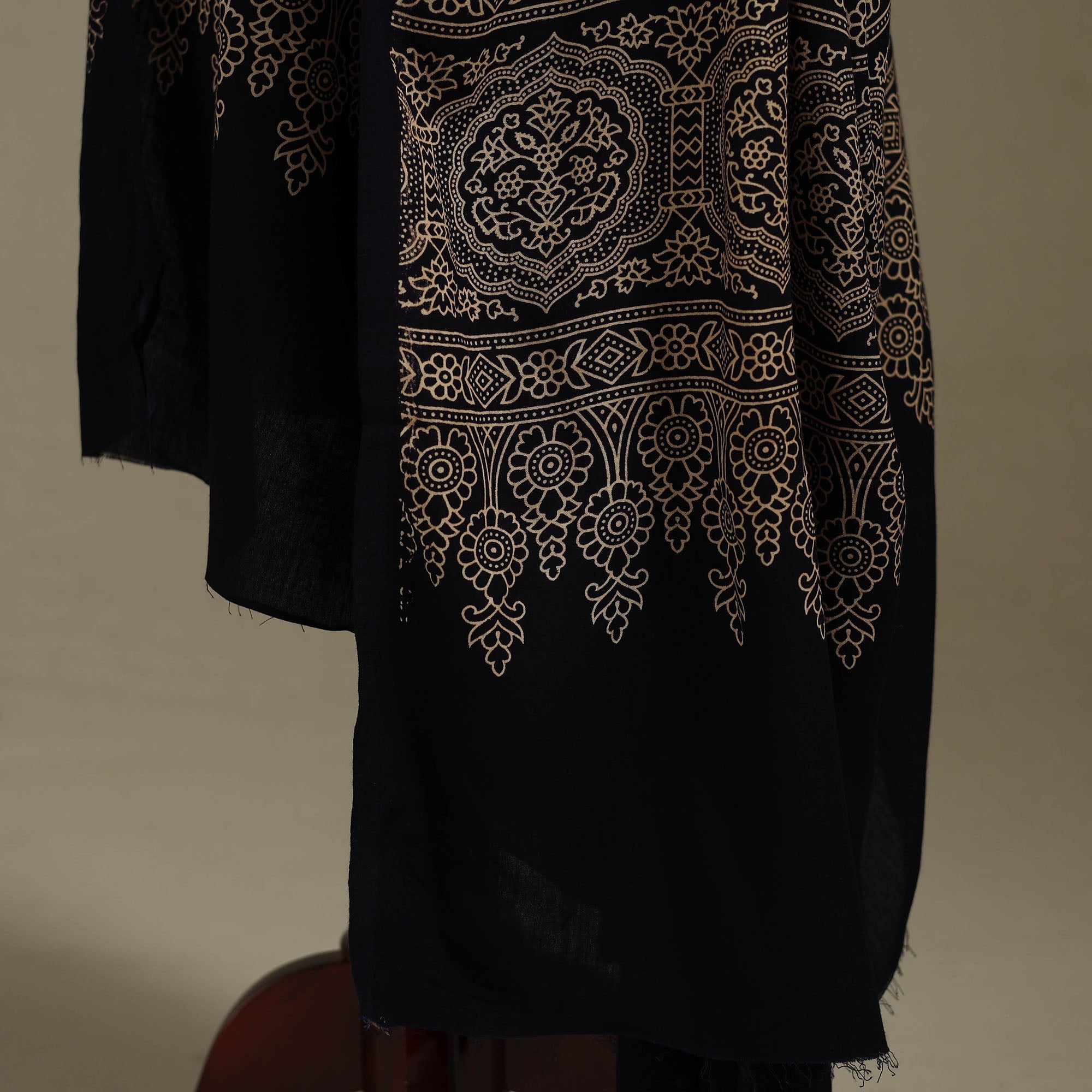 This screen printed dupatta with motifs inspired by the traditions of Gujarat’s Kutch region. Made from rayon fabric, it has a smooth, lustrous texture that feels elegant to wear. It drapes beautifully and suits all seasons. Style it with kurtas, flared skirts or salwar suits. A versatile dupatta suited for festive and cultural occasions.