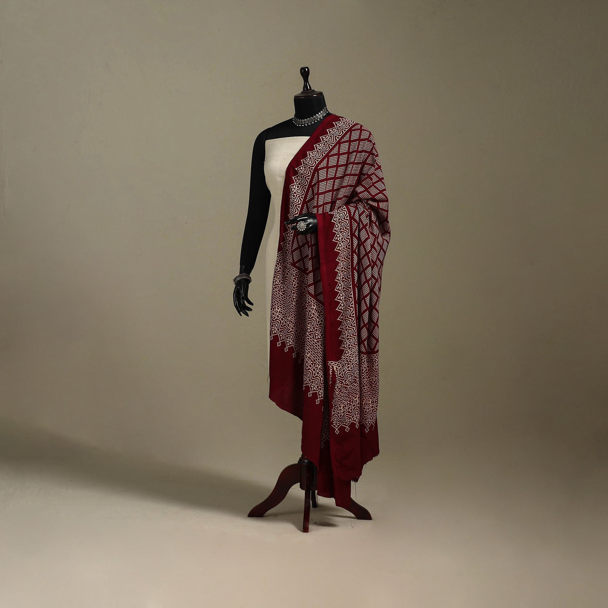 | Material | This maroon screen printed dupatta with motifs inspired by the traditions of Gujarat’s Kutch region. Made from rayon fabric, it has a smooth, lustrous texture that feels elegant to wear. It drapes beautifully and suits all seasons. Style it with kurtas, flared skirts or salwar suits. A versatile dupatta suited for festive and cultural occasions. |