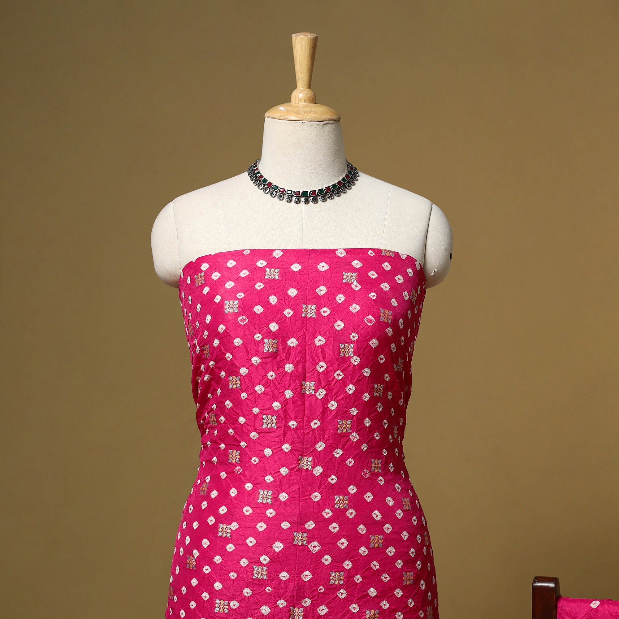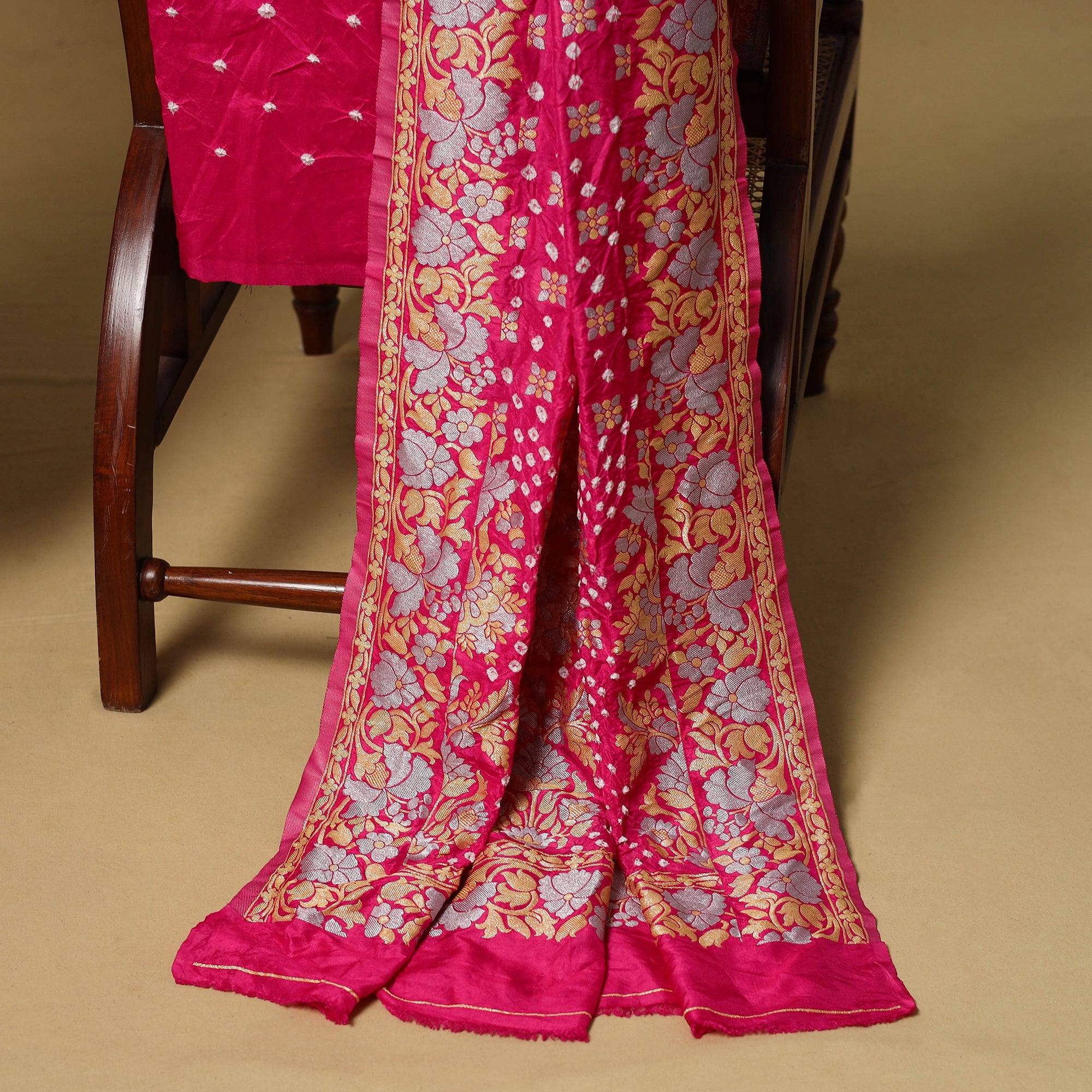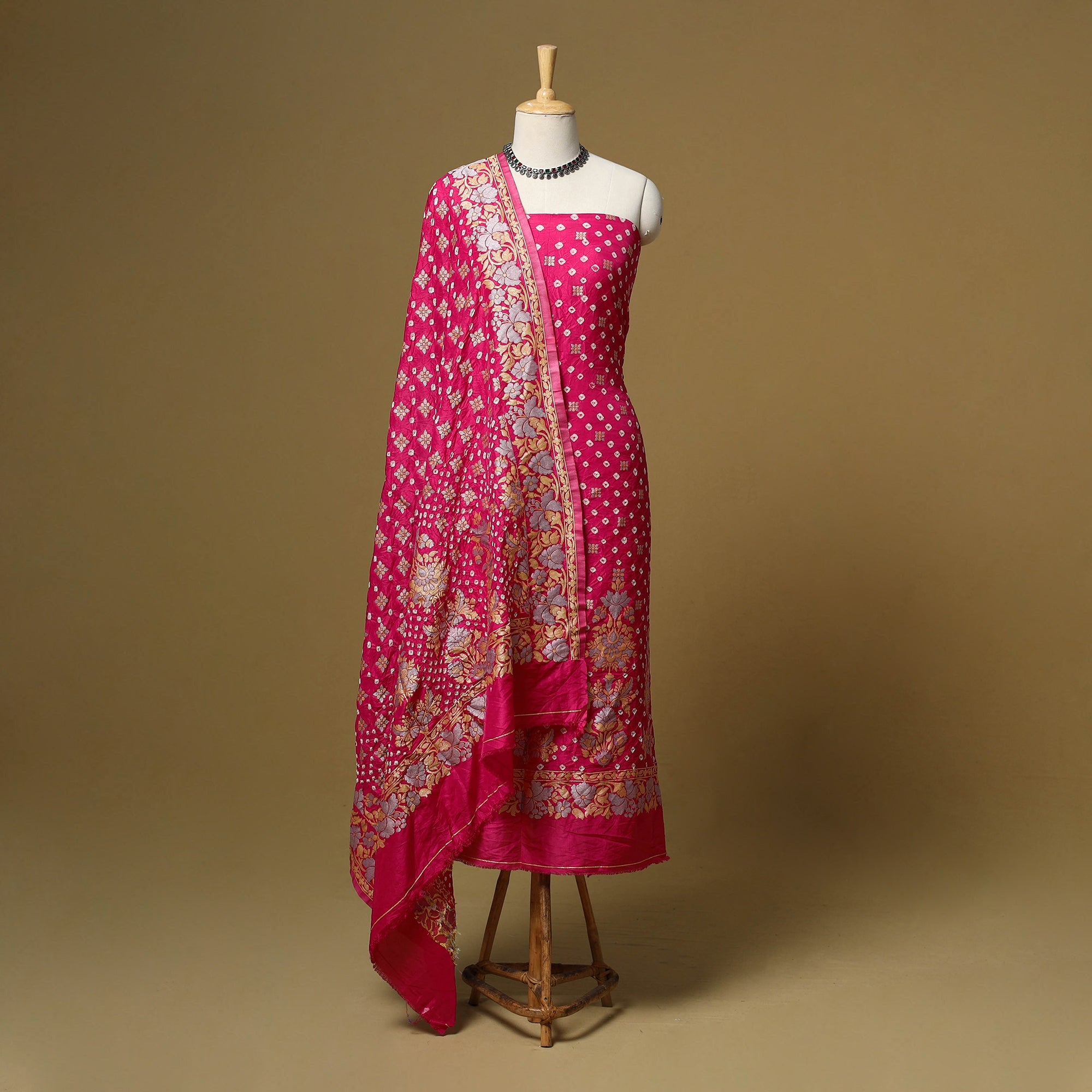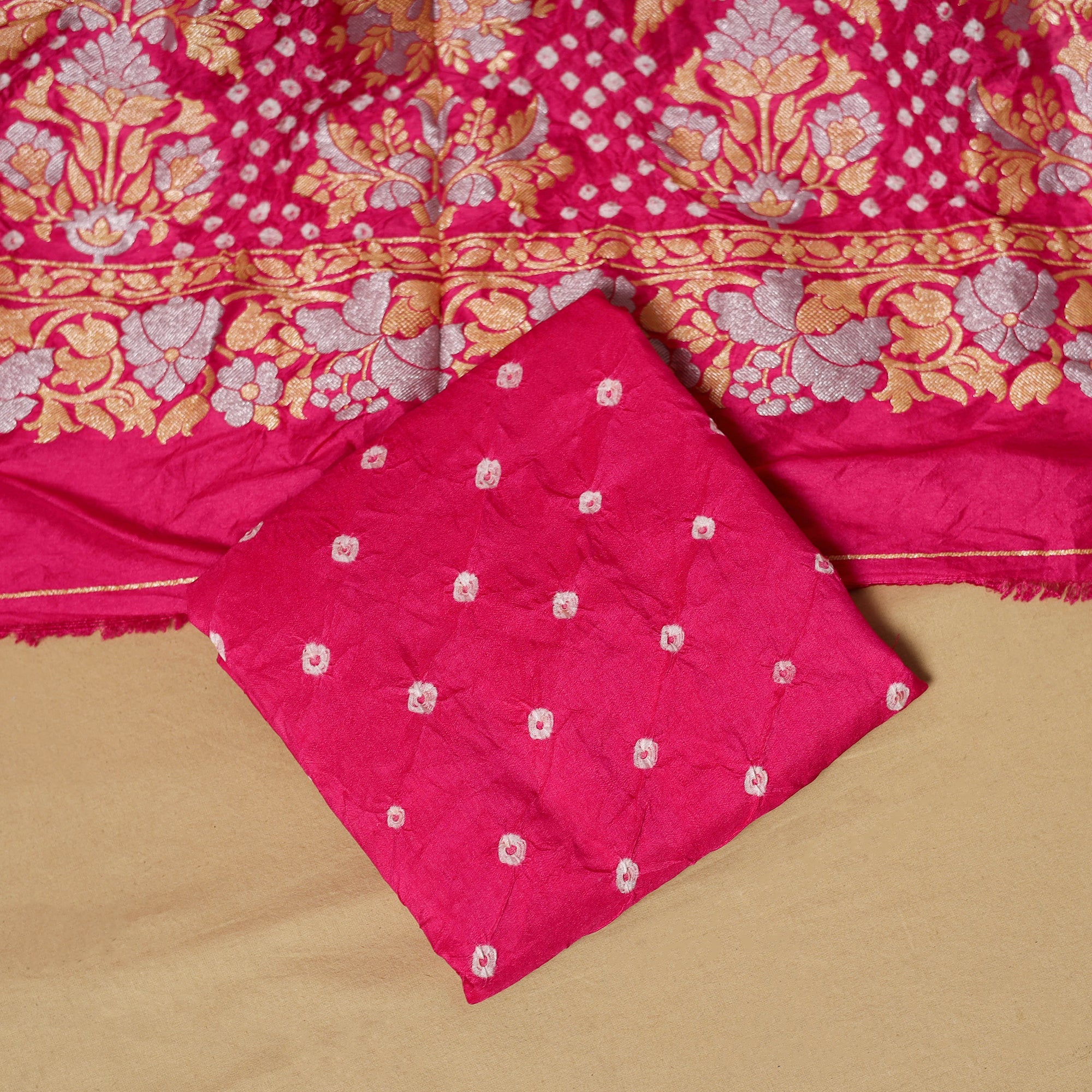 3pc bandhani dupion silk zari work dress material is crafted by the skilled artisans of Shabana Khatri from Kutch using the traditional tie & dye technique. Each fabric piece features bandhani patterns, enhanced with subtle zari detailing that adds a refined touch. The set includes fabric for a kurta, bottom and a dupatta. Suitable for festive occasions as well as refined everyday wear, it offers the freedom to stitch an outfit that reflects your personal style.