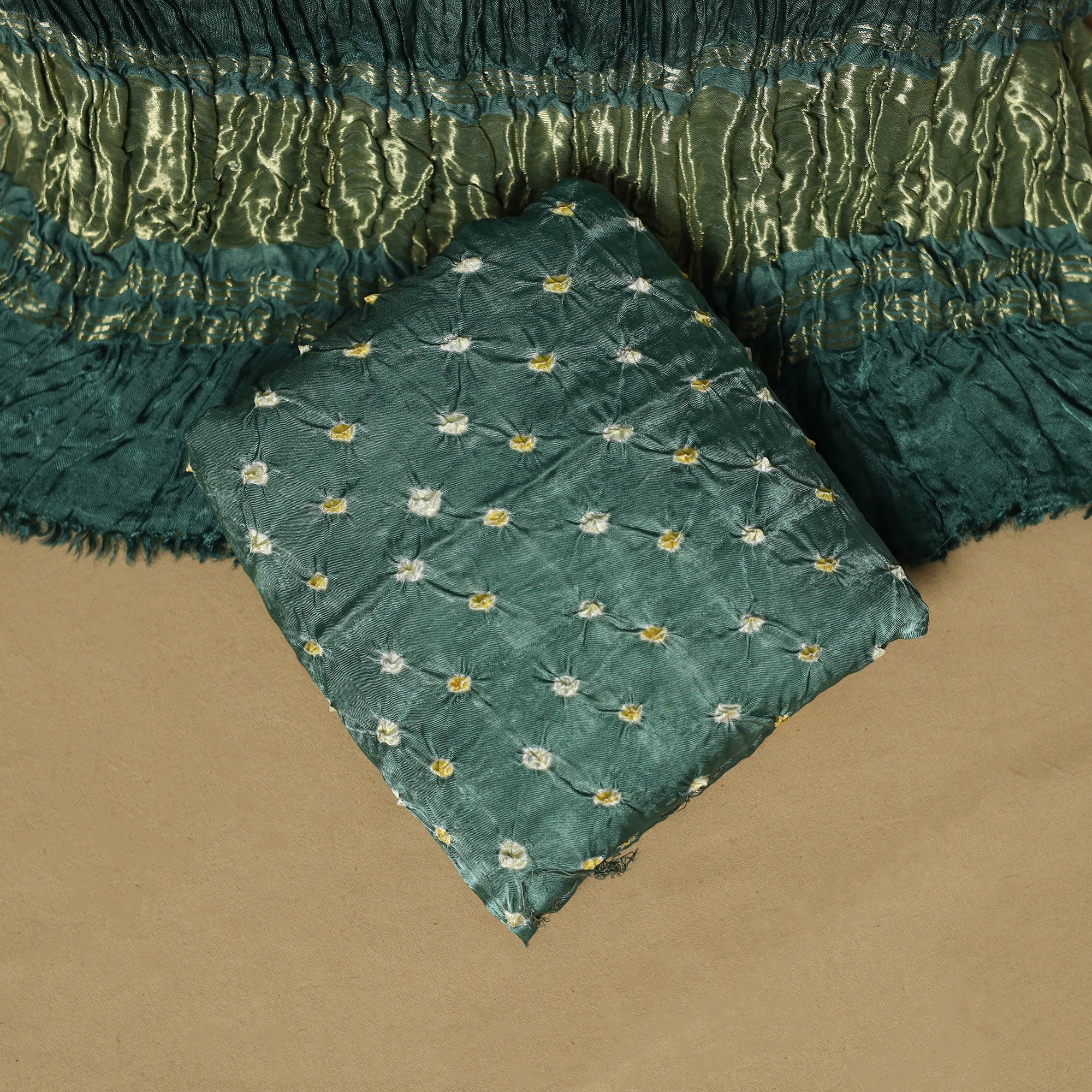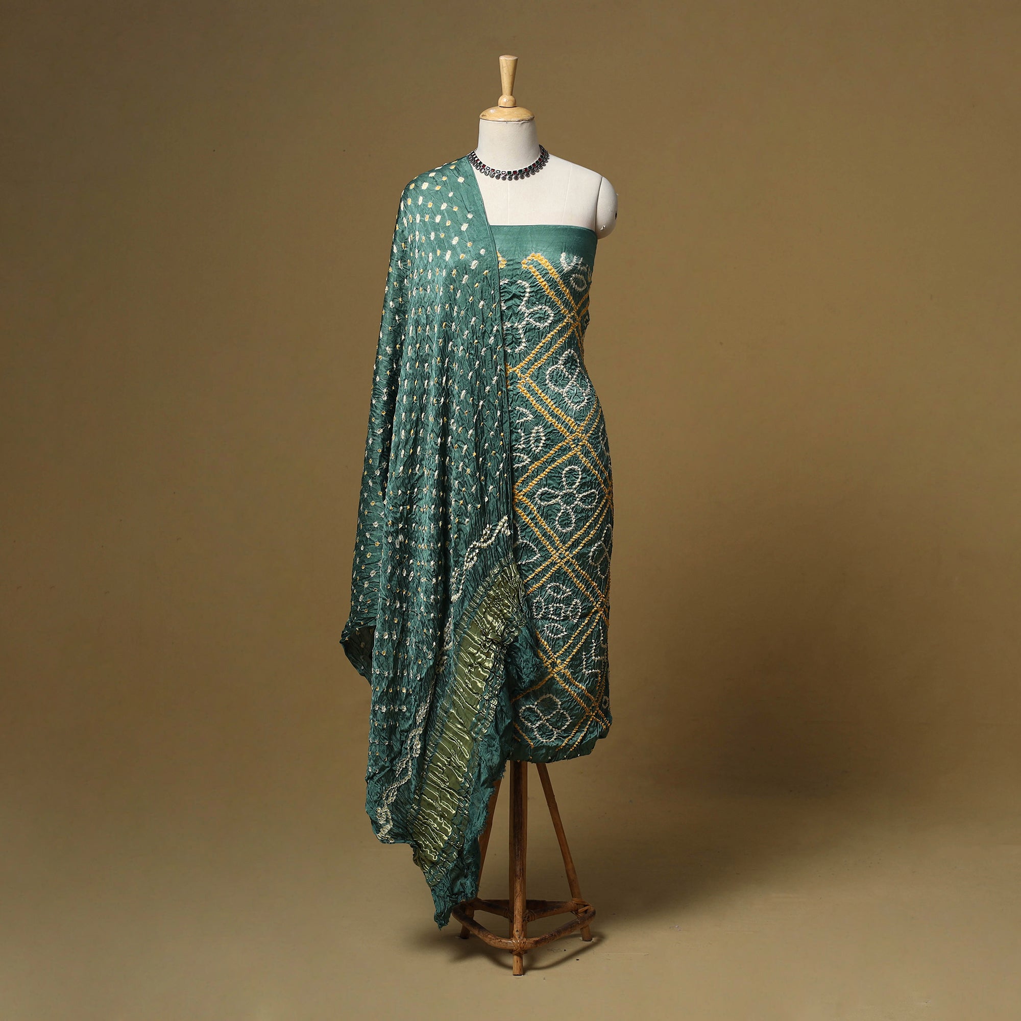 3pc bandhani modal silk dress material is crafted by the skilled artisans of Shabana Khatri from Kutch, using the traditional tie & dye technique. Each fabric piece features distinctive bandhani patterns. The set includes fabric for a kurta, bottom and a dupatta, finished with a lagdi patta pallu. Suitable for festive occasions as well as refined everyday wear, it offers the freedom to stitch an outfit that reflects your personal style.