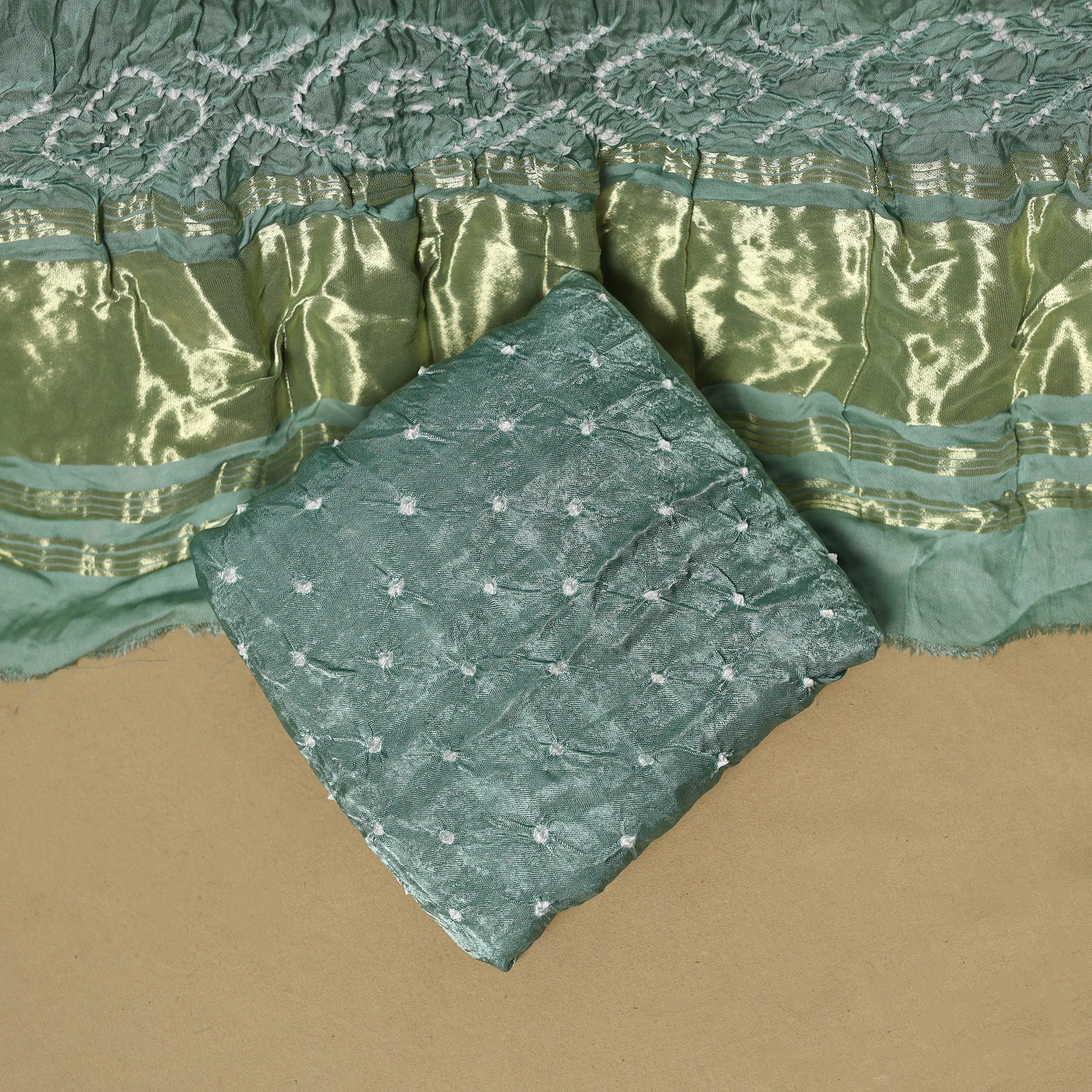 3pc bandhani modal silk dress material is crafted by the skilled artisans of Shabana Khatri from Kutch, using the traditional tie & dye technique. Each fabric piece features distinctive bandhani patterns. The set includes fabric for a kurta, bottom and a dupatta, finished with a lagdi patta pallu. Suitable for festive occasions as well as refined everyday wear, it offers the freedom to stitch an outfit that reflects your personal style.