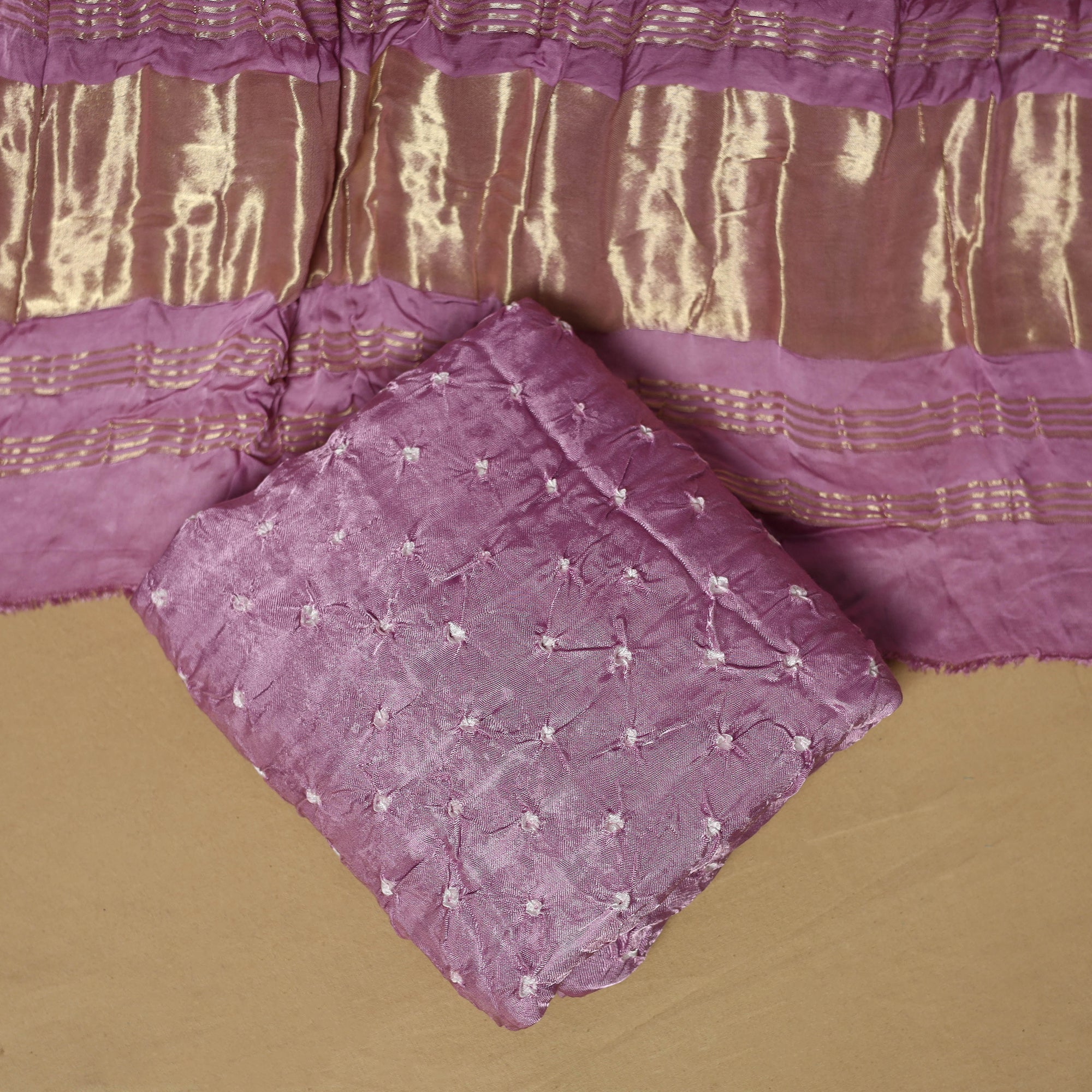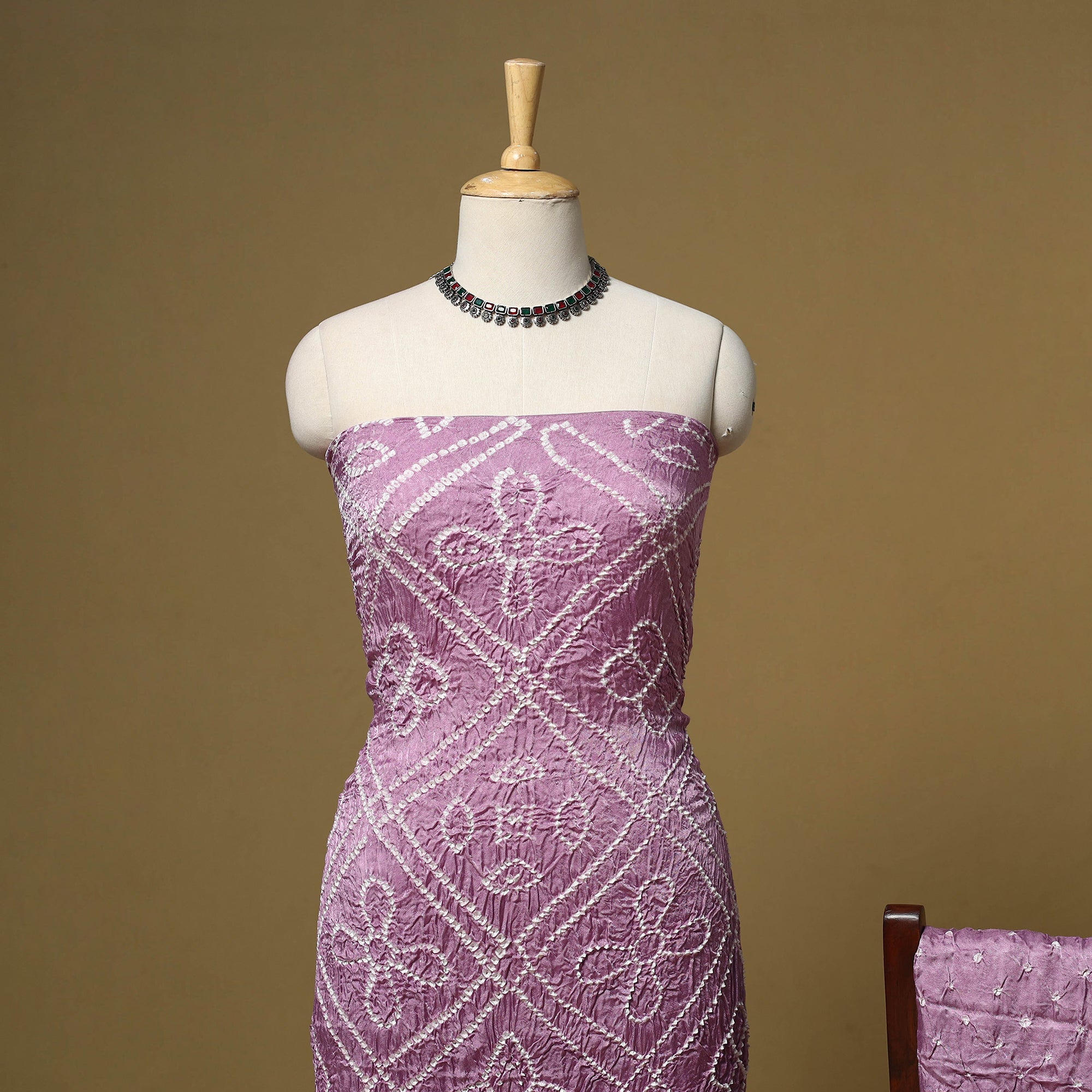 3pc bandhani modal silk dress material is crafted by the skilled artisans of Shabana Khatri from Kutch, using the traditional tie & dye technique. Each fabric piece features distinctive bandhani patterns. The set includes fabric for a kurta, bottom and a dupatta, finished with a lagdi patta pallu. Suitable for festive occasions as well as refined everyday wear, it offers the freedom to stitch an outfit that reflects your personal style.