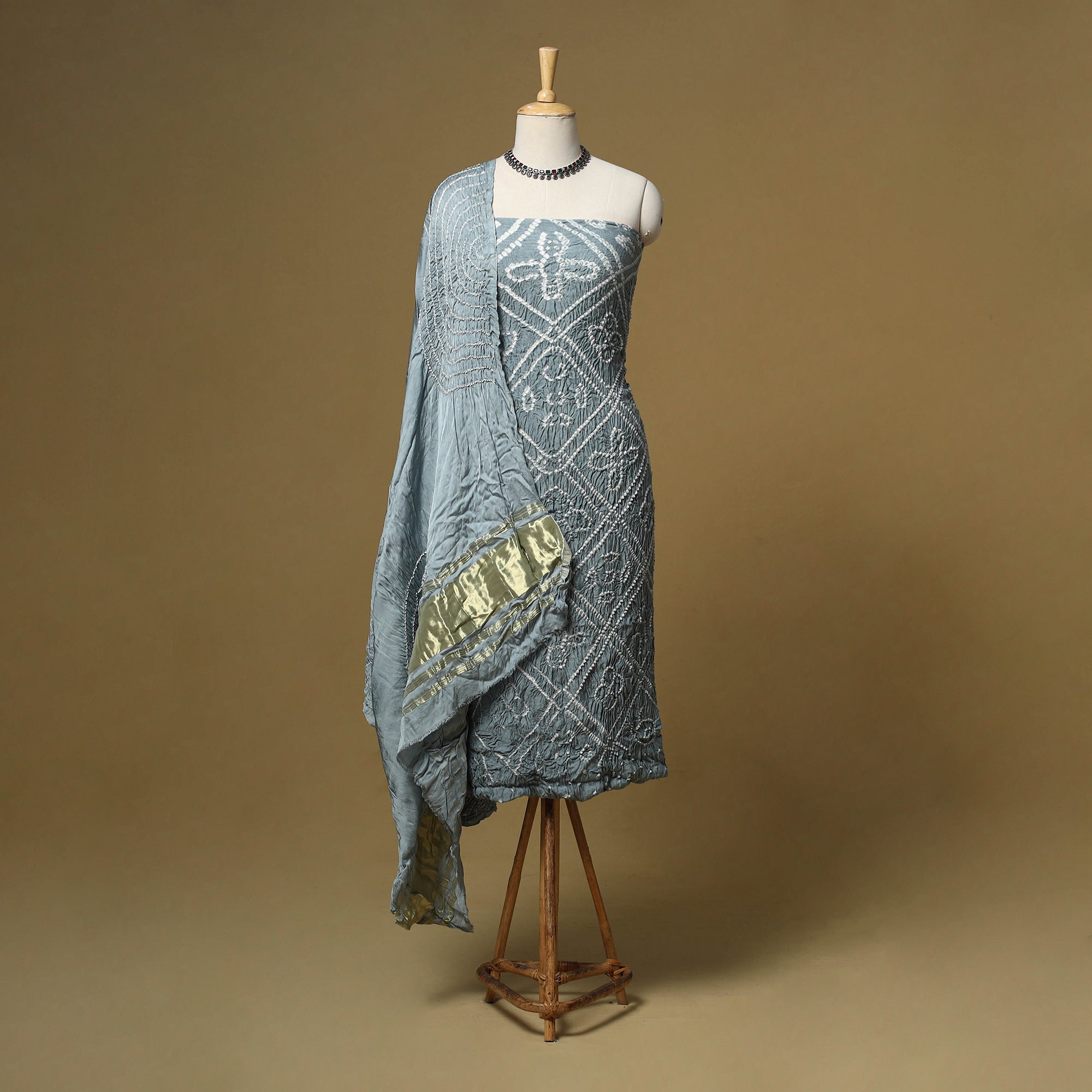 3pc bandhani modal silk dress material is crafted by the skilled artisans of Shabana Khatri from Kutch, using the traditional tie & dye technique. Each fabric piece features distinctive bandhani patterns. The set includes fabric for a kurta, bottom and a dupatta, finished with a lagdi patta pallu. Suitable for festive occasions as well as refined everyday wear, it offers the freedom to stitch an outfit that reflects your personal style.