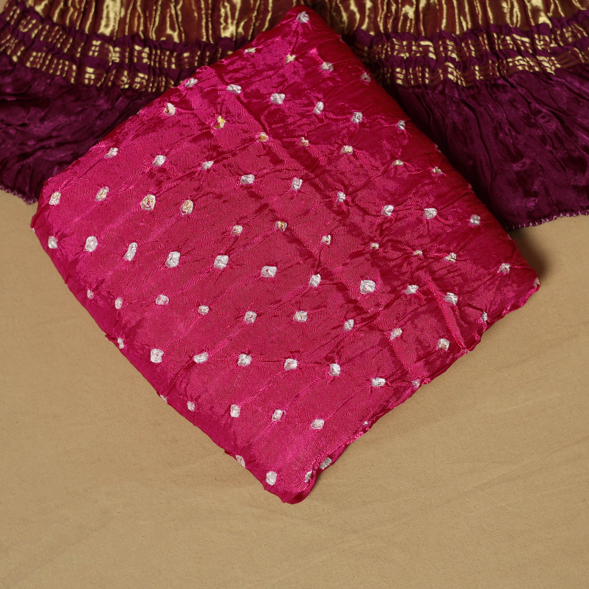 3pc bandhani modal silk dress material is crafted by the skilled artisans of Shabana Khatri from Kutch, using the traditional tie & dye technique. Each fabric piece features distinctive bandhani patterns. The set includes fabric for a kurta, bottom and a dupatta, finished with a lagdi patta pallu. Suitable for festive occasions as well as refined everyday wear, it offers the freedom to stitch an outfit that reflects your personal style.