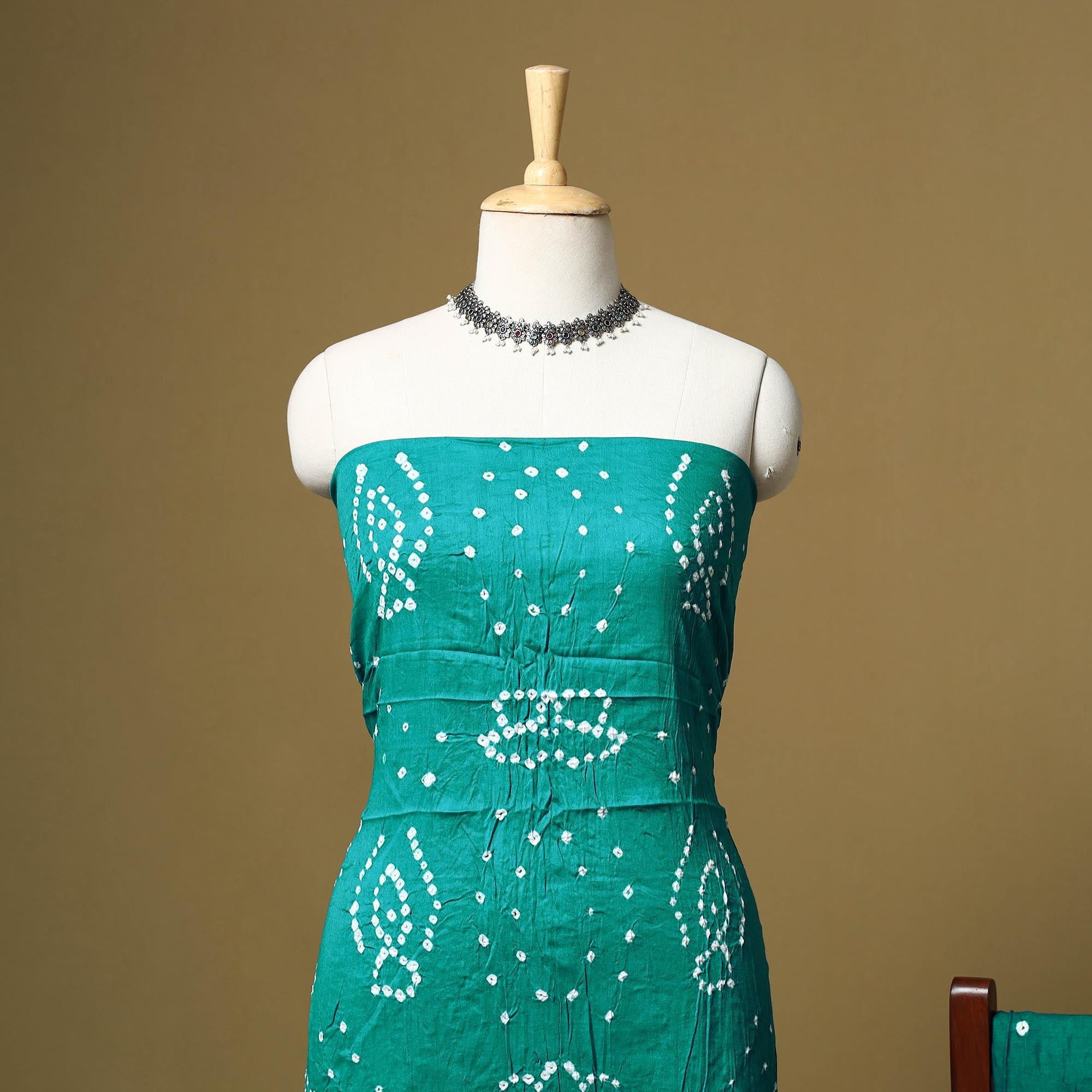 3pc satin cotton bandhani dress material is crafted by the skilled artisans of Shabana Khatri from Kutch. Created using the traditional tie & dye technique, each fabric piece features beautiful bandhani patterns. The set includes fabric for a kurta, bottom and dupatta, giving you the freedom to design your own outfit. Ideal for festive occasions or everyday wear, it adds a vibrant and traditional touch to your wardrobe.