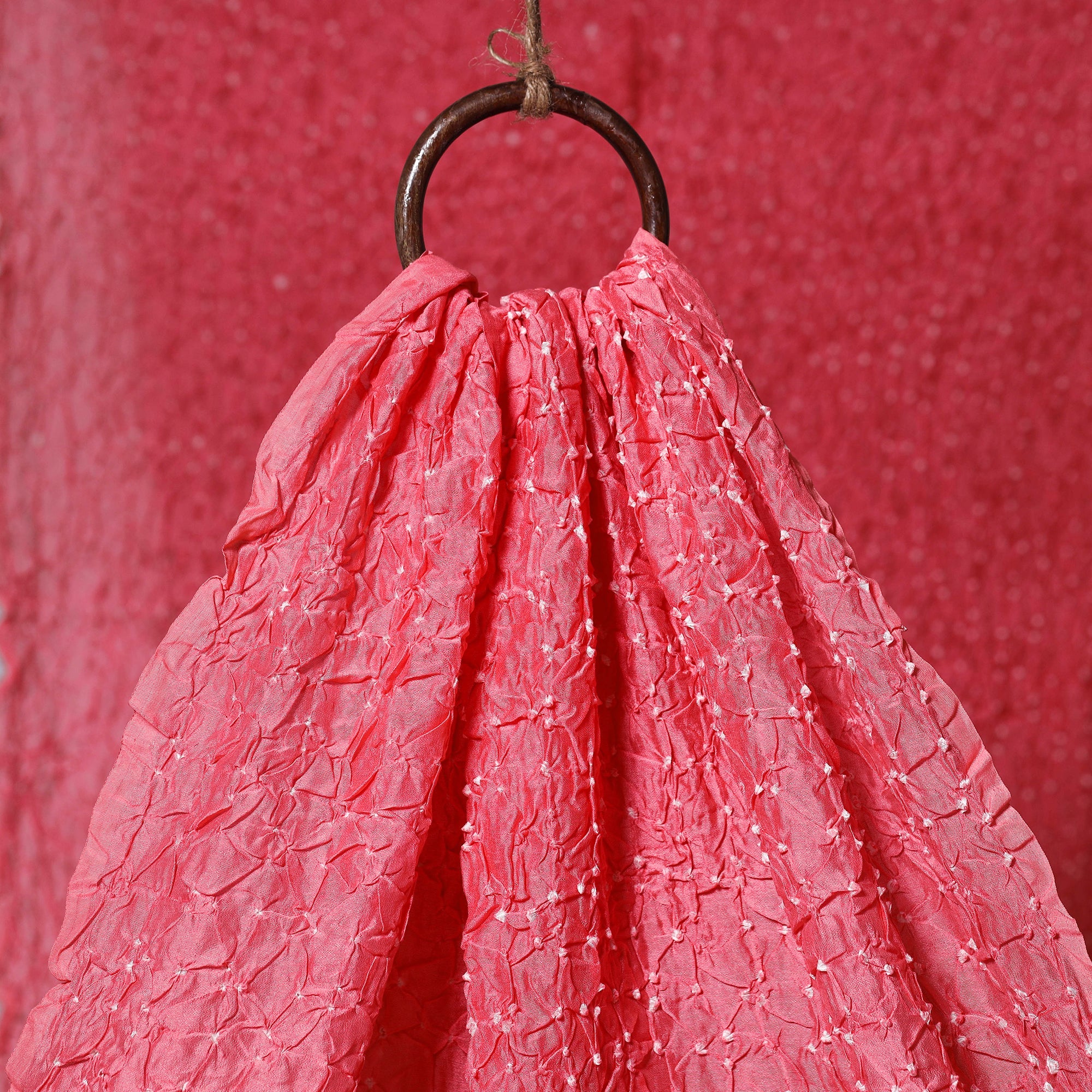 Pink bandhani chanderi silk cotton fabric showcases intricate patterns created using the traditional tie-and-dye technique practiced by the artisans of Kutch. The art of bandhani is a highly skilled process that involves tightly tying the fabric with threads at several points to form detailed designs. Known for its gossamer texture and elegant sheen, Chanderi silk adds a graceful touch to any creation. Ideal for making sarees, dupattas, kurtas, blouses, stoles, and more.
