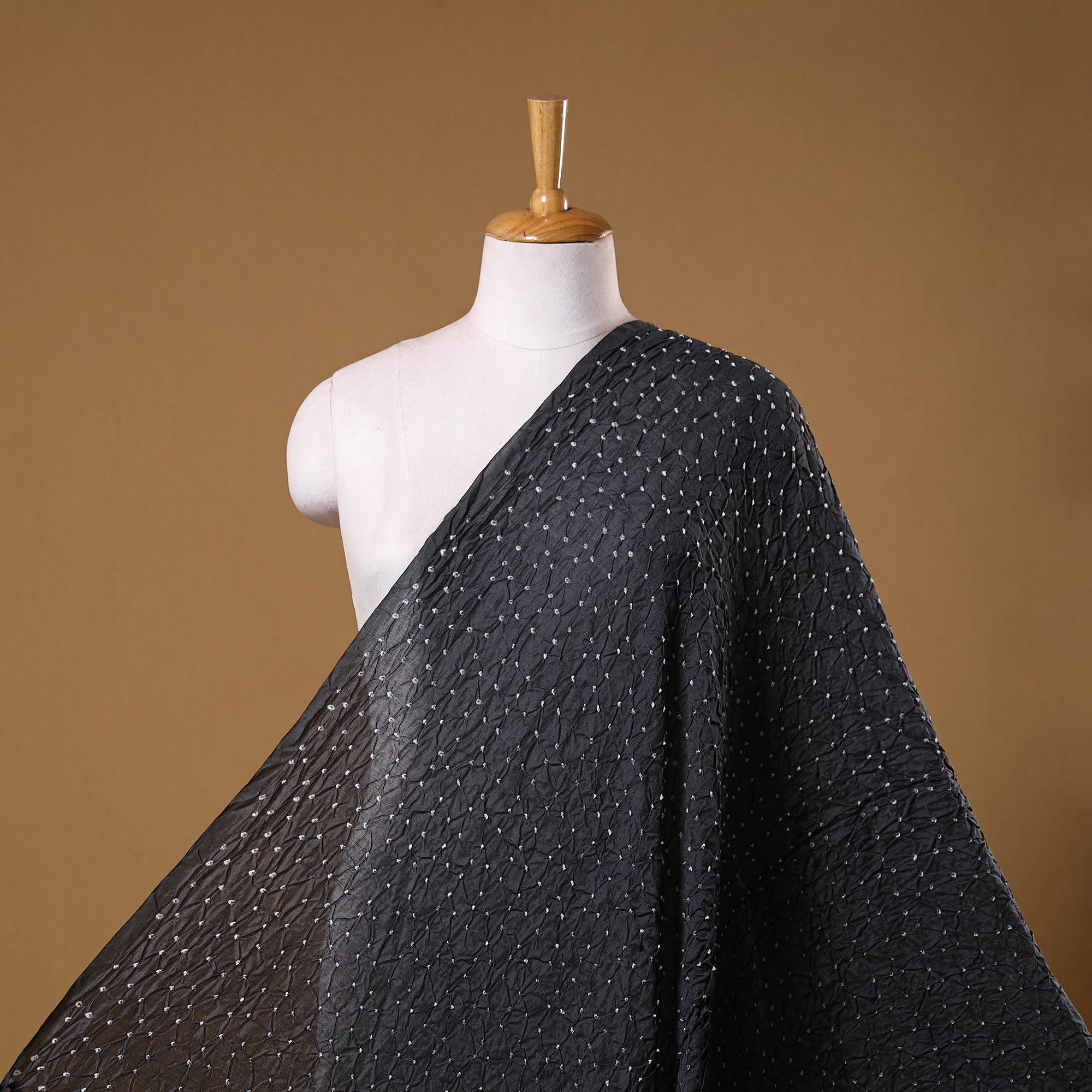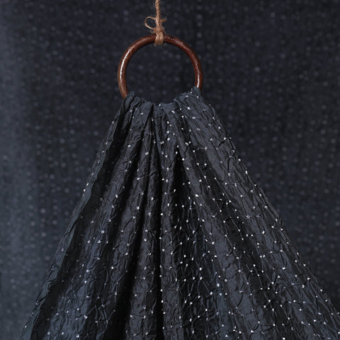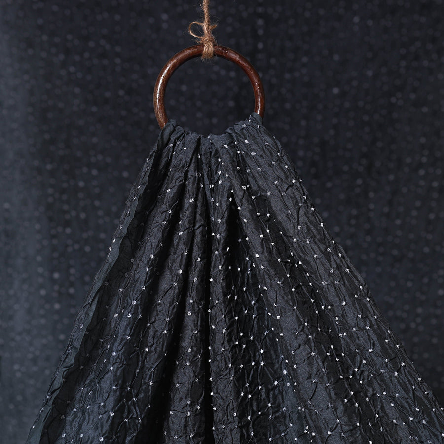 Black bandhani chanderi silk cotton fabric showcases intricate patterns created using the traditional tie-and-dye technique practiced by the artisans of Kutch. The art of bandhani is a highly skilled process that involves tightly tying the fabric with threads at several points to form detailed designs. Known for its gossamer texture and elegant sheen, Chanderi silk adds a graceful touch to any creation. Ideal for making sarees, dupattas, kurtas, blouses, stoles, and more.