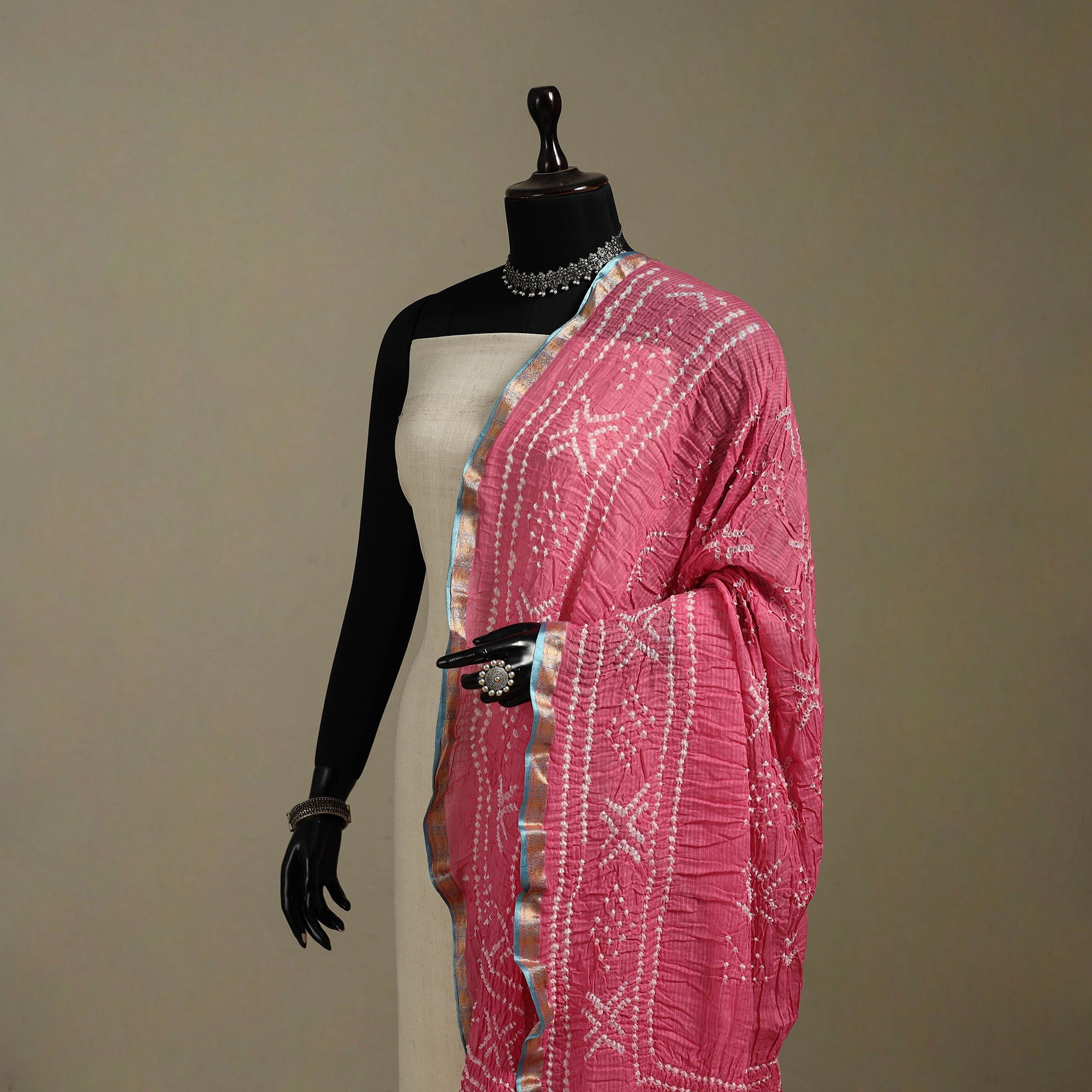 Pink bandhani dupatta reflects the textile tradition of Kutch and is created using the bandhej technique, where fabric is tied at multiple points and dyed to form detailed patterns. Made from cotton, it drapes beautifully and suits all seasons. Style it with kurtas, flared skirts or salwar suits. A versatile dupatta suited for festive and cultural occasions.