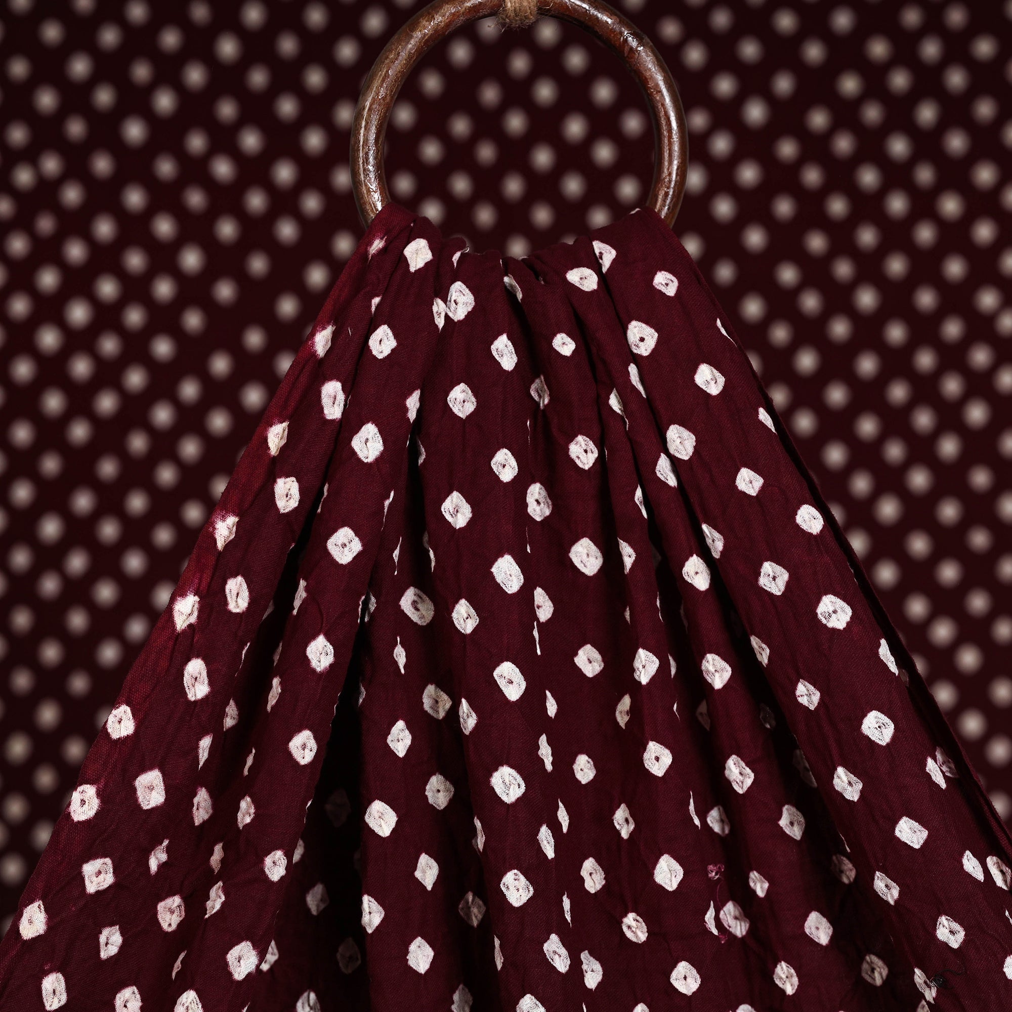 Maroon bandhani cotton fabric created using the traditional tie-dye technique by skilled artisans of Kutch. This art involves tightly tying the fabric with threads at multiple points before dyeing it, resulting in dotted bandhej motifs. Perfect for creating sarees, dupattas, kurtas, blouses, stoles and more.