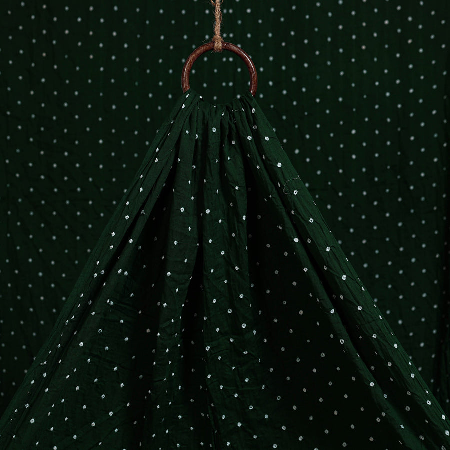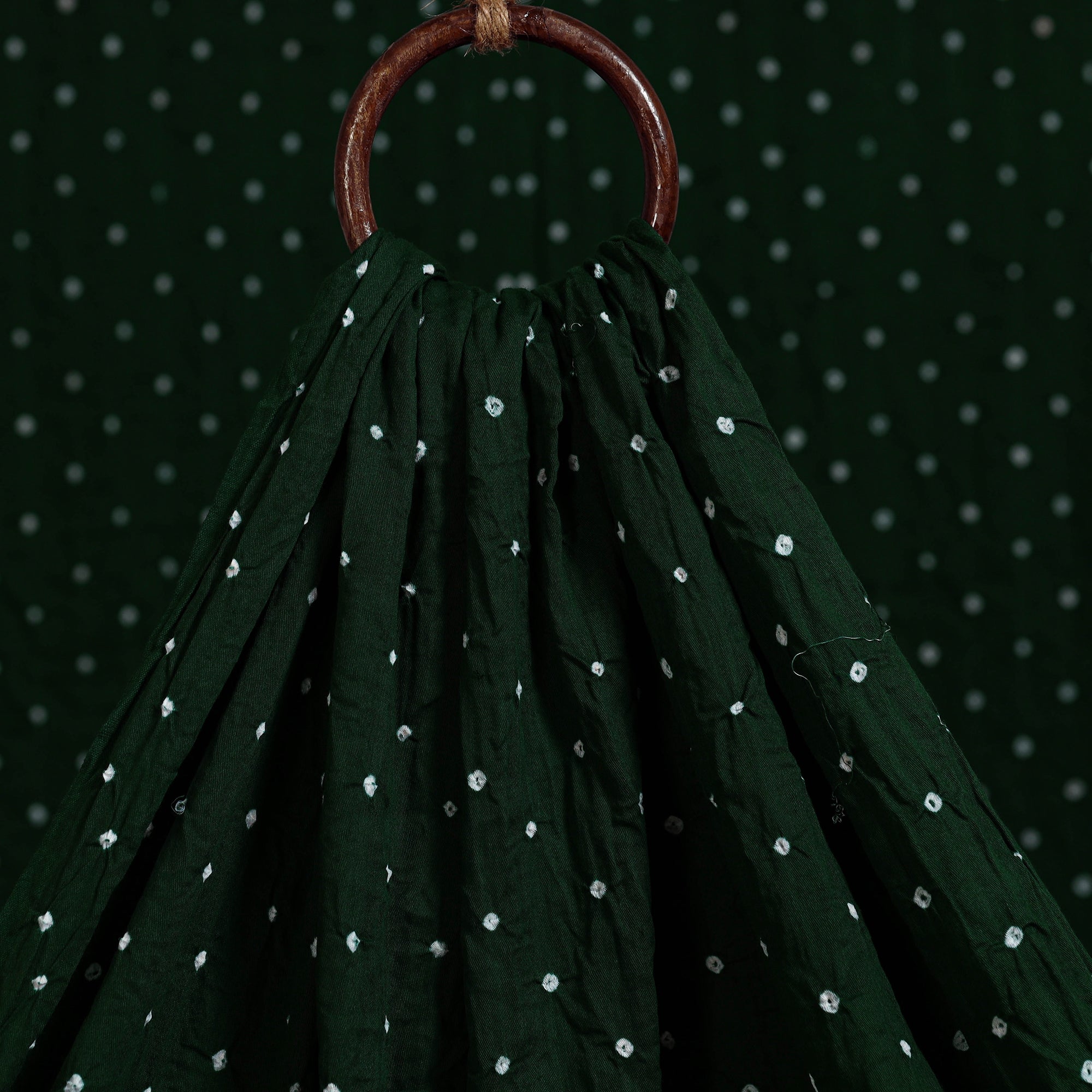 This green kutch bandhani tie-dye cotton fabric features a majestic bandhani pattern, hand-tied and dyed using the traditional technique practiced by the artisans of Kutch. The art of Bandhani is a highly skilled process that involves tightly tying fabric with threads at several points to create intricate patterns. This fine-quality fabric is a testament to the craftsmanship and rich cultural heritage of Kutch. Perfect for both clothing and home decor.