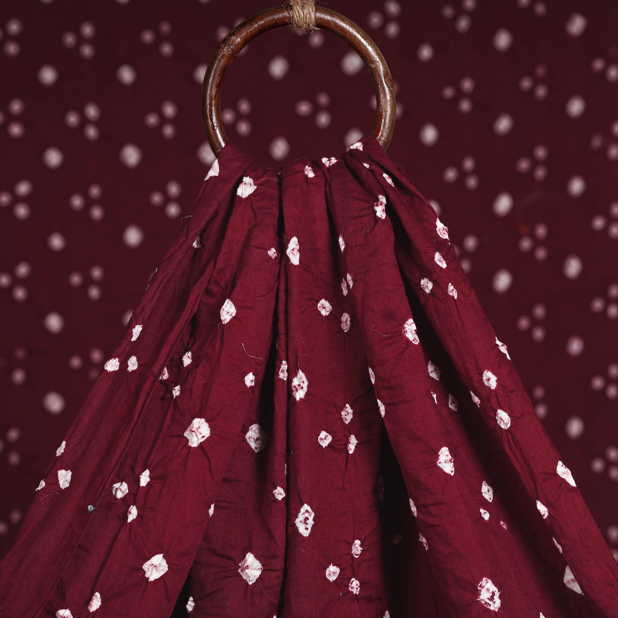 Maroon bandhani cotton fabric created using the traditional tie-dye technique by skilled artisans of Kutch. This art involves tightly tying the fabric with threads at multiple points before dyeing it, resulting in dotted bandhej motifs. Perfect for creating sarees, dupattas, kurtas, blouses, stoles and more.