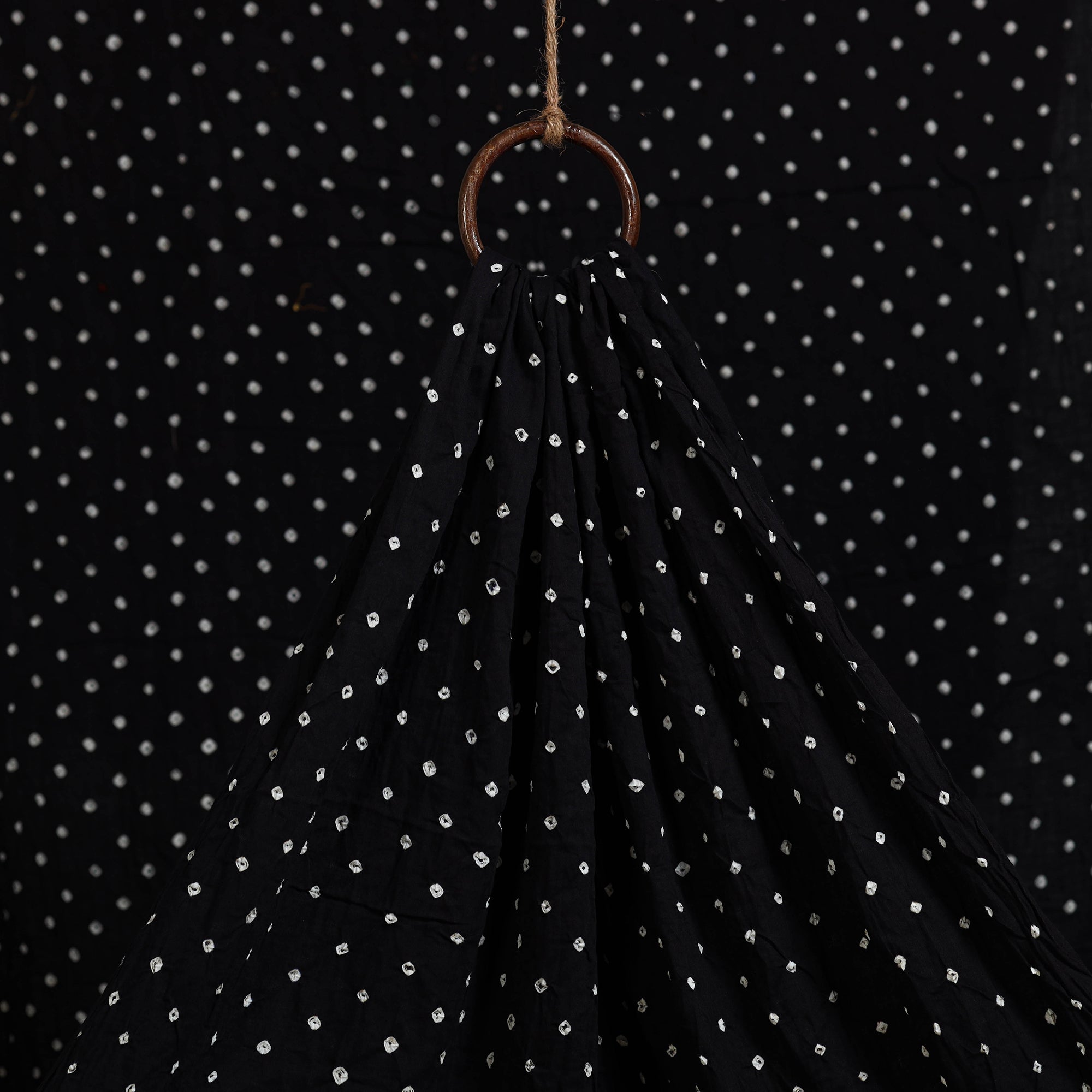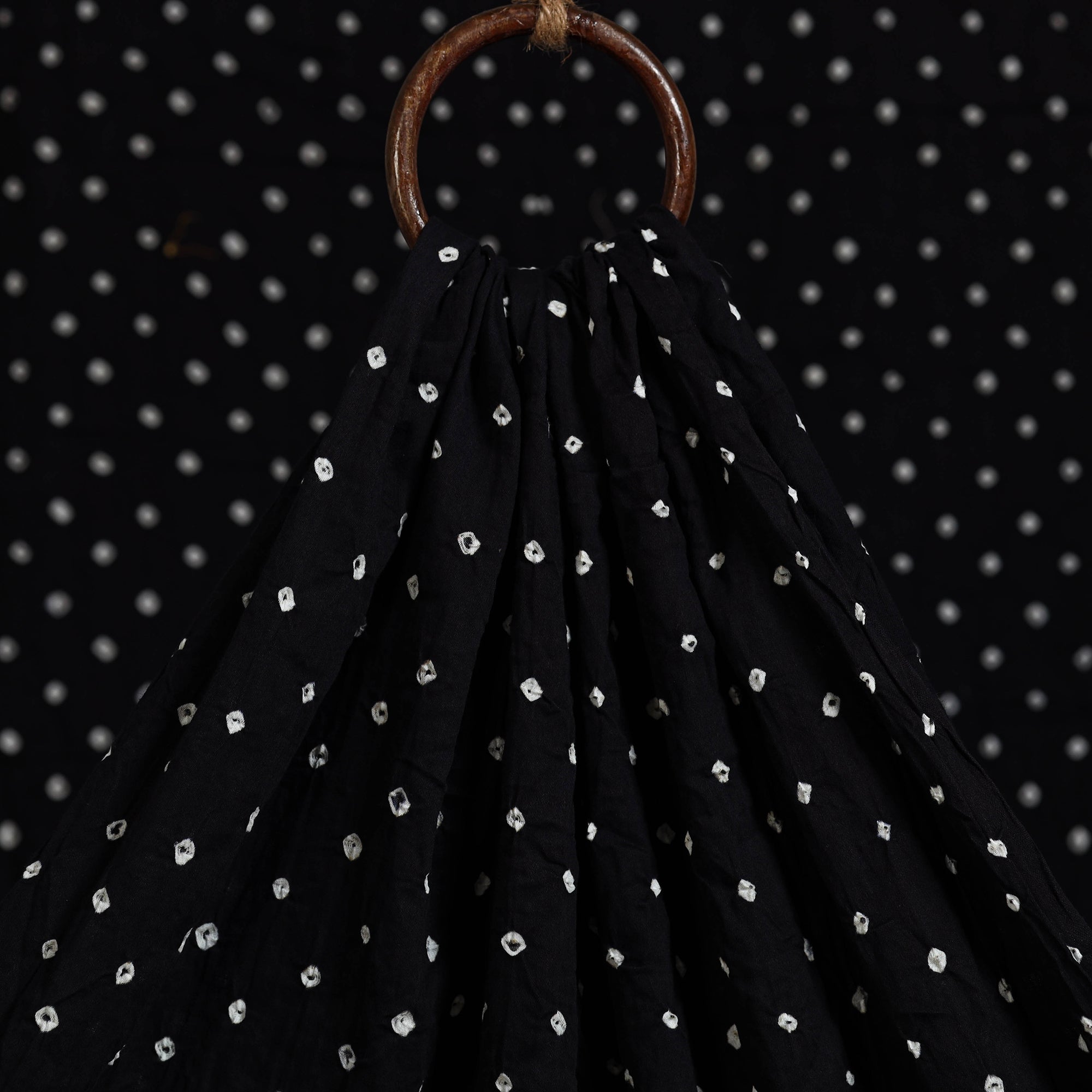 This black kutch bandhani tie-dye cotton fabric features a majestic bandhani pattern, hand-tied and dyed using the traditional technique practiced by the artisans of Kutch. The art of Bandhani is a highly skilled process that involves tightly tying fabric with threads at several points to create intricate patterns. This fine-quality fabric is a testament to the craftsmanship and rich cultural heritage of Kutch. Perfect for both clothing and home decor.