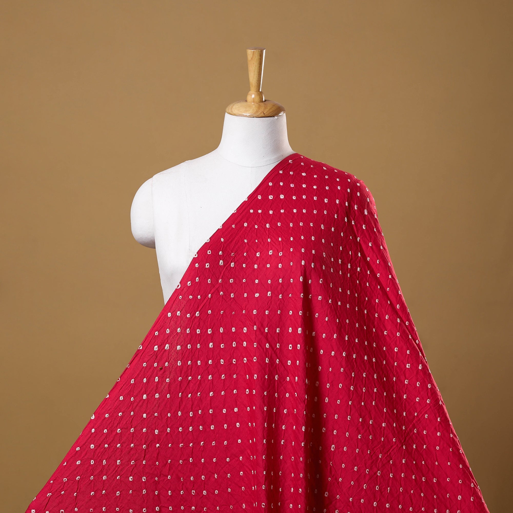 Bandhani fabric is created using a centuries old tie-dye technique practiced by skilled artisans of Kutch. The process involves tightly tying the fabric with threads at multiple points before dyeing, which resists the colour and forms the signature dotted Bandhej motifs. Deeply rooted in tradition and cultural heritage, this fabric is made using satin cotton and is suitable for creating sarees, dupattas, kurtas, blouses, stoles and more.