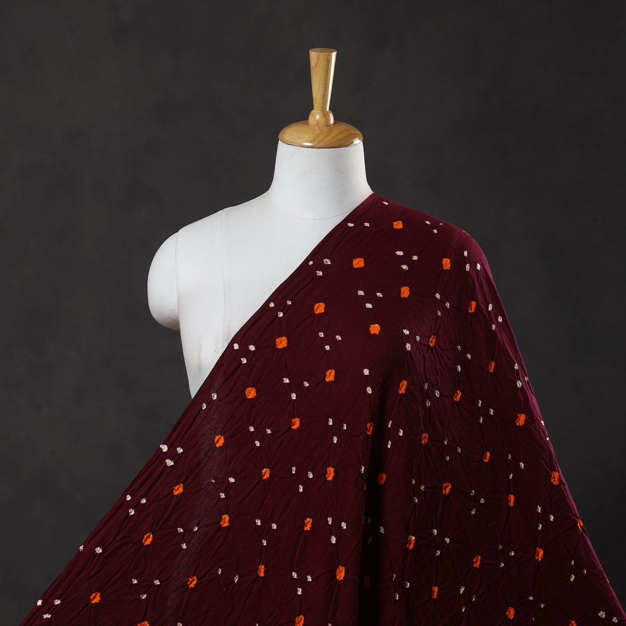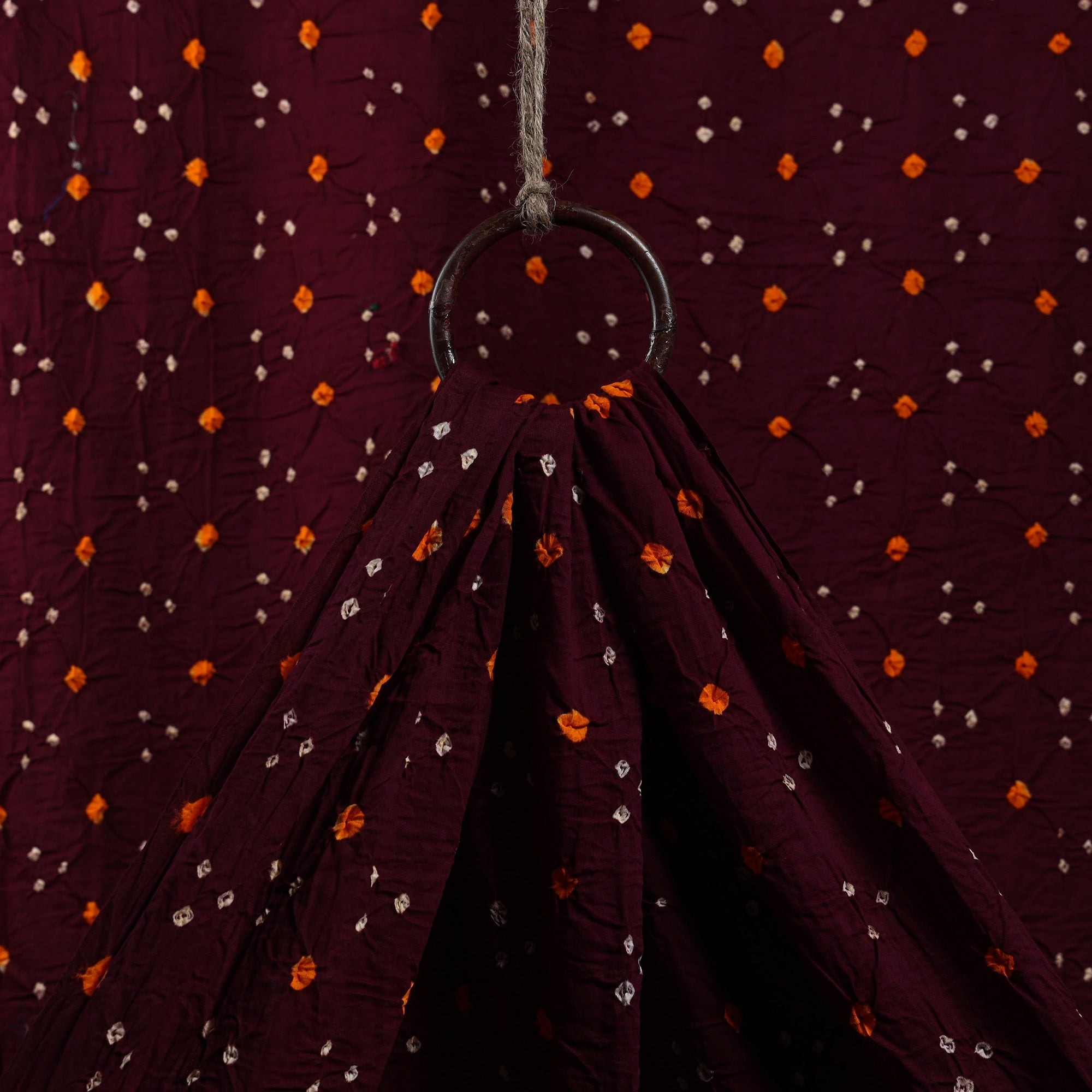Experience the timeless beauty of maroon kutch tie-dye cotton bandhani fabric, crafted by skilled artisans from Kutch. Using the age-old bandhani technique, this luxurious fabric showcases intricate, hand-tied patterns that reflect India's rich cultural heritage.