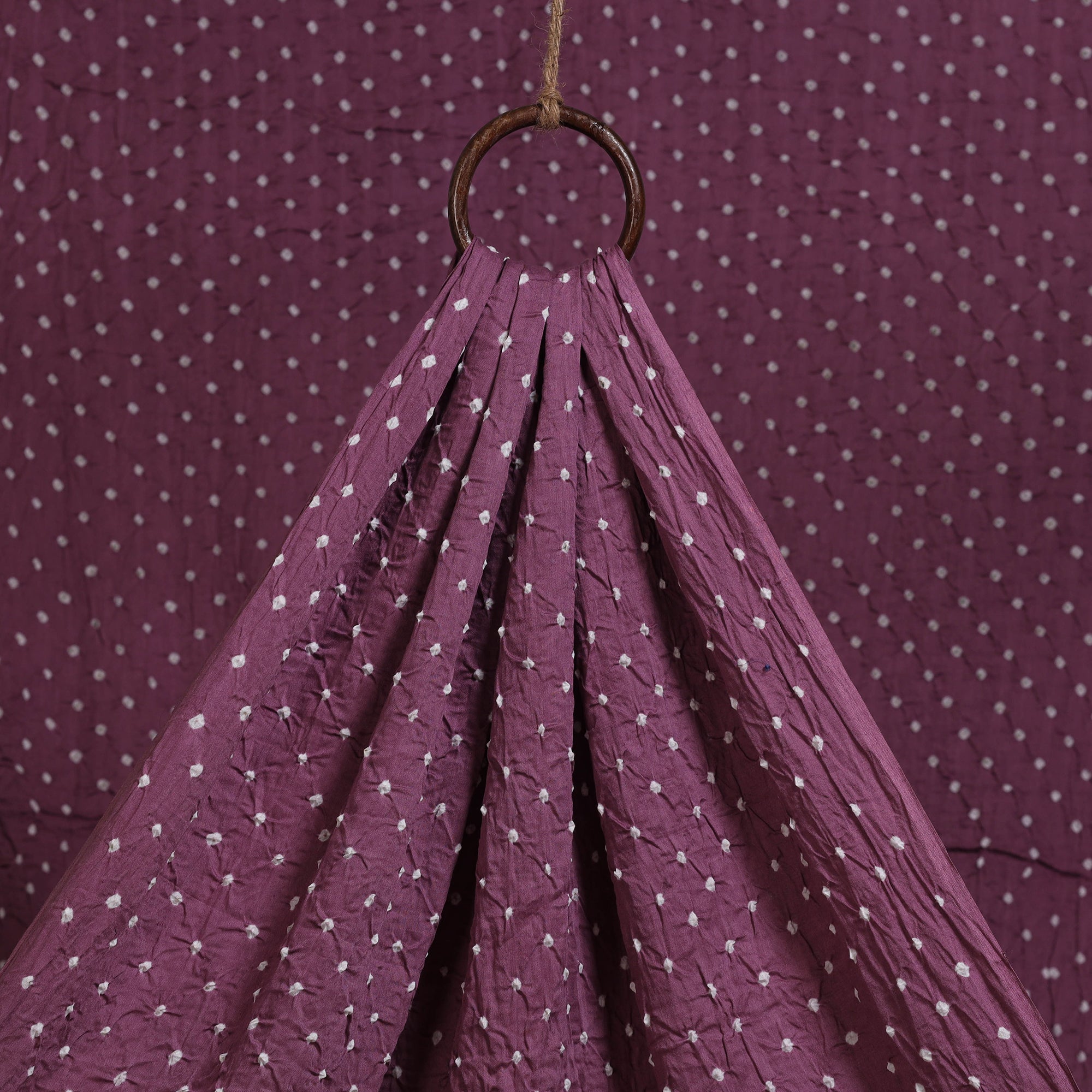 Purple bandhani fabric is created using a centuries old tie-dye technique practiced by skilled artisans of Kutch. The process involves tightly tying the fabric with threads at multiple points before dyeing, which resists the colour and forms the signature dotted Bandhej motifs. Deeply rooted in tradition and cultural heritage, this fabric is made using satin cotton and is suitable for creating sarees, dupattas, kurtas, blouses, stoles and more.