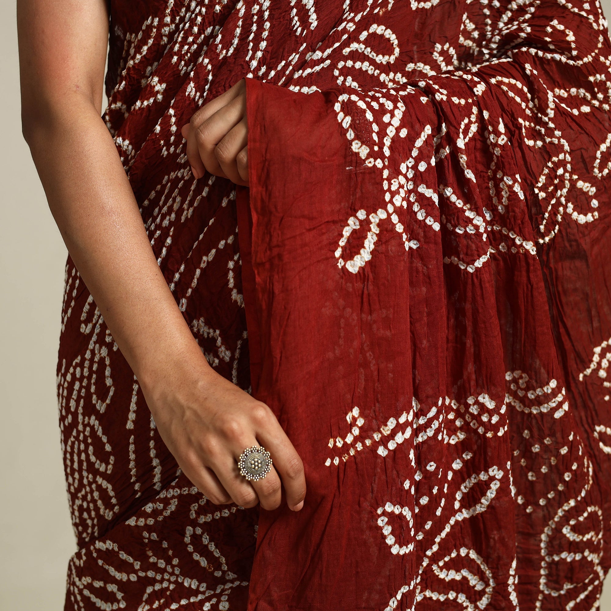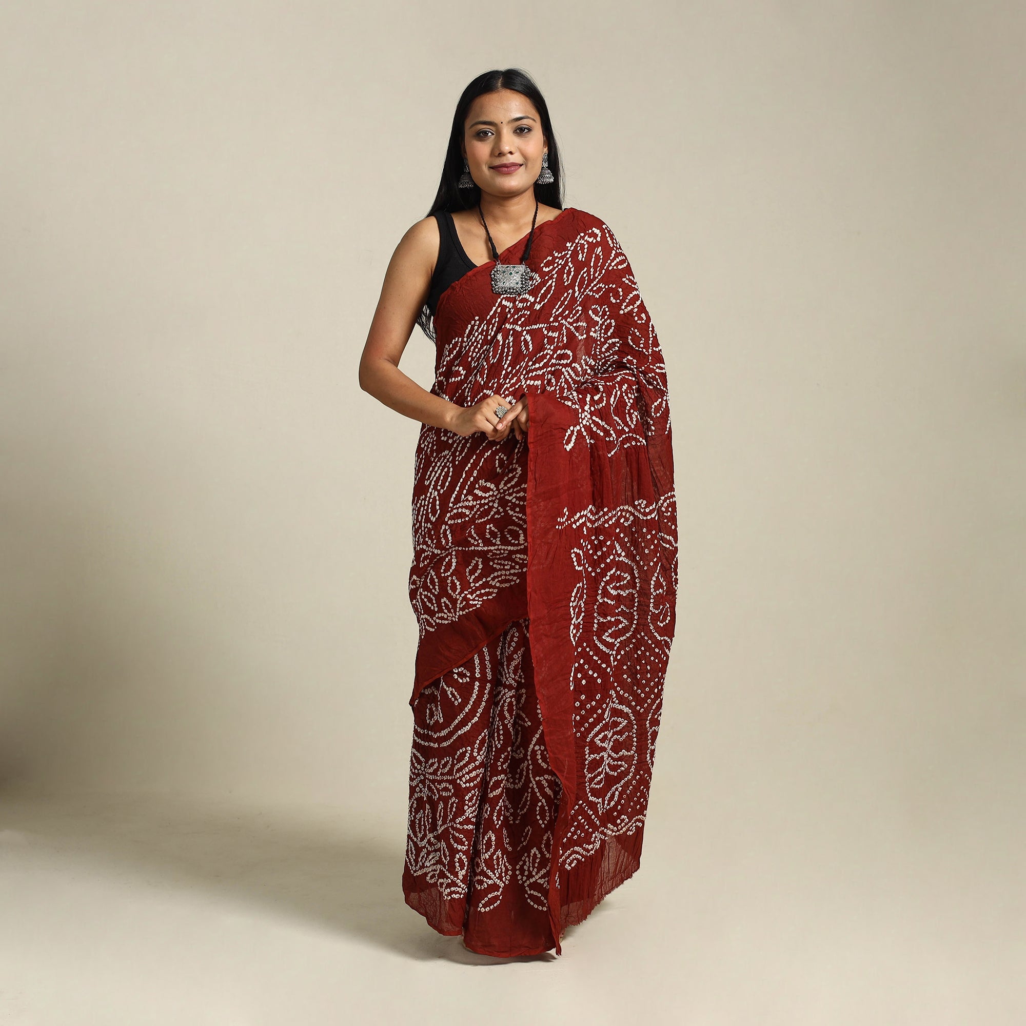 This maroon cotton bandhani saree showcases the beauty of traditional tie-dye from Kutch. Each piece is created through a meticulous tying and dyeing process that results in unique, intricate patterns. Perfect for festive celebrations, cultural gatherings, or adding a touch of elegance to your everyday wardrobe.