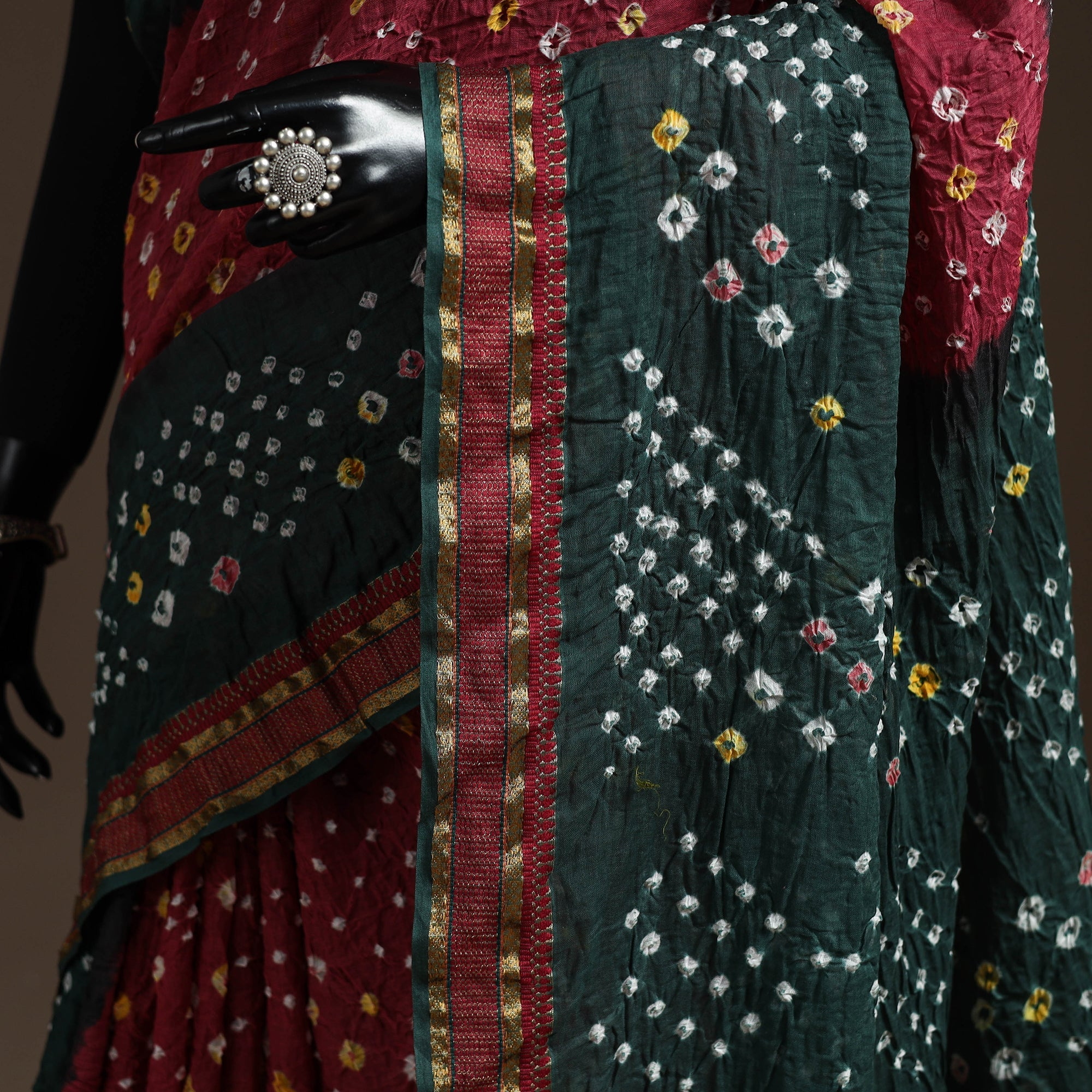 Green bandhani tie-dye cotton saree with blouse piece and border, crafted by artisans from Kutch using the traditional Bandhej method. In this age-old technique, the fabric is tightly tied at tiny points and then dyed to create natural dotted patterns. Each saree is unique because every knot is tied by hand, a skill practiced for generations. Lightweight, vibrant and easy to drape, this saree works beautifully for festive wear as well as everyday outings.