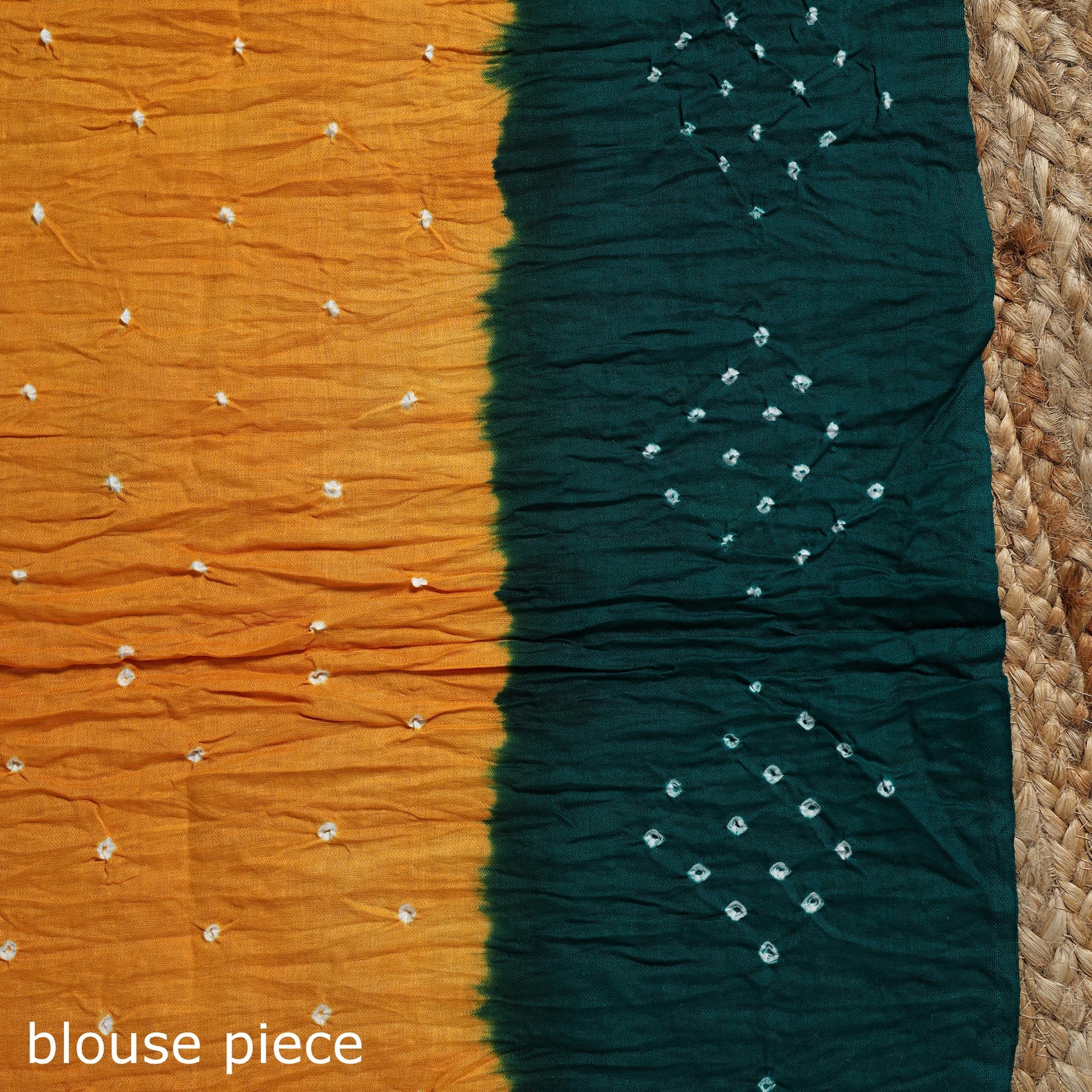 Green bandhani tie-dye cotton saree with blouse piece and border, crafted by artisans from Kutch using the traditional Bandhej method. In this age-old technique, the fabric is tightly tied at tiny points and then dyed to create natural dotted patterns. Each saree is unique because every knot is tied by hand, a skill practiced for generations. Lightweight, vibrant and easy to drape, this saree works beautifully for festive wear as well as everyday outings.