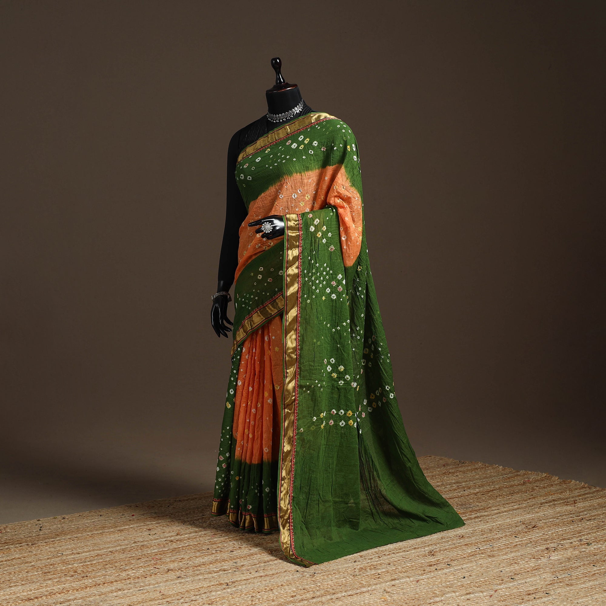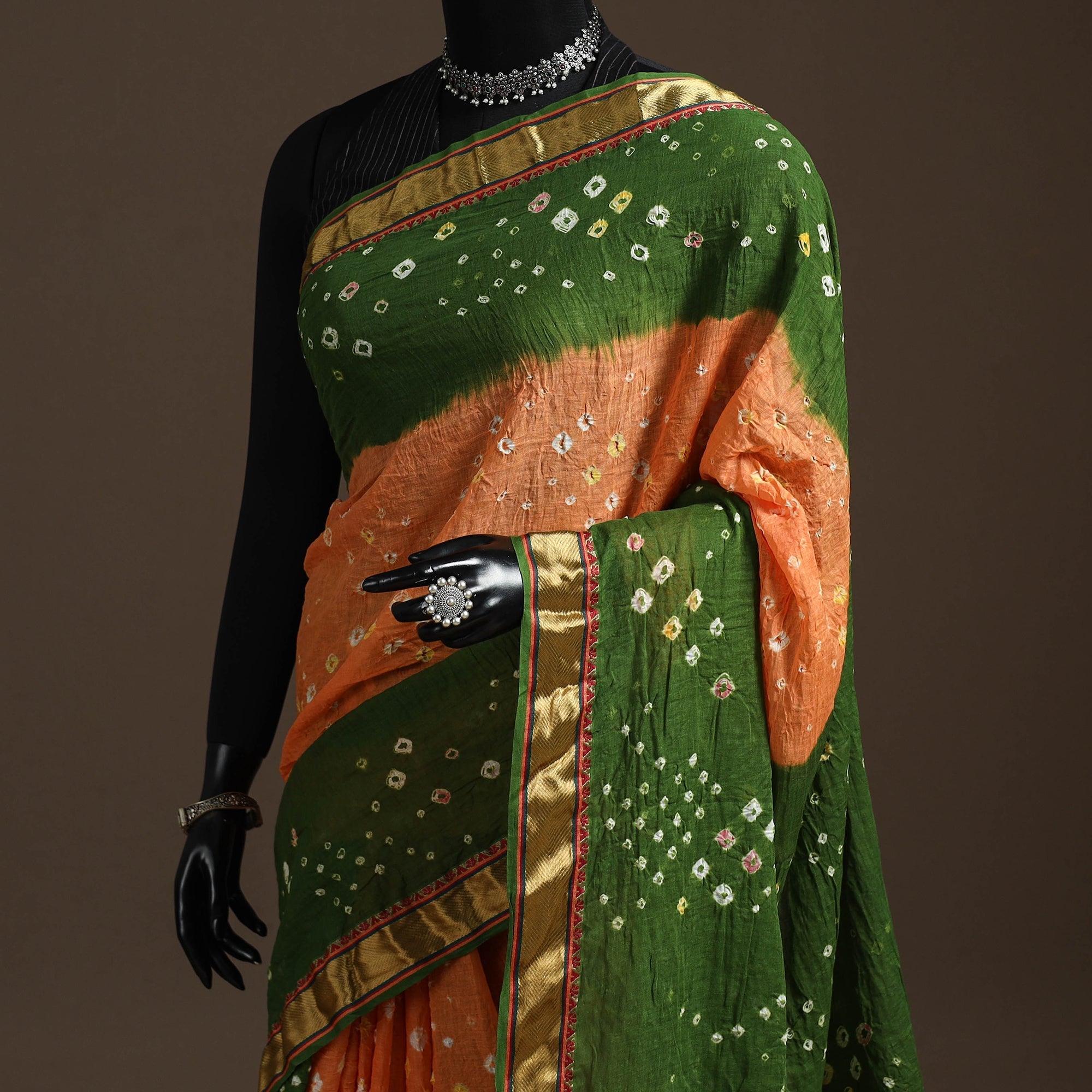 Green bandhani tie-dye cotton saree with blouse piece and border, crafted by artisans from Kutch using the traditional Bandhej method. In this age-old technique, the fabric is tightly tied at tiny points and then dyed to create natural dotted patterns. Each saree is unique because every knot is tied by hand, a skill practiced for generations. Lightweight, vibrant and easy to drape, this saree works beautifully for festive wear as well as everyday outings.