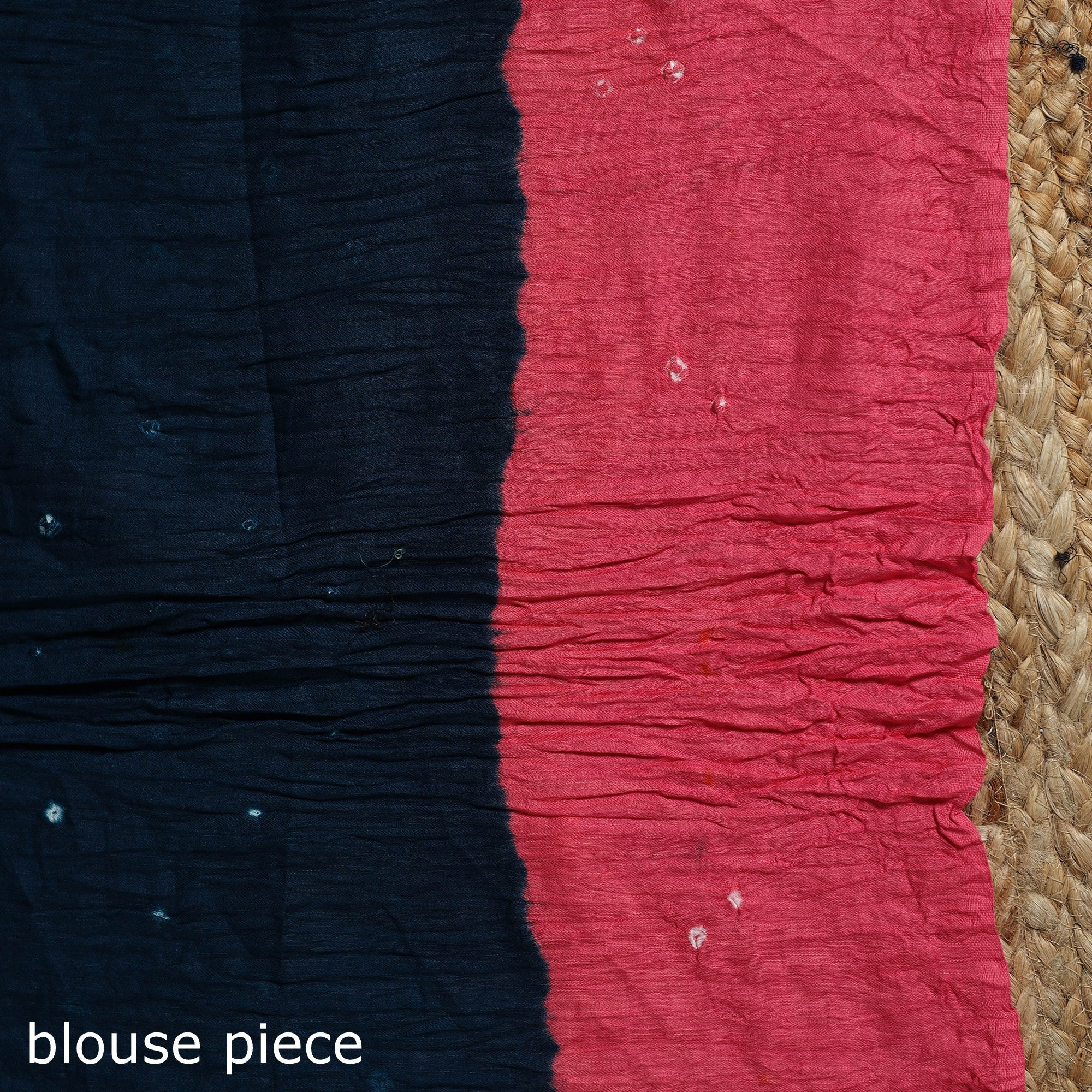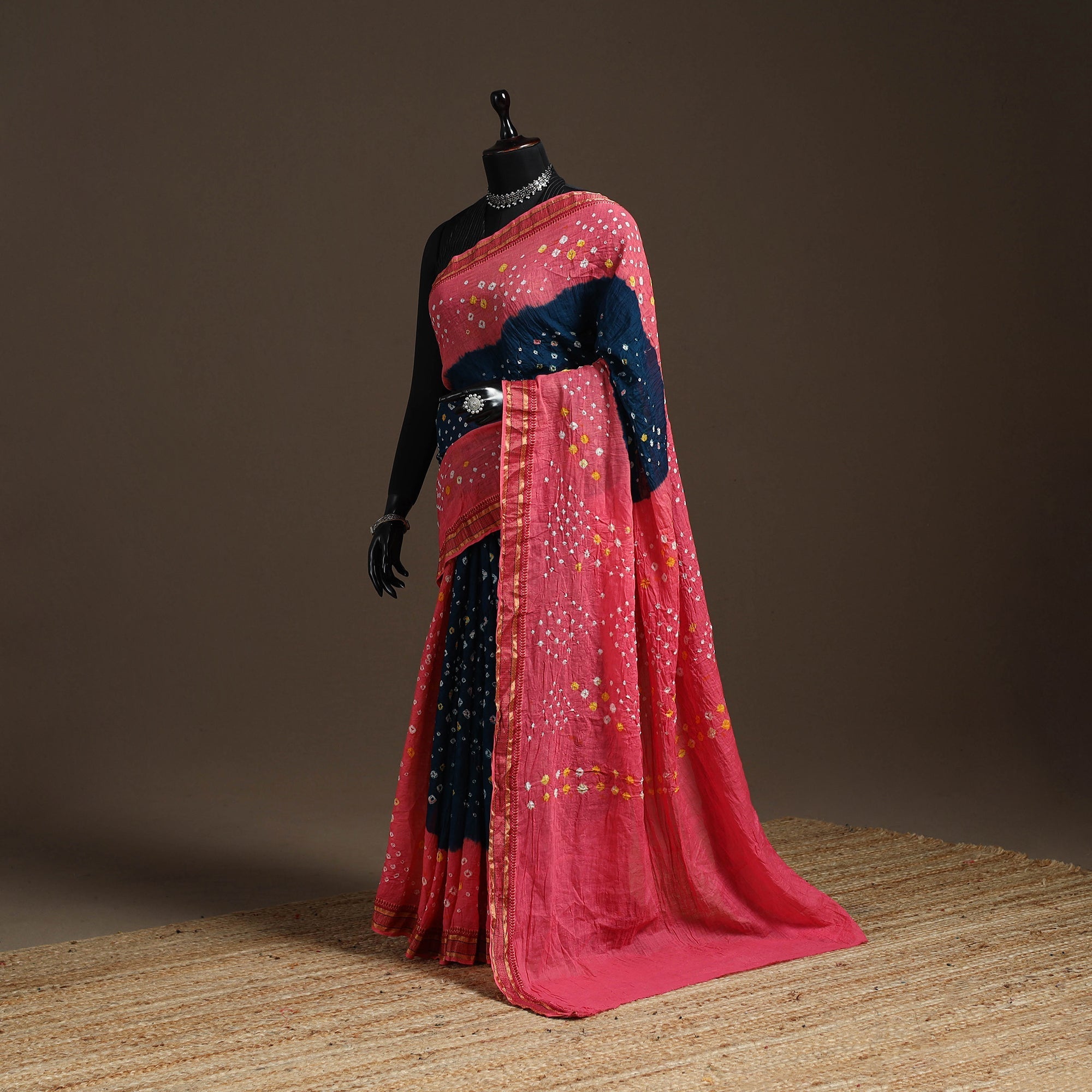 Pink bandhani tie-dye cotton saree with blouse piece and border, crafted by artisans from Kutch using the traditional Bandhej method. In this age-old technique, the fabric is tightly tied at tiny points and then dyed to create natural dotted patterns. Each saree is unique because every knot is tied by hand, a skill practiced for generations. Lightweight, vibrant and easy to drape, this saree works beautifully for festive wear as well as everyday outings.