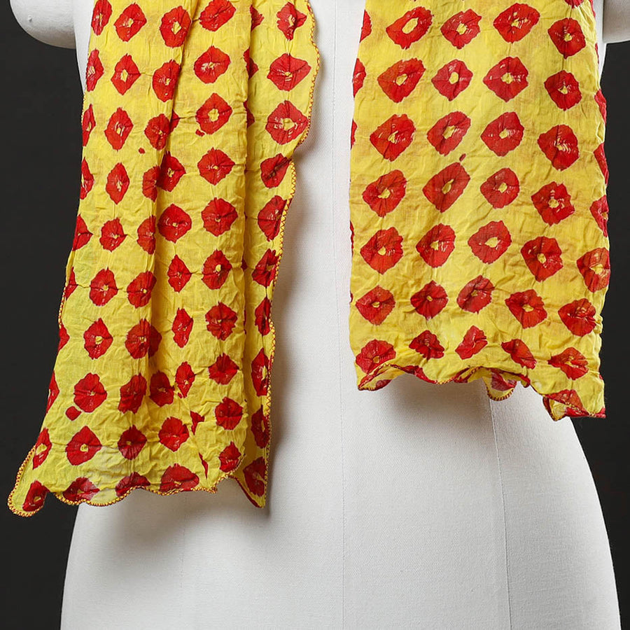 This kutch tie & dye cotton bandhani stole showcases a majestic bandhani pattern, created using the traditional tie-dye technique practiced by skilled artisans in Kutch. Each piece is meticulously dyed by tying the fabric tightly with thread at multiple points, resulting in a beautifully intricate design.