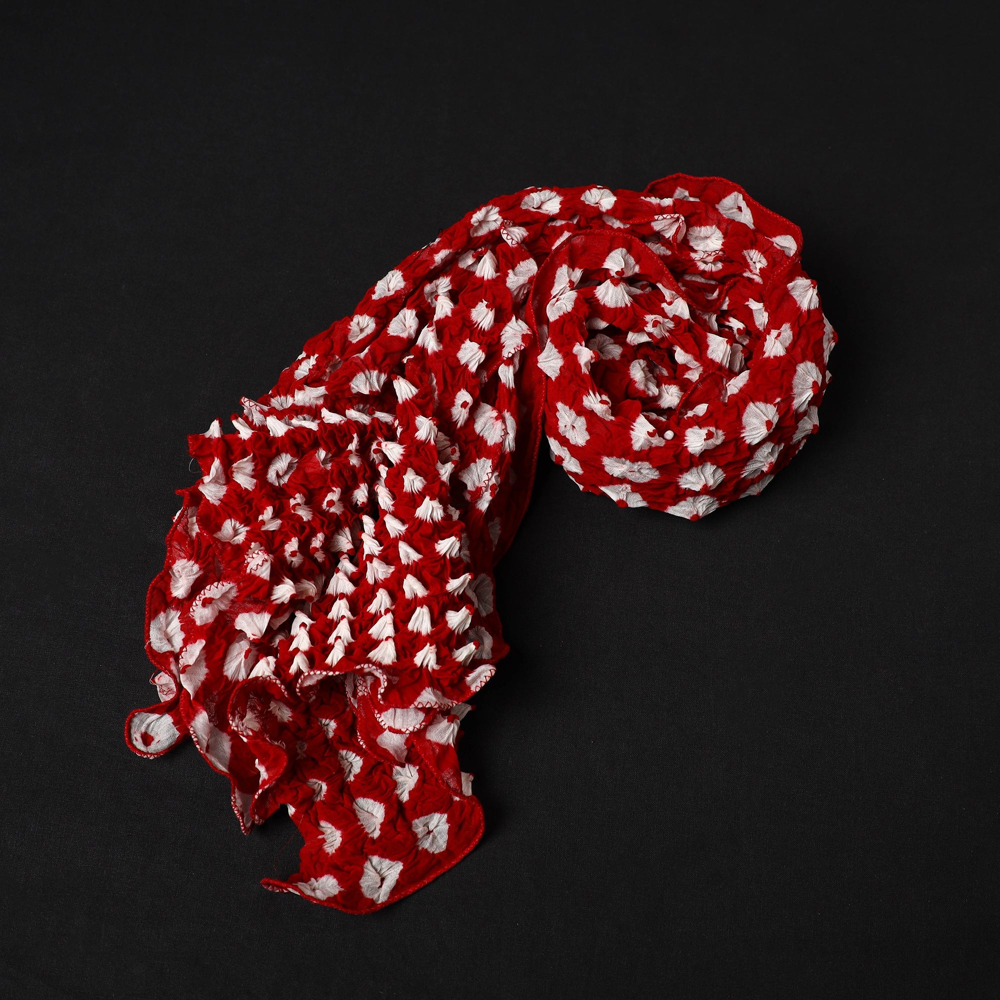 Celebrate the vibrant artistry of red kutch tie-dye cotton bandhani stole. Created using the traditional tie-dye technique practiced by skilled artisans in Kutch, resulting in intricate patterns and vibrant colors. this stole is perfect for any occasion, Each piece is meticulously dyed by tying the fabric tightly with thread at multiple points, resulting in a beautifully intricate design.