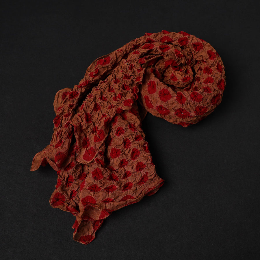 Celebrate the vibrant artistry of brown kutch tie-dye cotton bandhani stole. Created using the traditional tie-dye technique practiced by skilled artisans in Kutch, resulting in intricate patterns and vibrant colors. this stole is perfect for any occasion, Each piece is meticulously dyed by tying the fabric tightly with thread at multiple points, resulting in a beautifully intricate design.