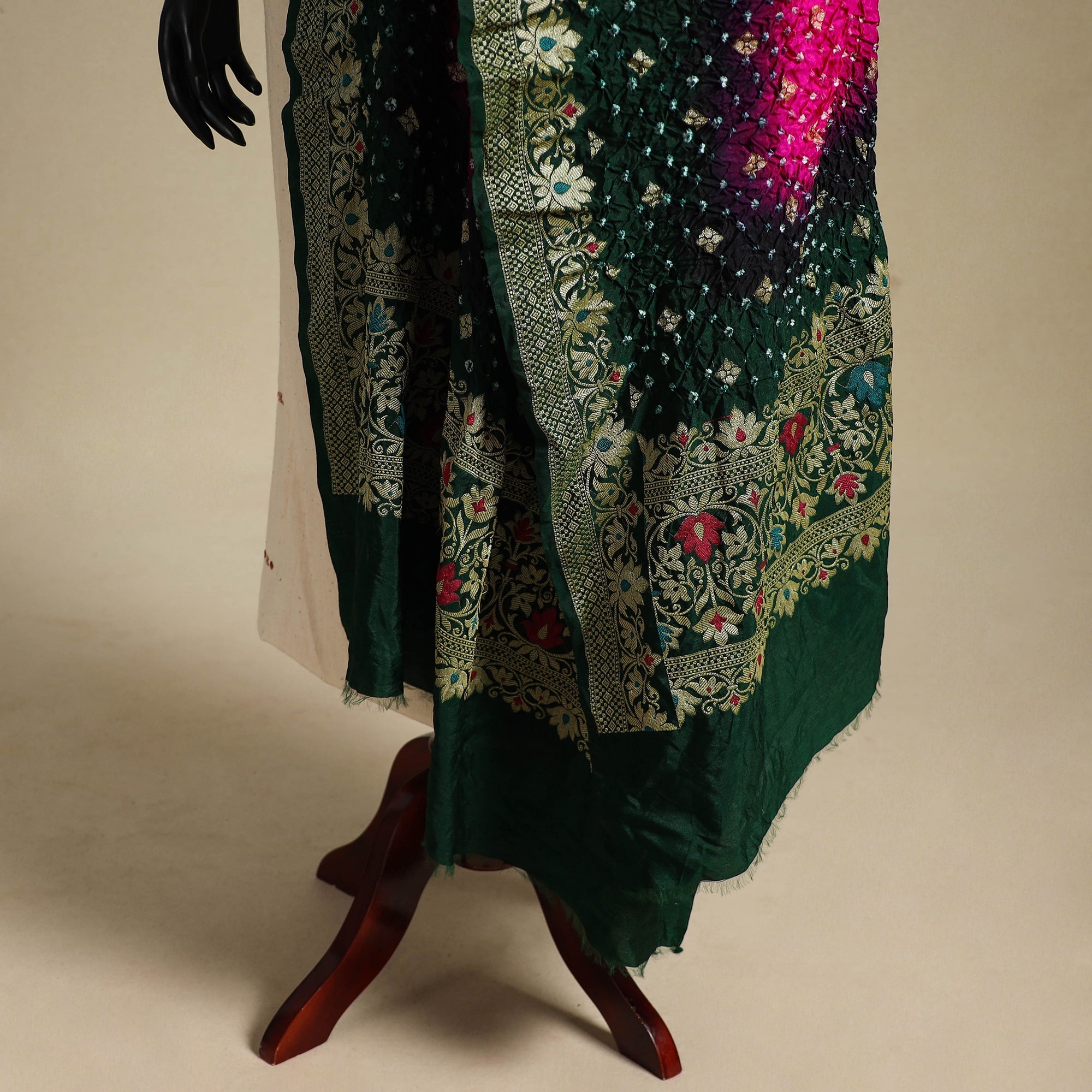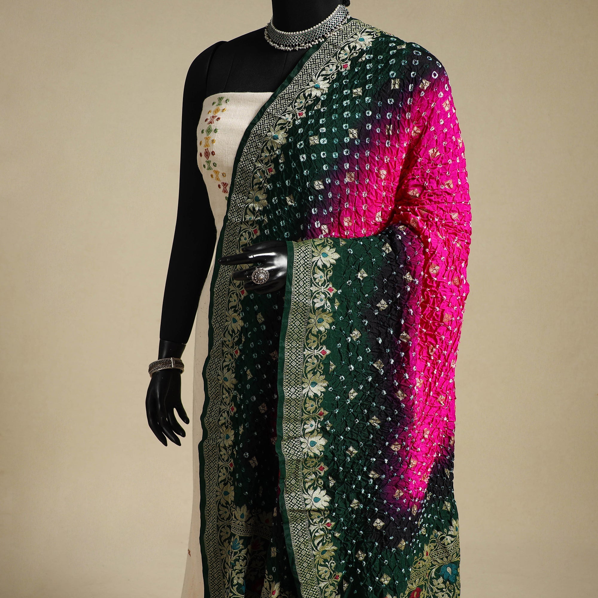 Experience the charm of banarasi weaving blended with Kutch’s traditional bandhani artistry in this exquisite red dupatta. Crafted by skilled artisans using the bandhej technique, the fabric is tied at multiple points before dyeing, creating detailed tie-dye patterns. Made from dupion silk enhanced with zari work, this dupatta is an elegant choice for festive occasions as well as everyday traditional wear.
