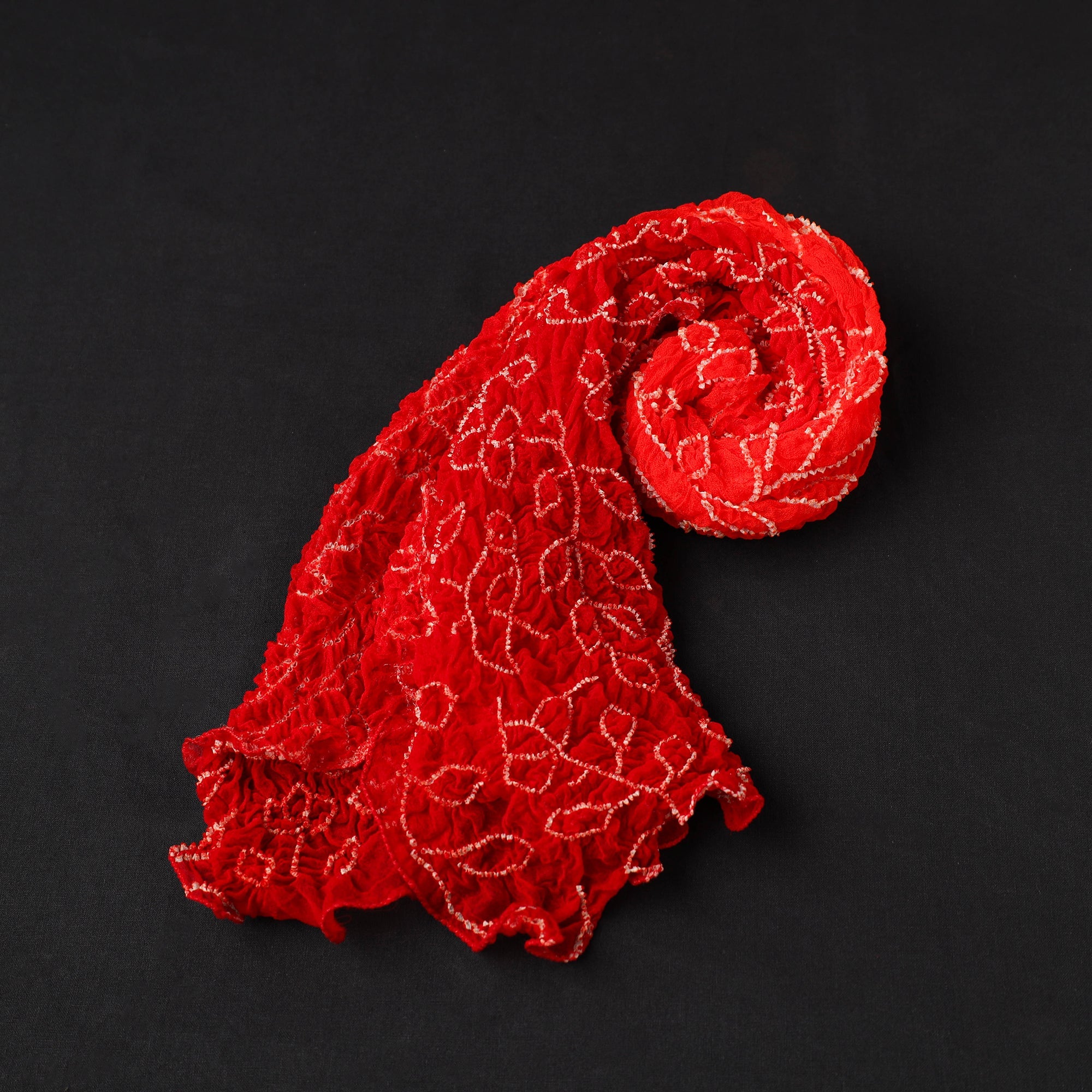 Material Red kutch tie & dye georgette bandhani stole. Created by skilled artisans in Kutch, each stole is hand-tied and dyed to produce its unique, detailed patterns. Soft, lightweight, and versatile, this stole brings the beauty of Kutch’s culture to your wardrobe.