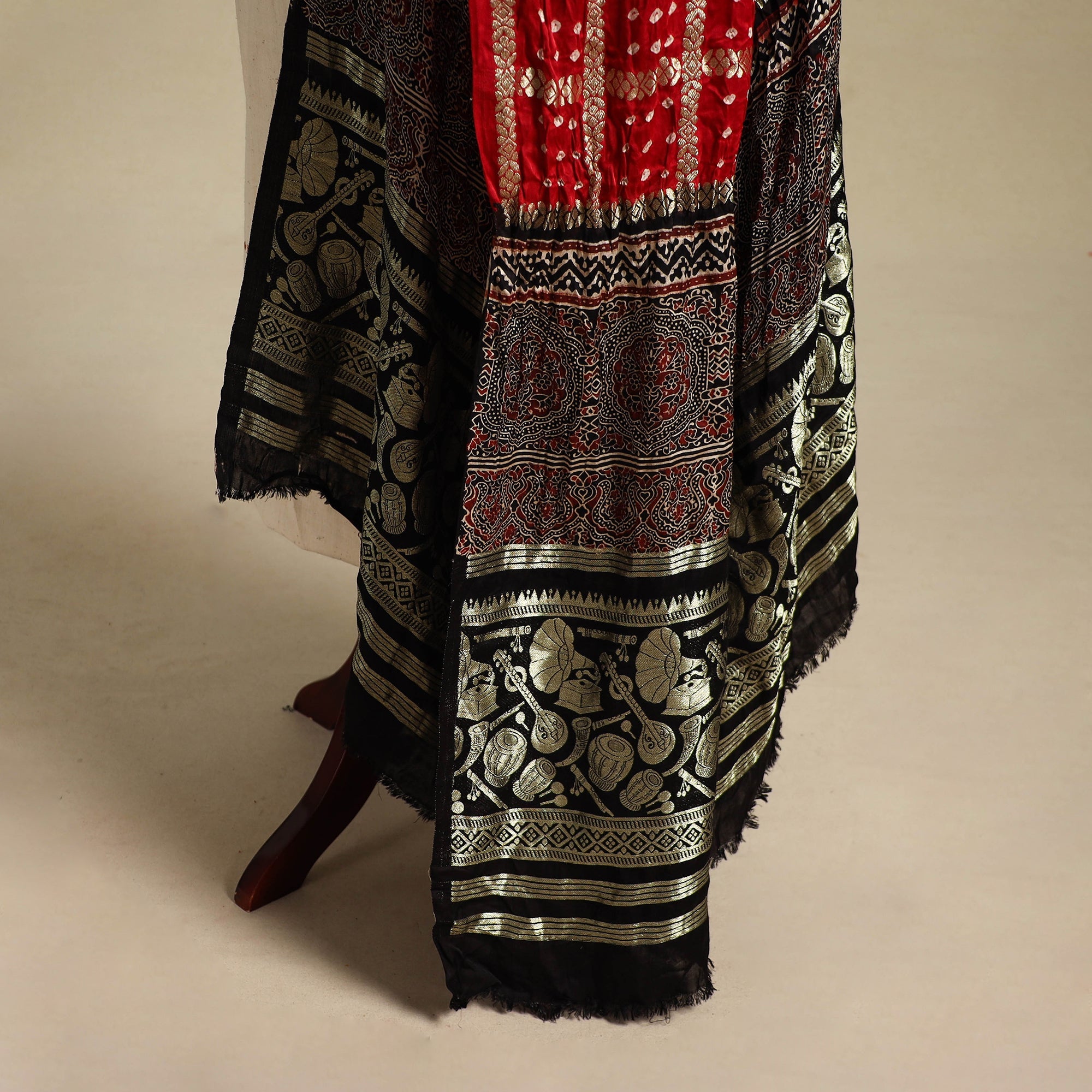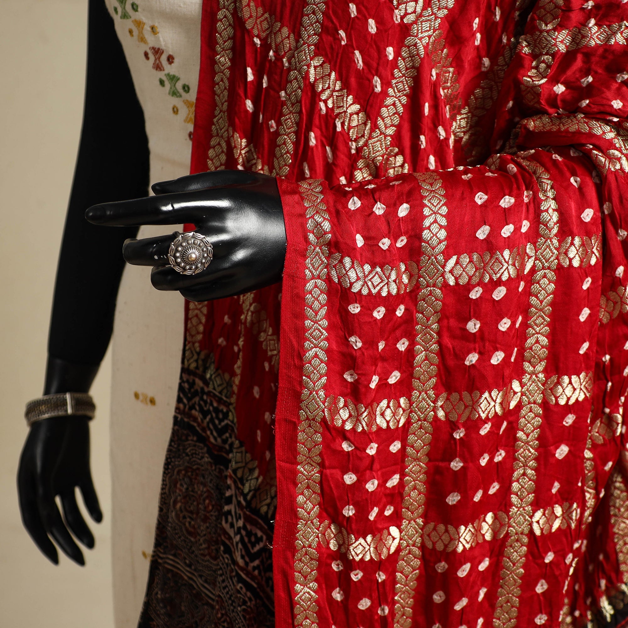 Experience the beauty of Kutch’s traditional tie-dye artistry with a red bandhani dupatta. Each piece is created by skilled artisans using the bandhej technique, where the fabric is tied at multiple points before dyeing to form intricate patterns. Made from modal silk with zari checks and finished with an ajrakh block print pallu, it is ideal for festive occasions as well as everyday traditional wear.red