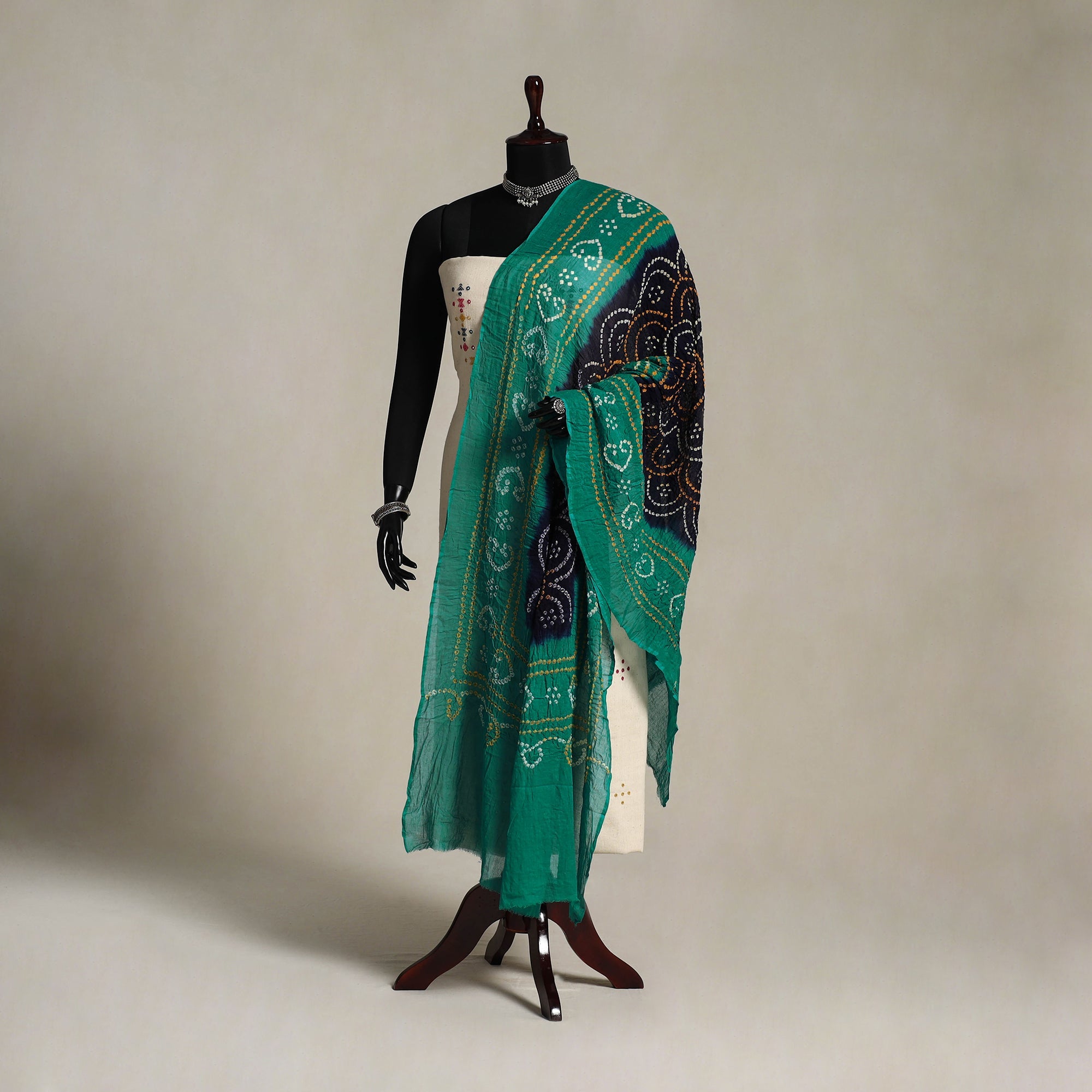 Discover the elegance of Kutch's age-old tie-dye artistry with this green bandhani dupatta. Crafted by expert artisans using the bandhej method, each fabric is intricately tied and dyed to reveal stunning patterns. Made from breathable mul cotton, it's ideal for both everyday styling and festive occasions with a hint of tradition.