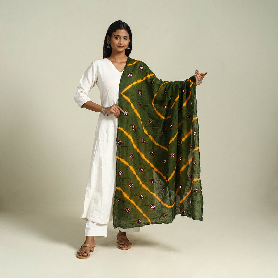 Embrace tradition with this green bandhani dupatta, crafted by skilled artisans from Kutch. Made using the traditional tie-dye technique, each piece features delicate hand-tied patterns on mul cotton fabric. Lightweight and breathable, it’s ideal for casual outings, festive occasions, or everyday styling.