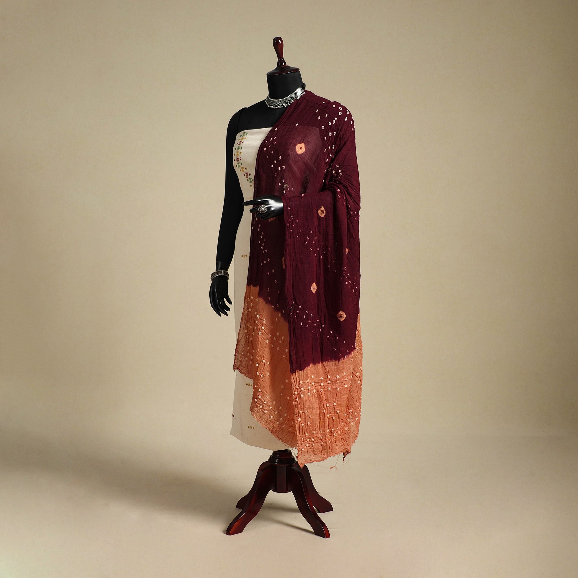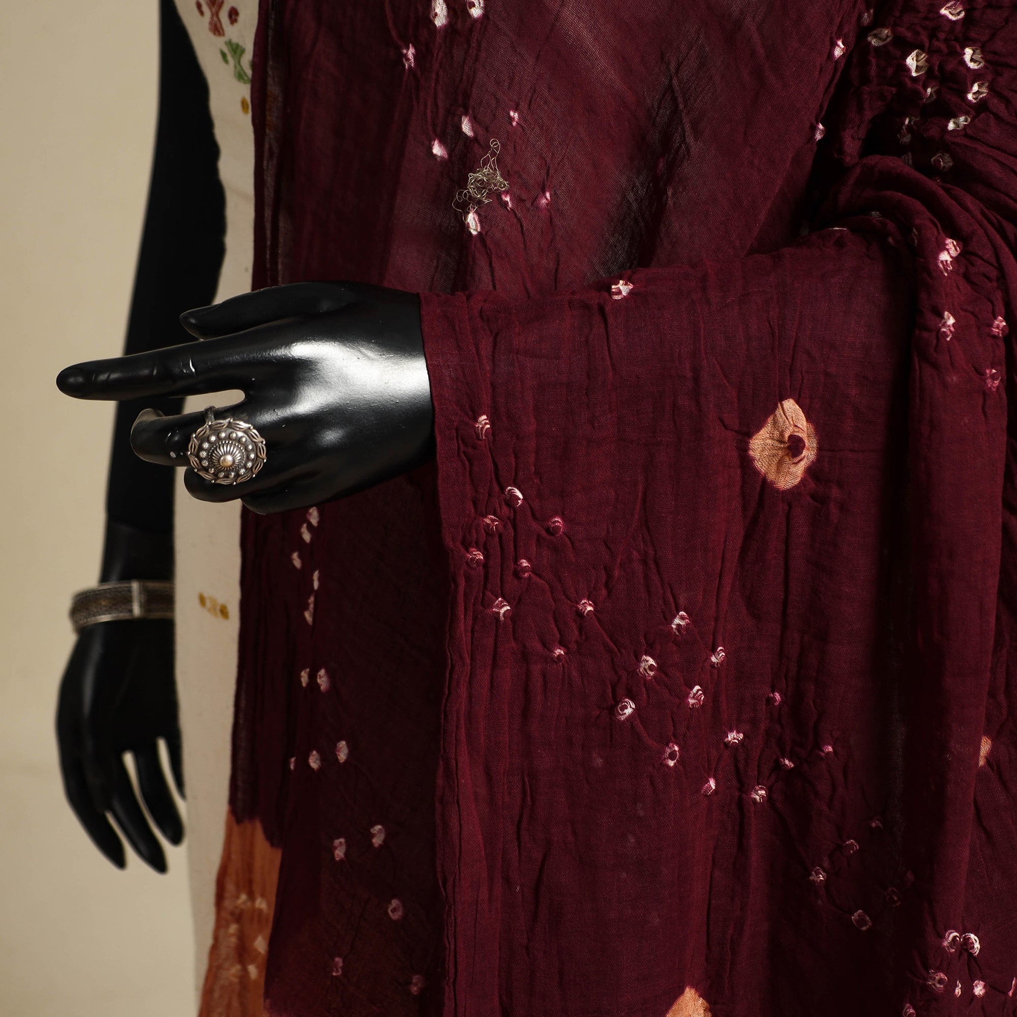 Celebrate the charm of Kutch’s heritage with a maroon bandhani dupatta. Crafted by artisans through the bandhej technique, the cloth is carefully tied at multiple points and then dyed to reveal detailed motifs. Woven in mul cotton, it makes a graceful choice for daily wear as well as festive gatherings.