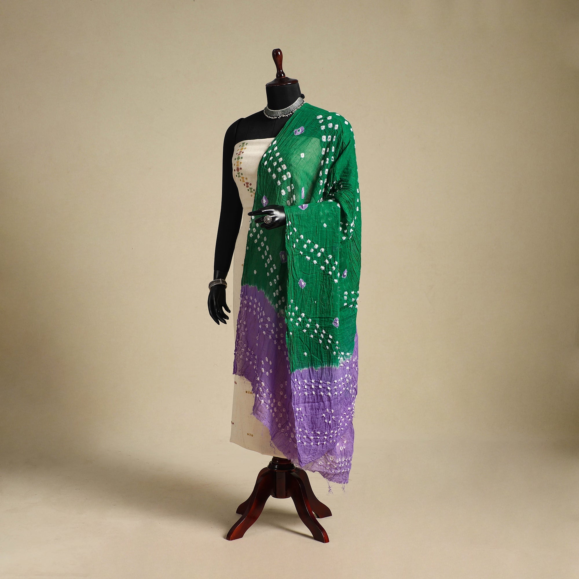 Celebrate the charm of Kutch’s heritage with a green bandhani dupatta. Crafted by artisans through the bandhej technique, the cloth is carefully tied at multiple points and then dyed to reveal detailed motifs. Woven in mul cotton, it makes a graceful choice for daily wear as well as festive gatherings.