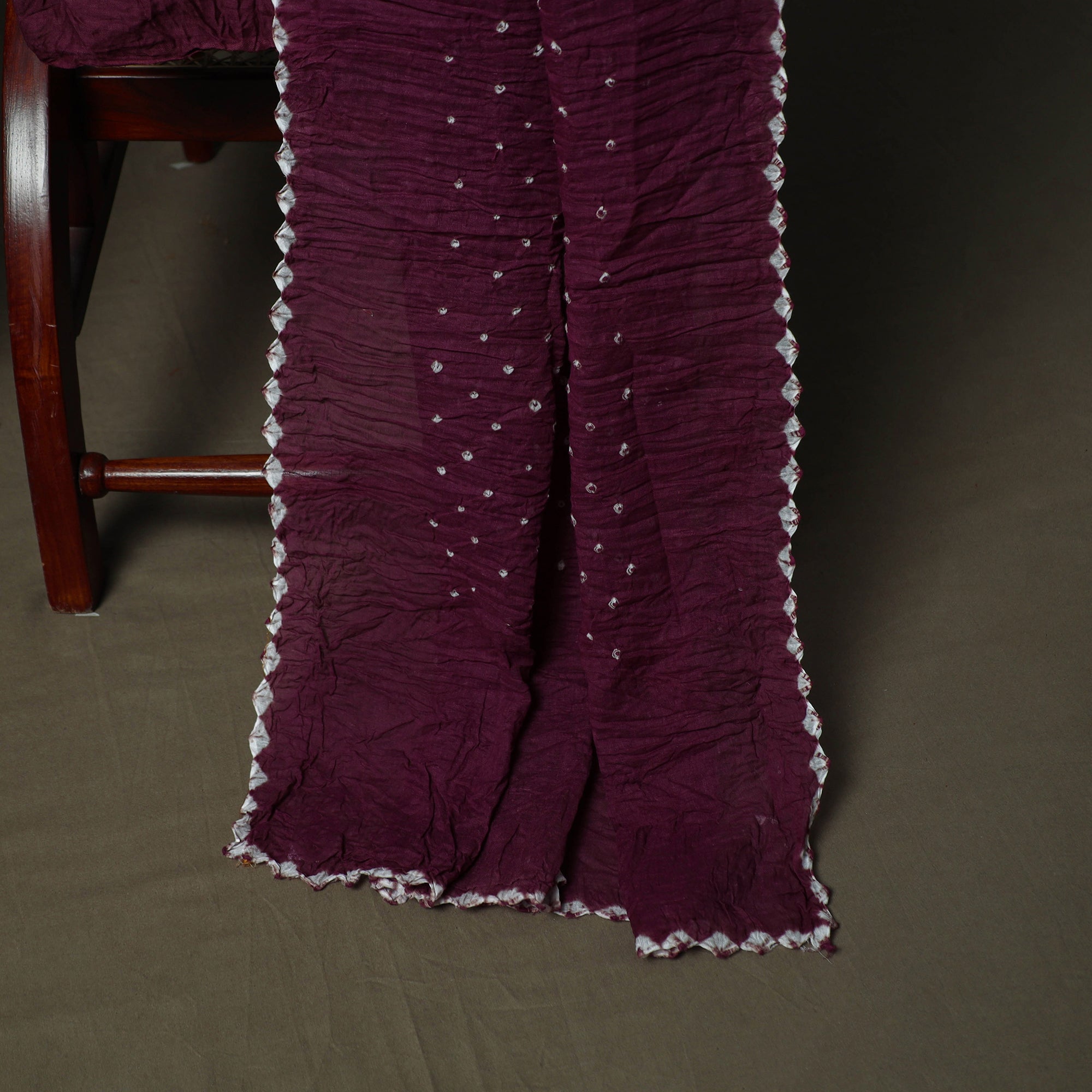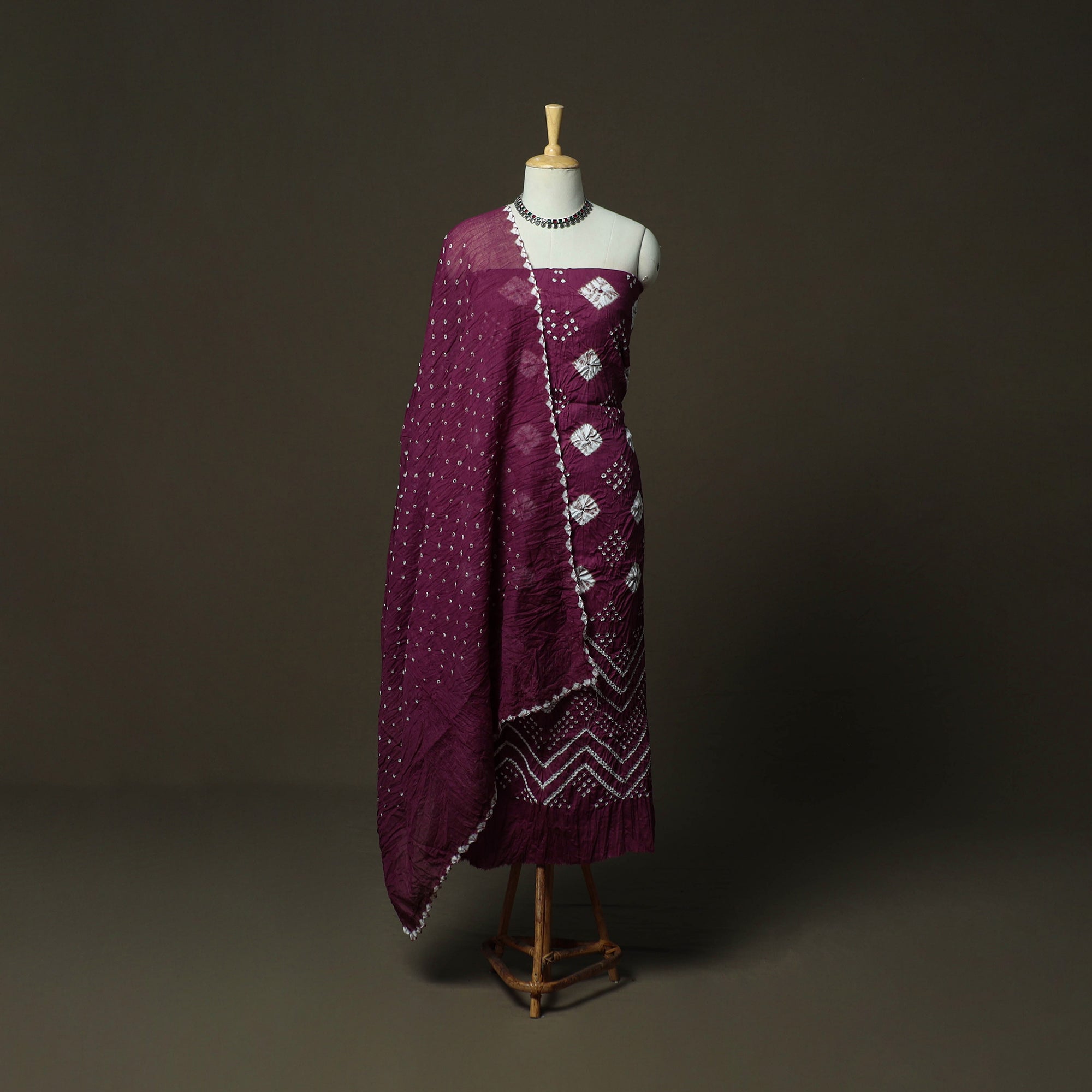 Purple kutch tie-dye bandhani satin cotton 3pc unstitched dress material is features intricate hand-tied and hand-dyed patterns. Created using the traditional bandhani technique, this art form is over 5,000 years old and passed down through generations in Kutch. Skilled artisans carefully tie thousands of tiny knots to create beautiful patterns, making each piece unique. The set includes kurta fabric, matching bottom and dupatta, perfect for creating an elegant ethnic outfit.