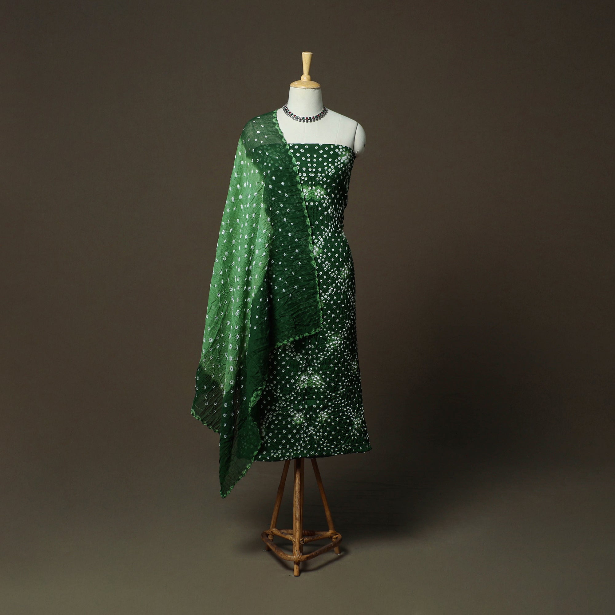 Green kutch tie-dye bandhani satin cotton 3pc unstitched dress material is features intricate hand-tied and hand-dyed patterns. Created using the traditional bandhani technique, this art form is over 5,000 years old and passed down through generations in Kutch. Skilled artisans carefully tie thousands of tiny knots to create beautiful patterns, making each piece unique. The set includes kurta fabric, matching bottom and dupatta, perfect for creating an elegant ethnic outfit.