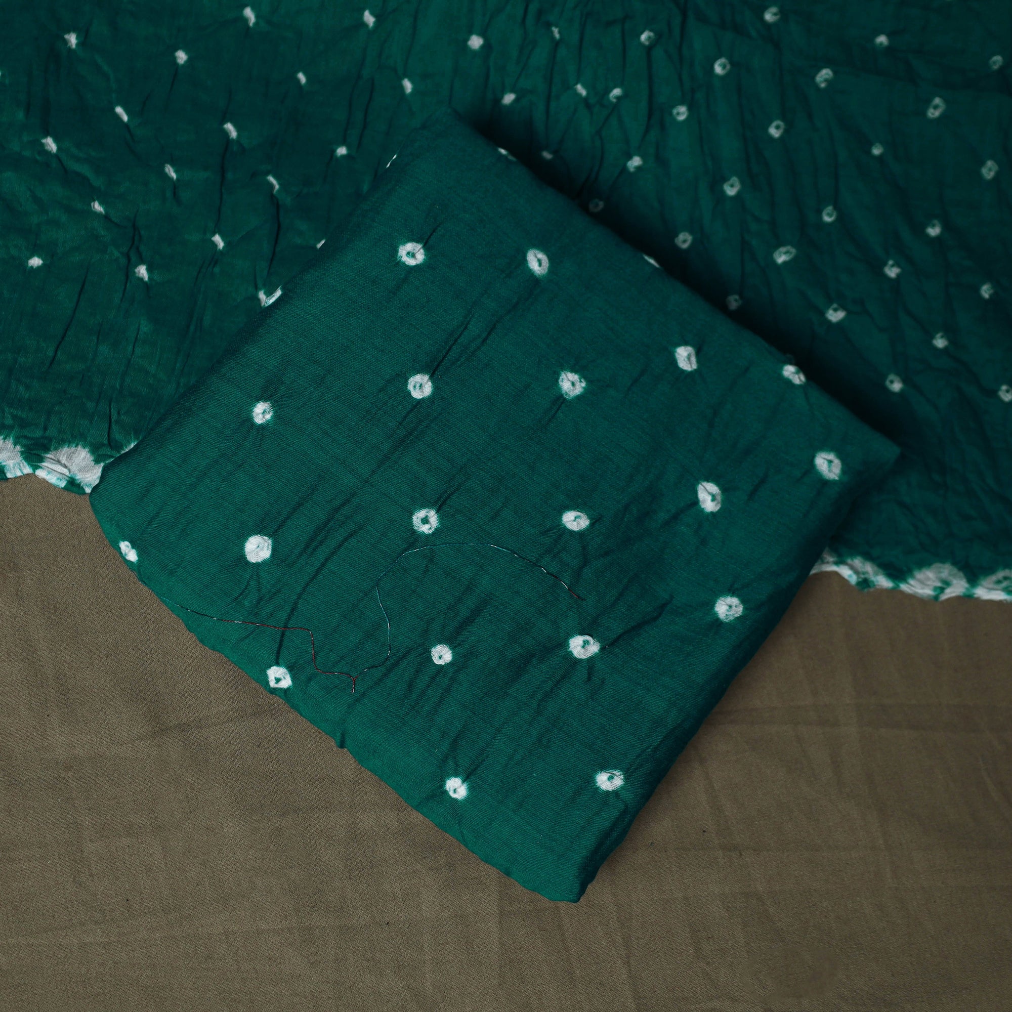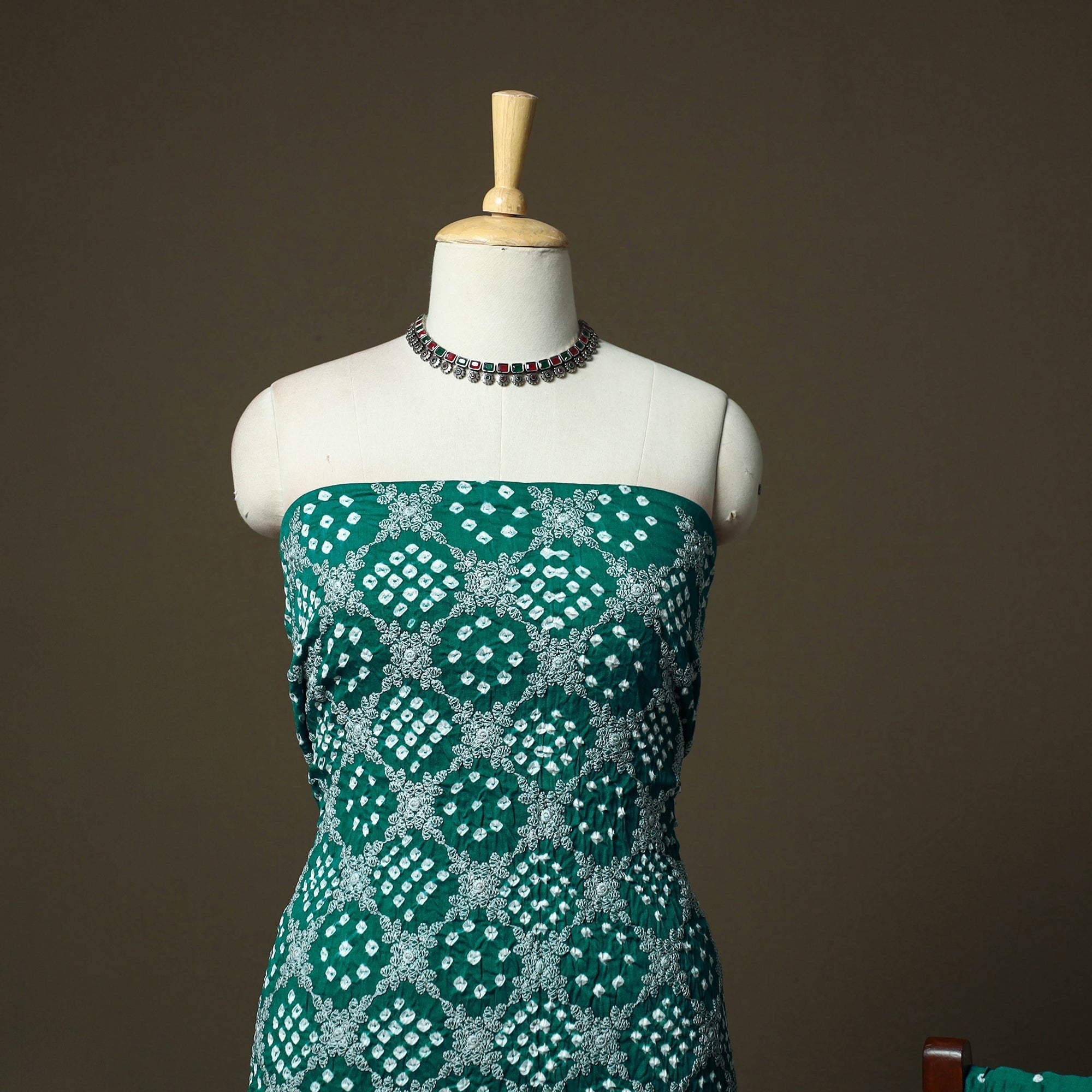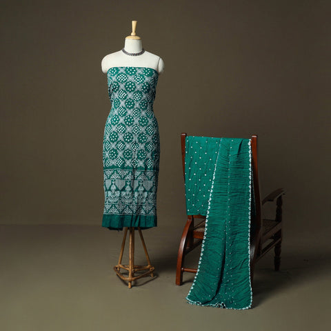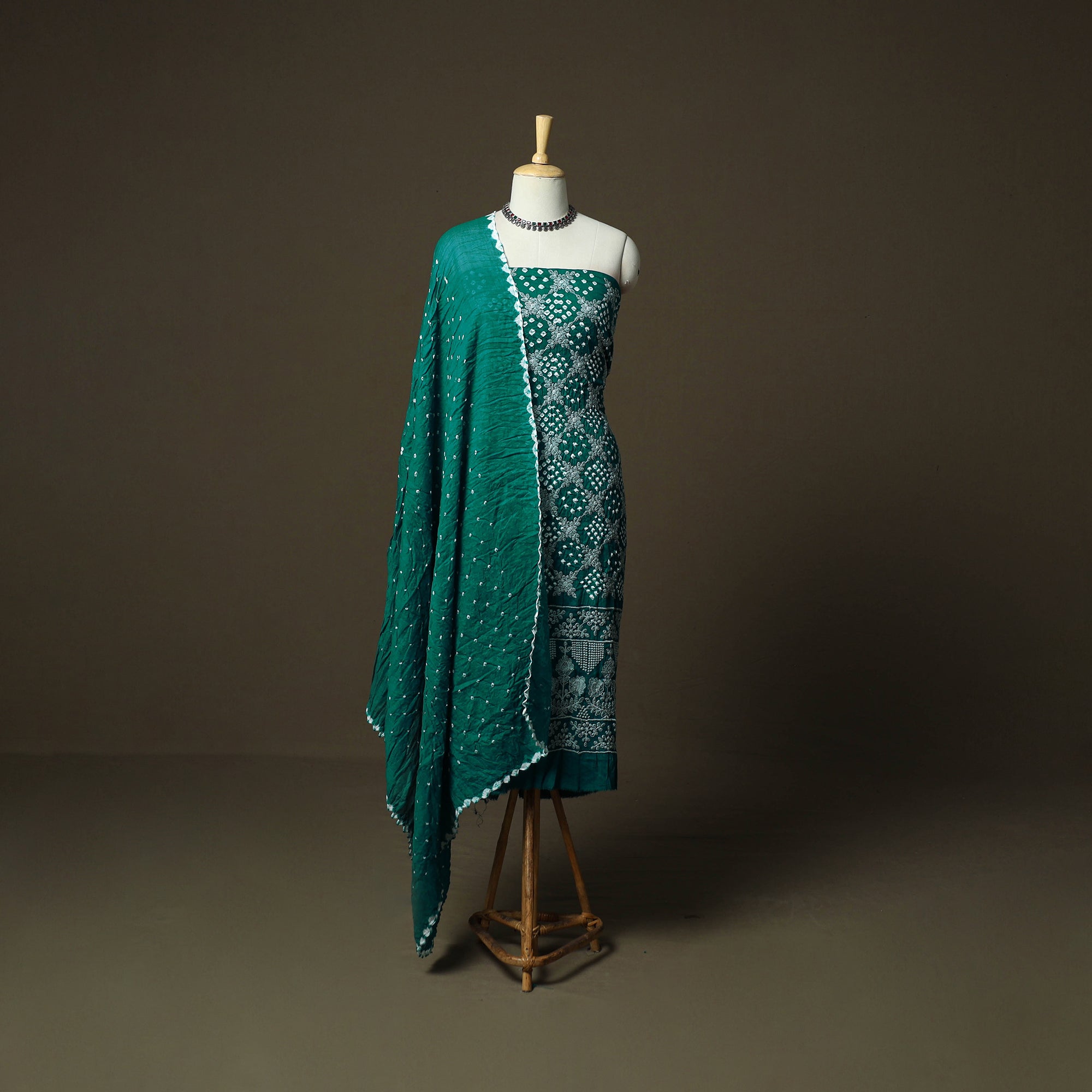 | Material | Green kutch tie-dye bandhani satin cotton 3pc unstitched dress material features intricate hand-tied and hand-dyed patterns. Created using the traditional Bandhani technique, this art form is over 5,000 years old and has been passed down through generations in Kutch. Skilled artisans carefully tie thousands of tiny knots to create stunning patterns, making every piece unique. The set includes embroidered kurta fabric, a matching bottom, and a dupatta, perfect for creating an elegant and timeless ethnic outfit. |