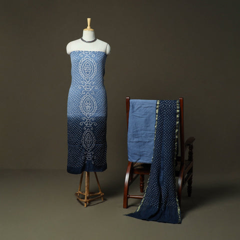 Blue kutch tie-dye heavy bandhani satin cotton 3pc unstitched dress material is features intricate hand-tied and hand-dyed patterns. Created using the traditional bandhani technique, this art form is over 5,000 years old and passed down through generations in Kutch. Skilled artisans carefully tie thousands of tiny knots to create beautiful patterns, making each piece unique. The set includes kurta fabric, matching bottom and dupatta, perfect for creating an elegant ethnic outfit.