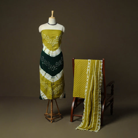 | Material | Green kutch tie-dye bandhani satin cotton 3pc unstitched dress material features intricate Bandhani patterns. Created using the traditional Bandhani technique, this art form is over 5,000 years old and has been passed down through generations in Kutch. Skilled artisans carefully tie thousands of tiny knots to form distinctive dotted patterns. The set includes kurta fabric with bandhani patterns, along with a bottom and dupatta highlighted with zari work, making it ideal for creating a graceful ethnic outfit. |