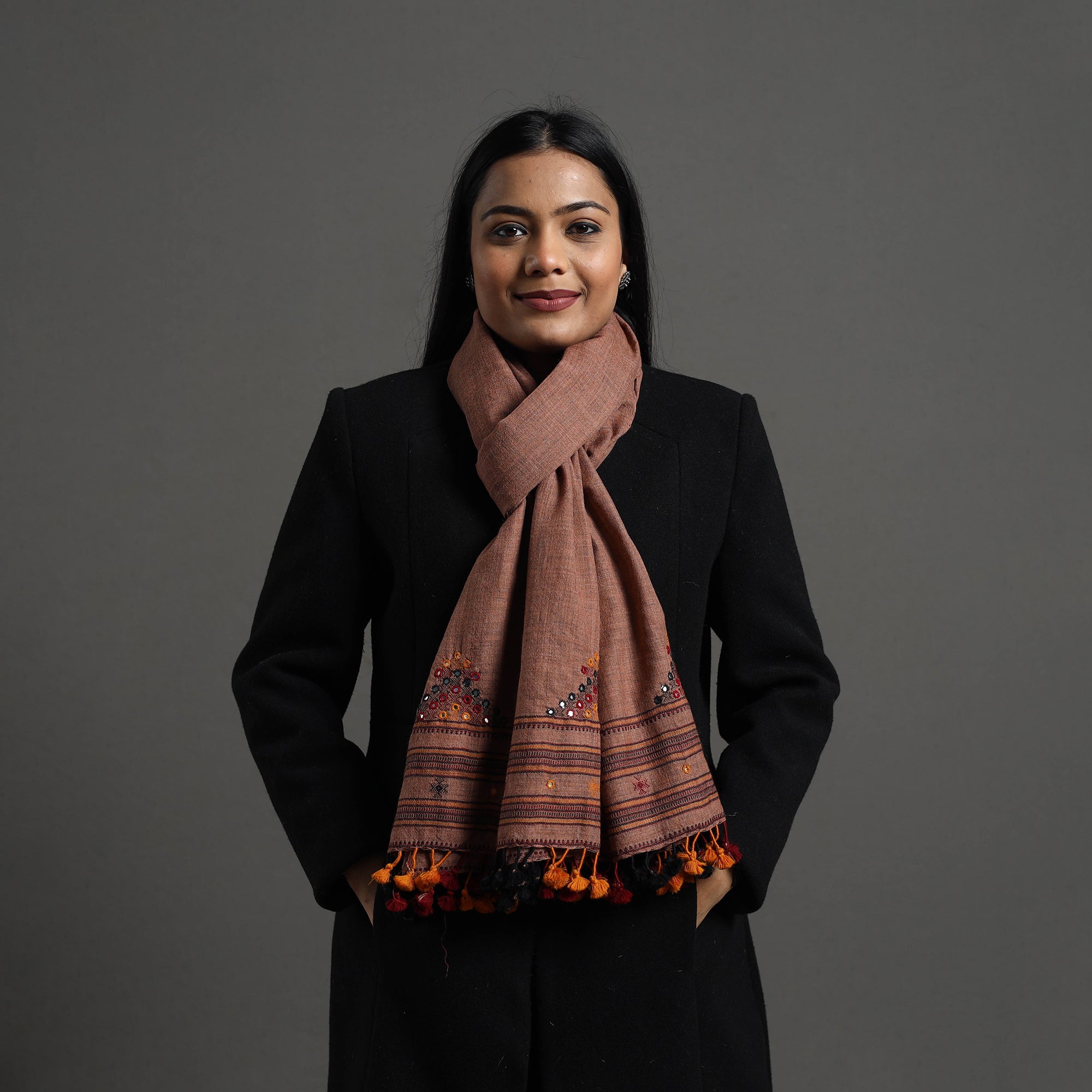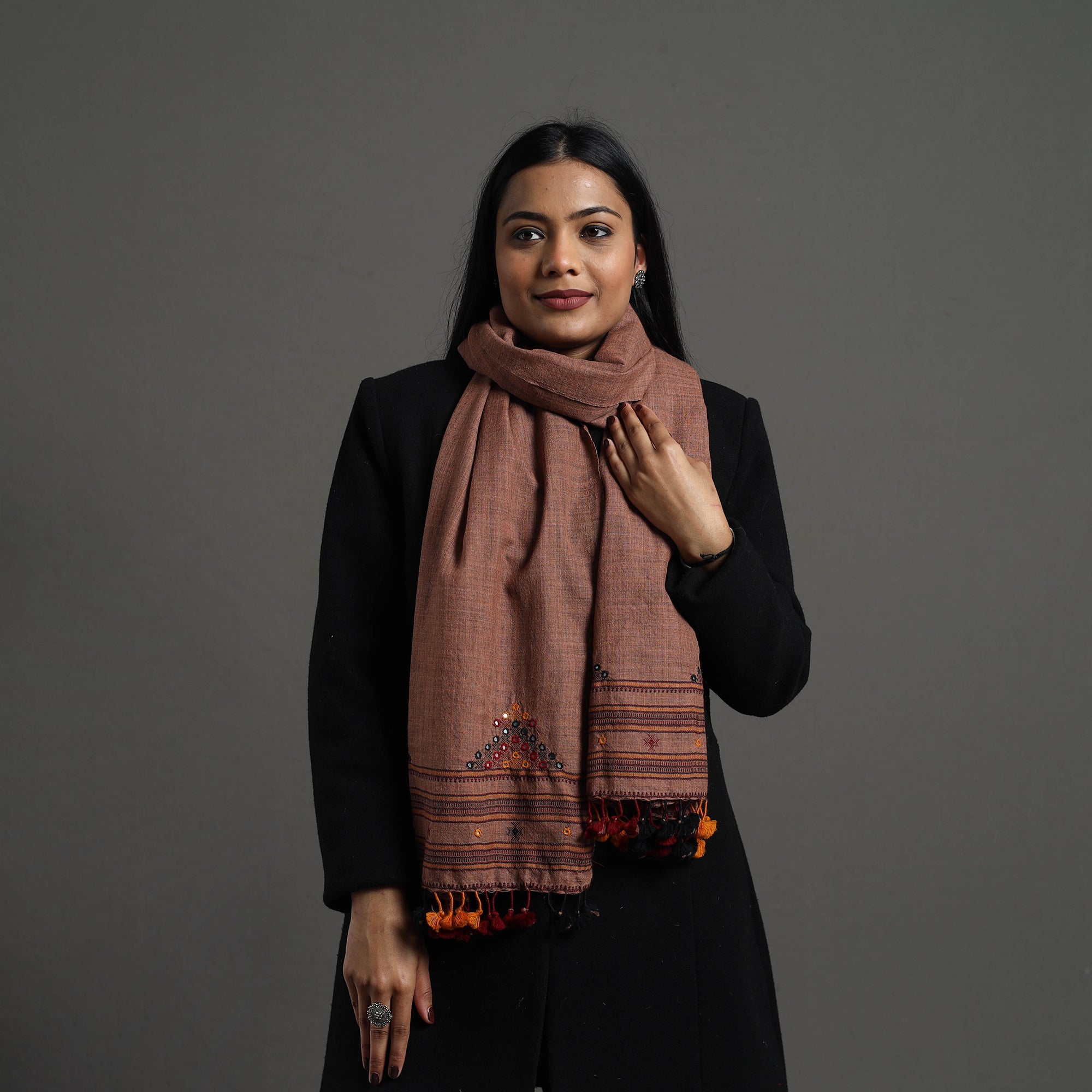 Handwoven brown traditional Kutch weaving handwoven merino woollen stole with devra mirror work made by craftsmen and women in kutch region of Gujarat. This stole is woven with traditional Kutchi motifs. Soft textured.