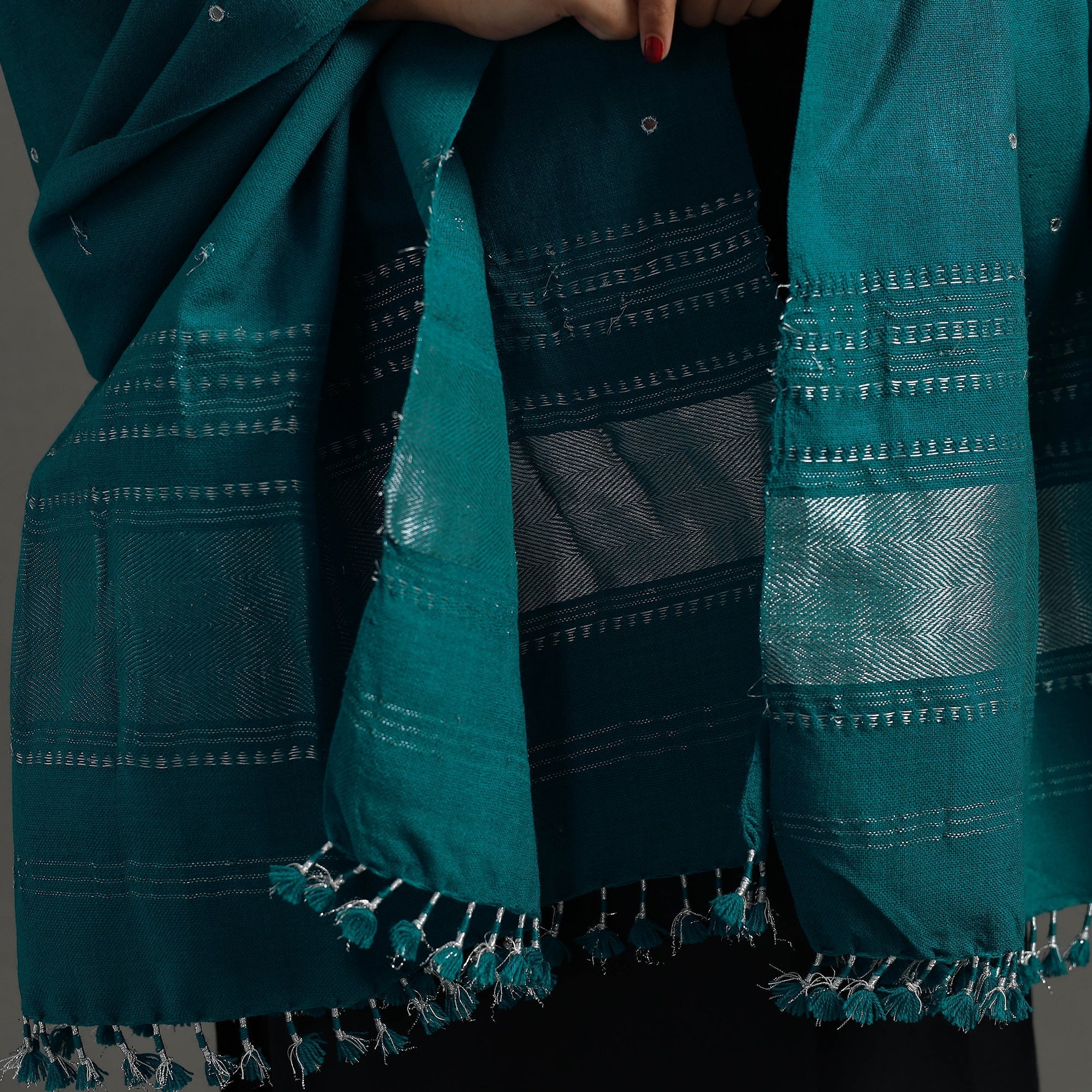 Kutch zari hand embroidery mirror work green woollen shawl. Crafted by artisans in Gujarat, this shawl features zari, mirror work and Kutchi weaving motifs. The acrylic wool ensures warmth and comfort