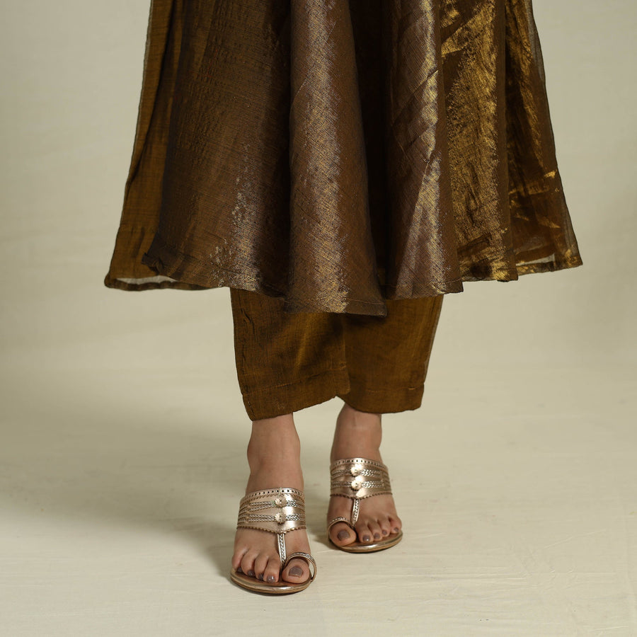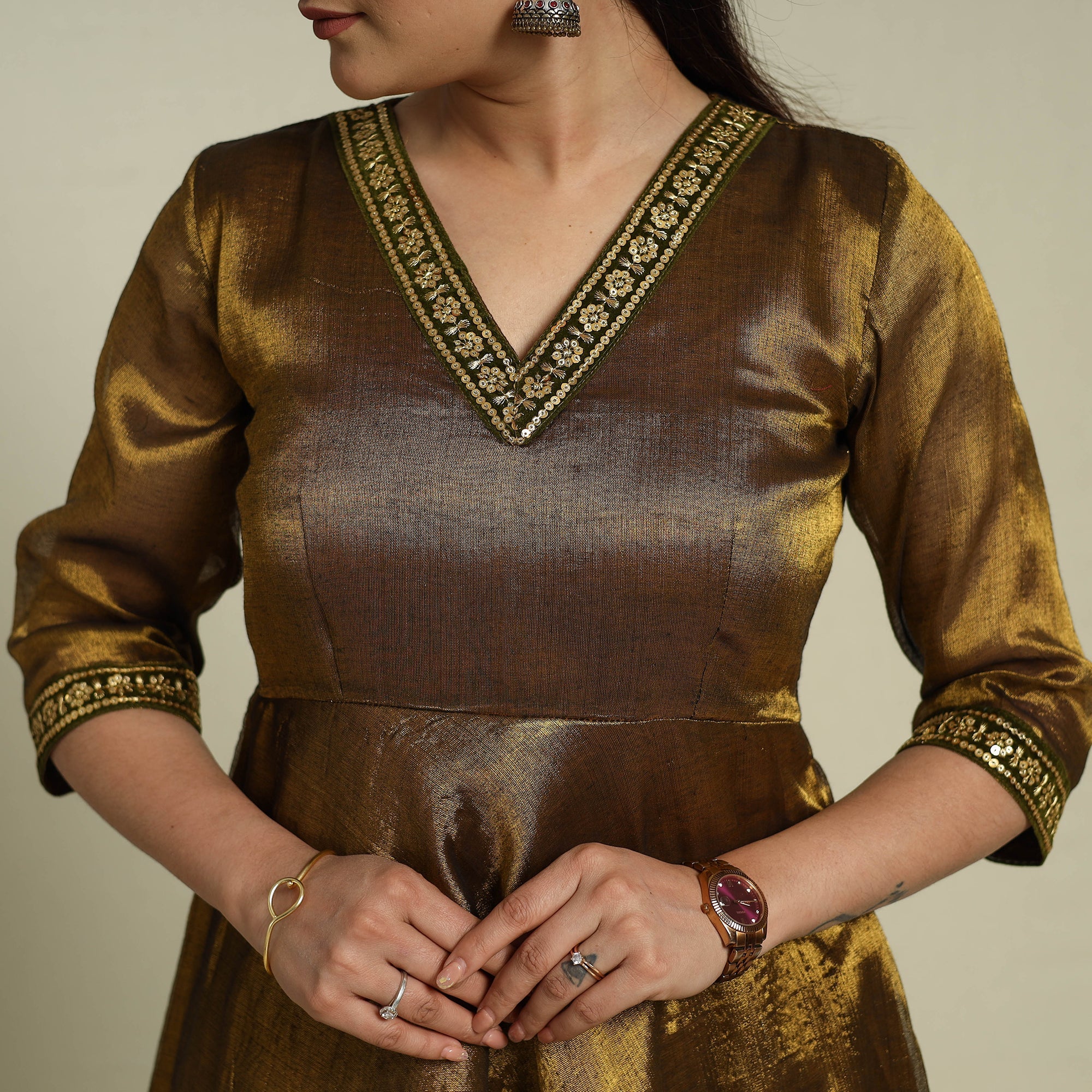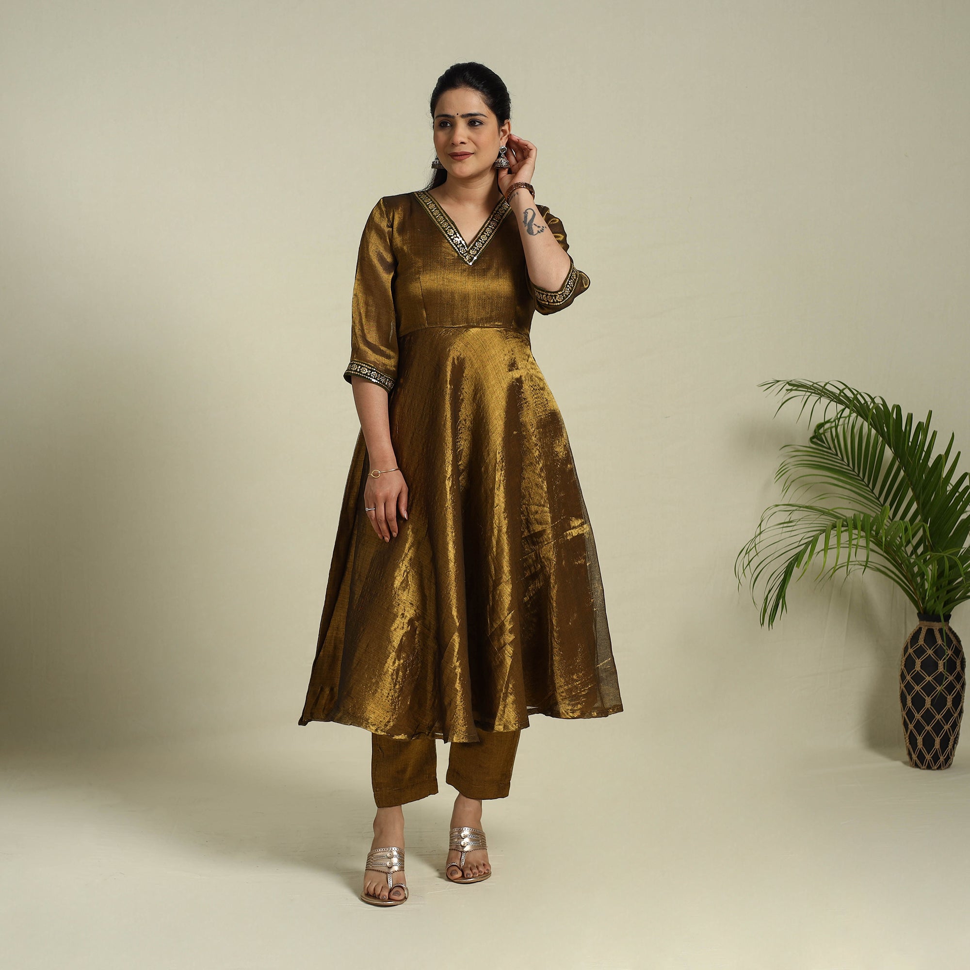 Experience effortless elegance with this fine cotton brown tissue zari plain Anarkali kurta set, adorned with delicate lacework for a touch of sophistication. Designed for all-day comfort and style, this ensemble effortlessly blends tradition with modern simplicity. The gracefully flared kurta is complemented by matching pants featuring an elasticated waist and two side pockets, ensuring both convenience and elegance. Ideal for both daily wear and festive occasions, this kurta set seamlessly blends traditional craftsmanship with modern simplicity.