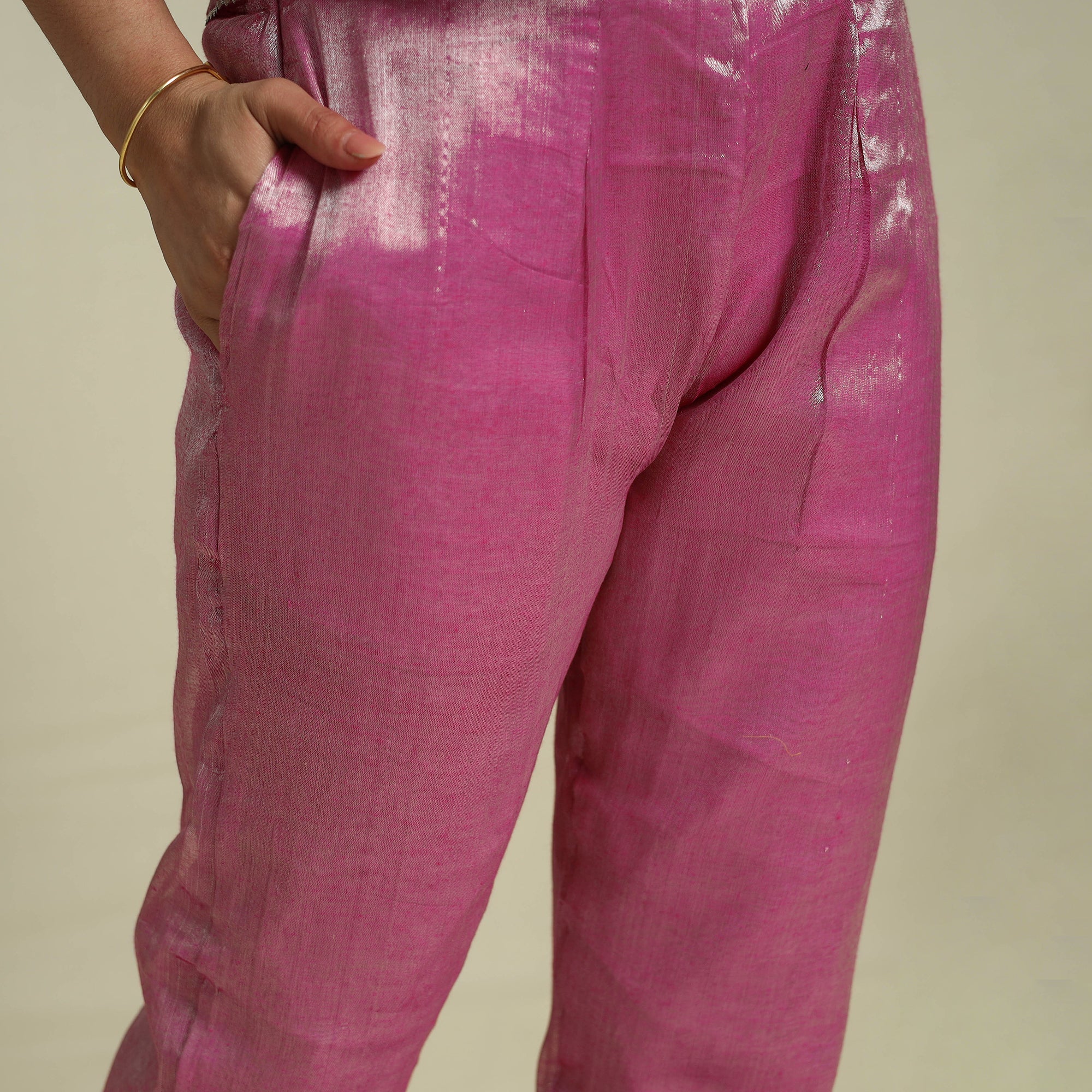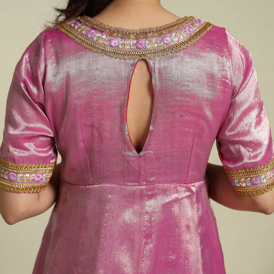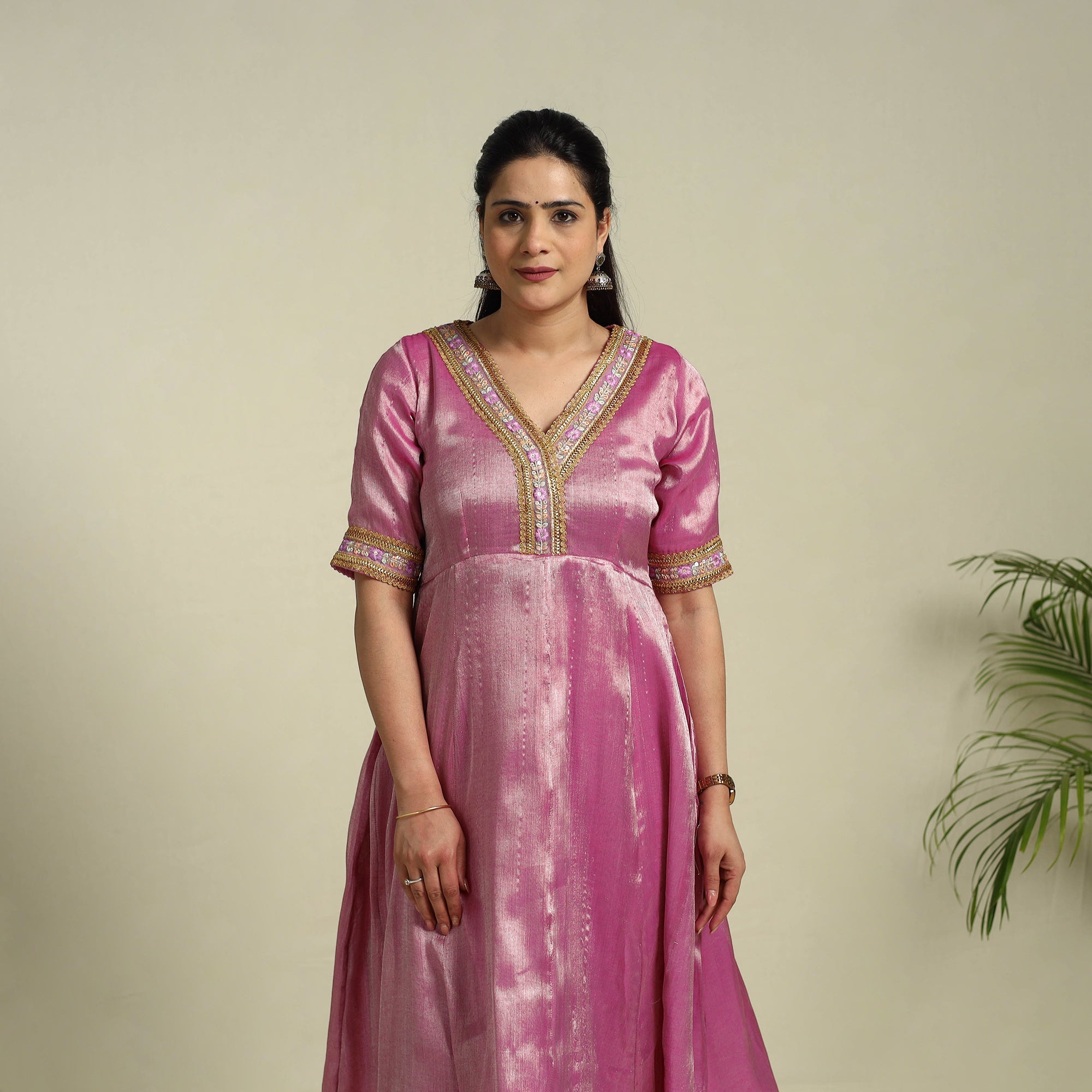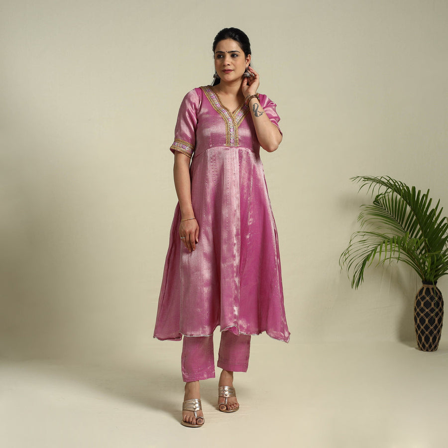 Experience effortless elegance with this fine cotton tissue zari pink plain Anarkali kurta set, adorned with delicate lacework for a touch of sophistication. Designed for all-day comfort and style, this ensemble effortlessly blends tradition with modern simplicity. The gracefully flared kurta is complemented by matching pants featuring an elasticated waist and two side pockets, ensuring both convenience and elegance. Ideal for both daily wear and festive occasions, this kurta set seamlessly blends traditional craftsmanship with modern simplicity.