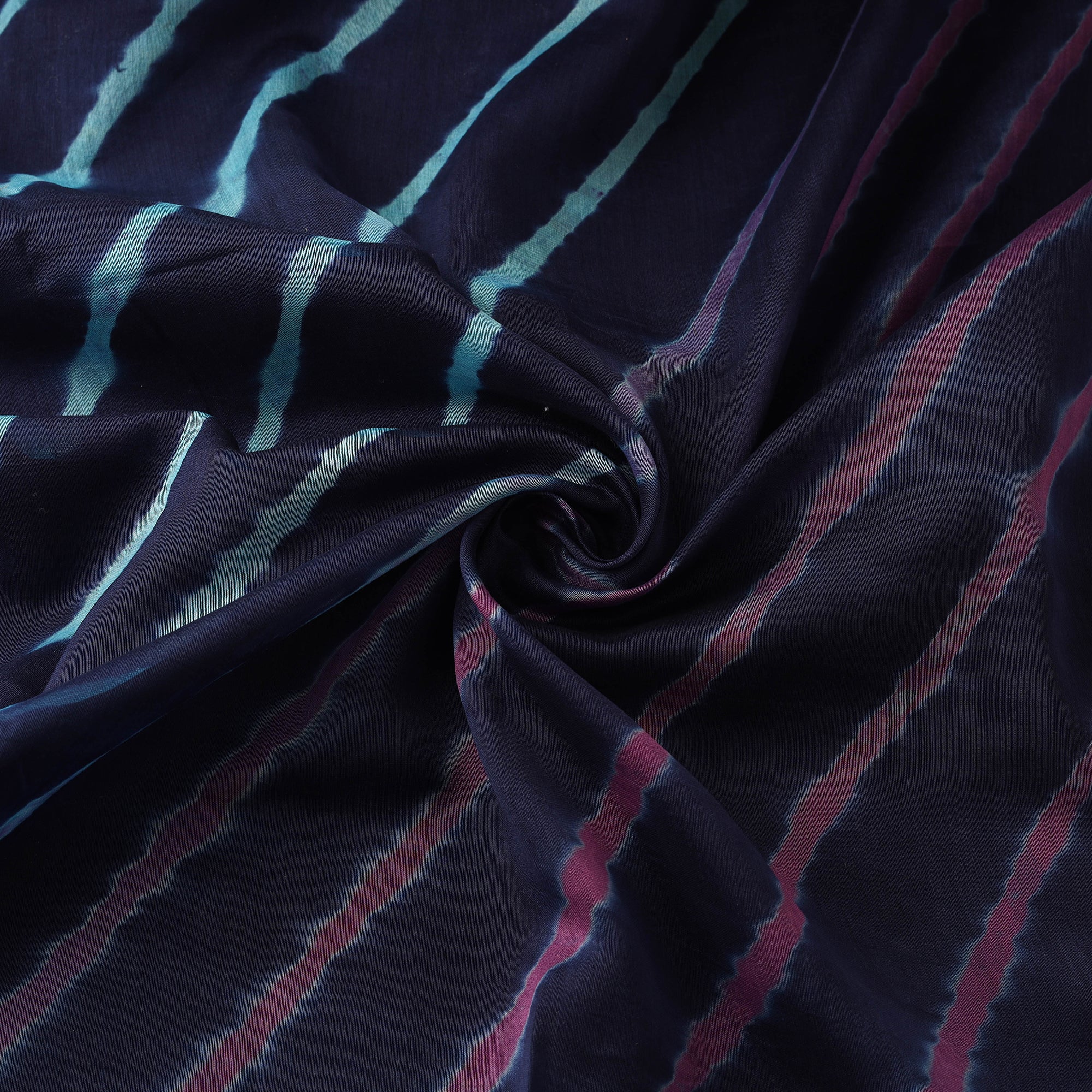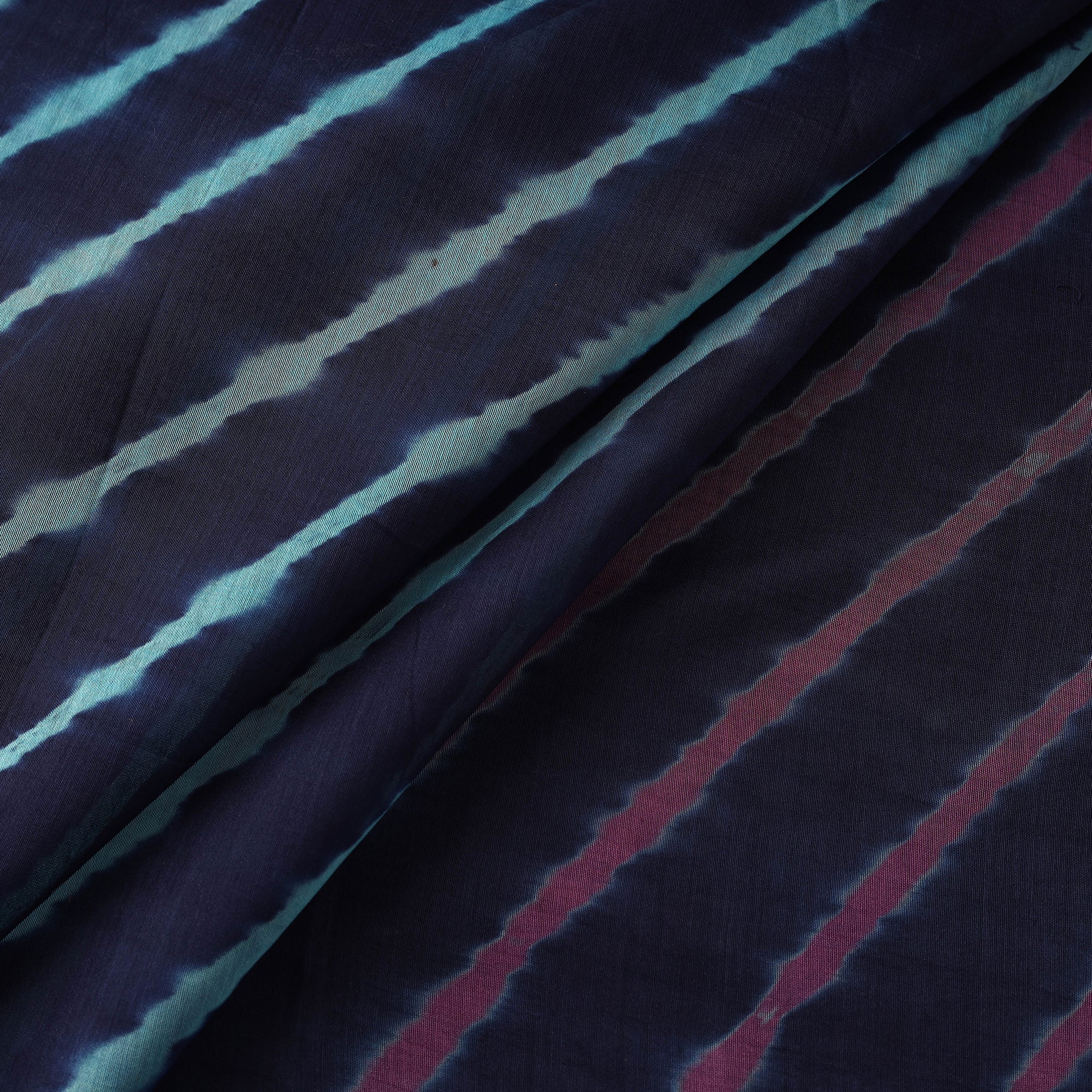 Leheriya tie-dye fabric, crafted by master artisan Adil Hussain, follows a centuries-old tradition from Rajasthan. The fabric is diagonally rolled, tightly tied and dyed to create its signature wave patterns. Made from a blend of chanderi silk and mercerised cotton, it has a light feel with a slight sheen. Each piece turns out slightly different due to the process. It can be used for sarees, dupattas, kurta sets, dress materials, as well as decor accents like curtains or soft furnishings.