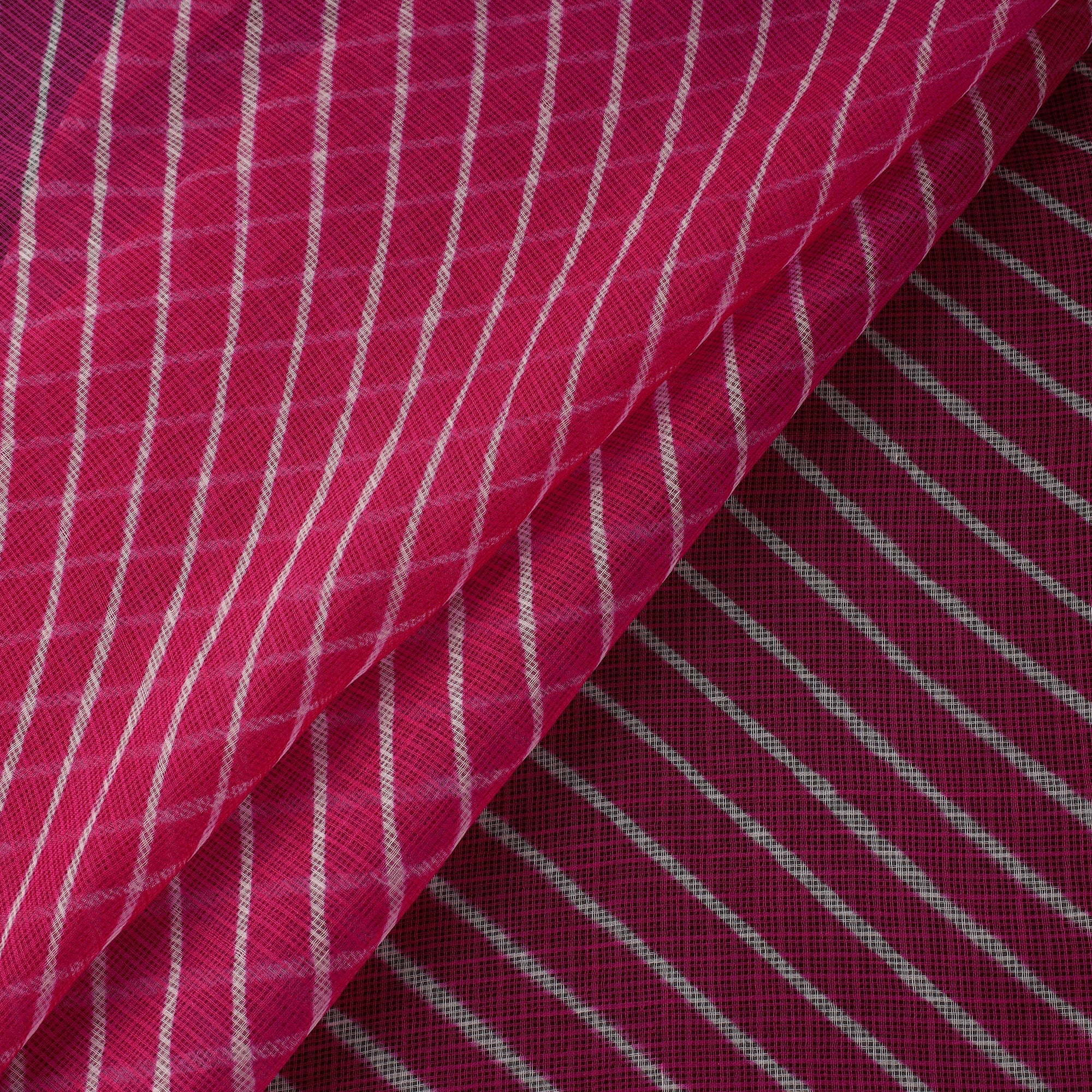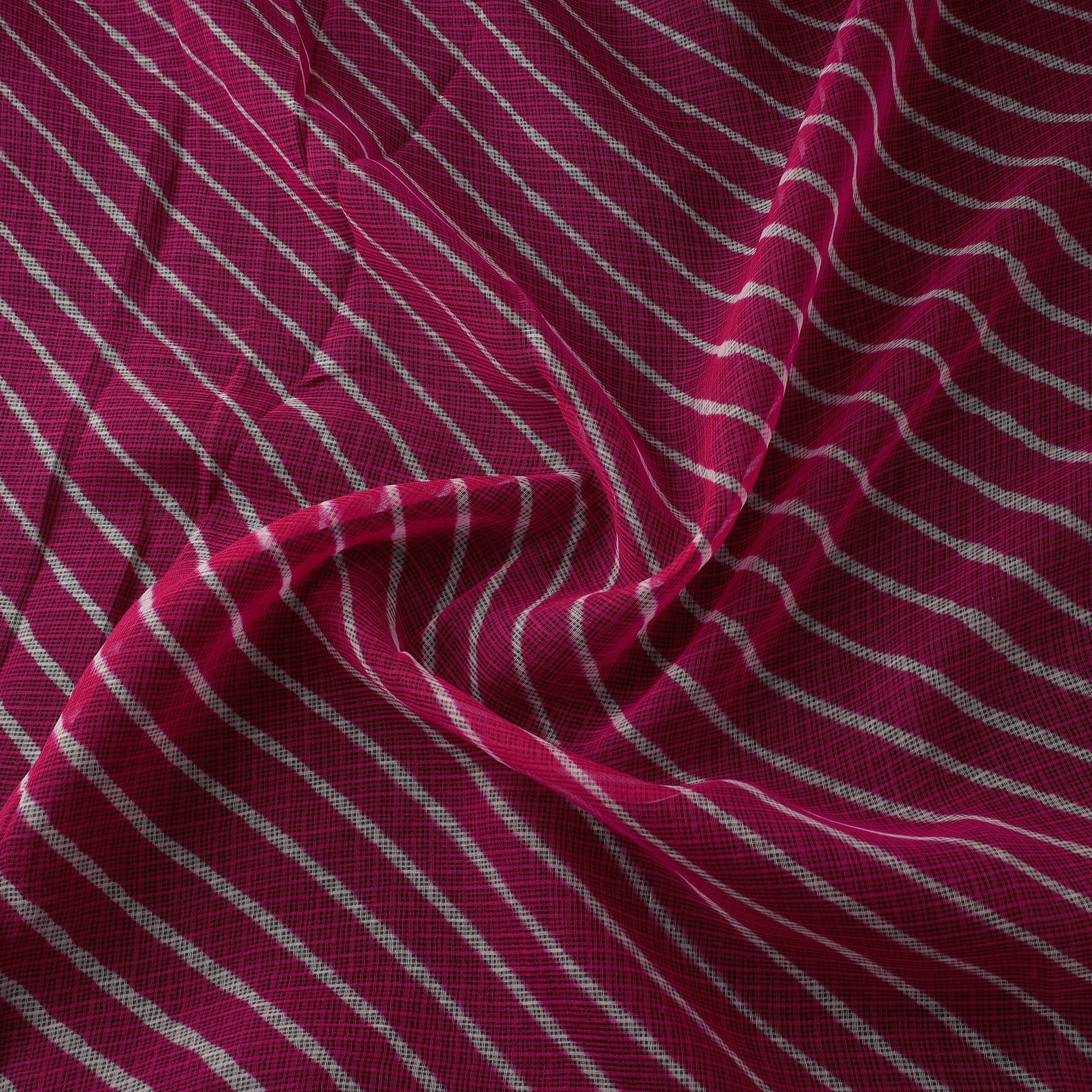 Leheriya tie-dye kota doria cotton fabric features designs inspired by natural wave (leher) patterns formed by the wind across the desert sands of western Rajasthan. These patterns are created using Rajasthan’s traditional tie & dye technique. Leheriya is a centuries-old dyeing tradition deeply rooted in the region’s cultural heritage, practiced by the artisan family of Badshah Miyan. Kota Doria is an age-old Indian textile produced in the Kota district of Rajasthan. The doria or threads are finely interwoven to create its characteristic check patterns. Its lightweight and slightly sheer texture give it an exquisite grace and elegance. Comfortable and breathable, it is ideal for kurtas, dupattas, dresses, sarees and decor, making it a versatile choice for both everyday and occasion styling.